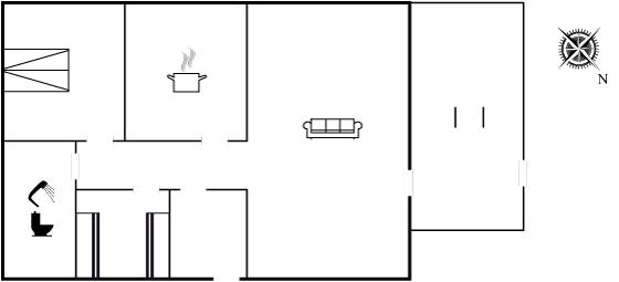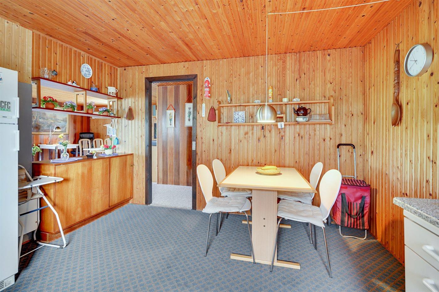 Køkkenet er udstyret med 1 køleskab. Der er 4 elkogeplader, varmluftovn, mikrobølgeovn samt opvaskemaskine.