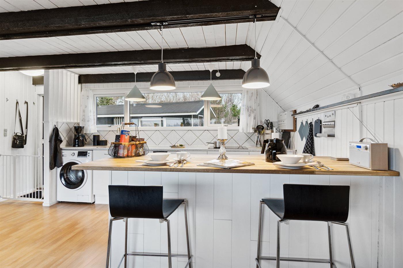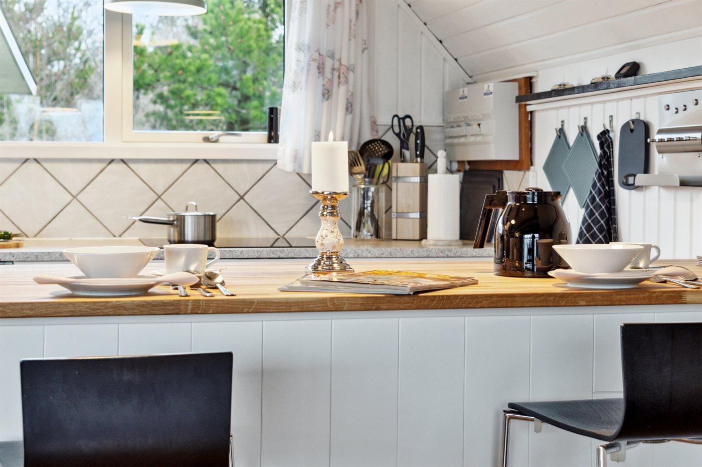 Køkkenet er udstyret med 1 køleskab. Der er 4 keramiske kogeplader, varmluftovn, mikrobølgeovn samt opvaskemaskine.