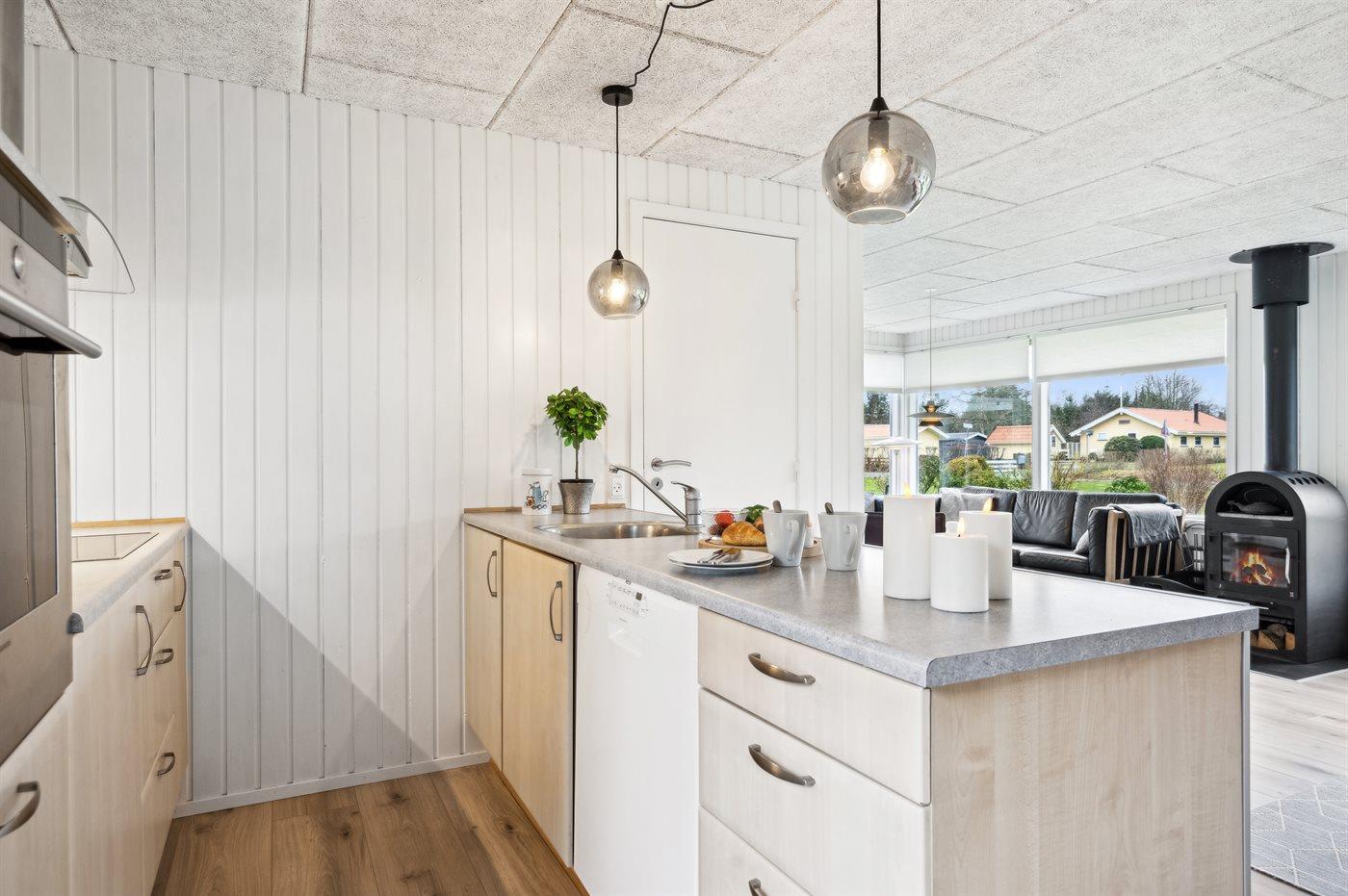 Køkkenet er udstyret med 1 køleskab. Der er 4 keramiske kogeplader, varmluftovn, mikrobølgeovn samt opvaskemaskine.