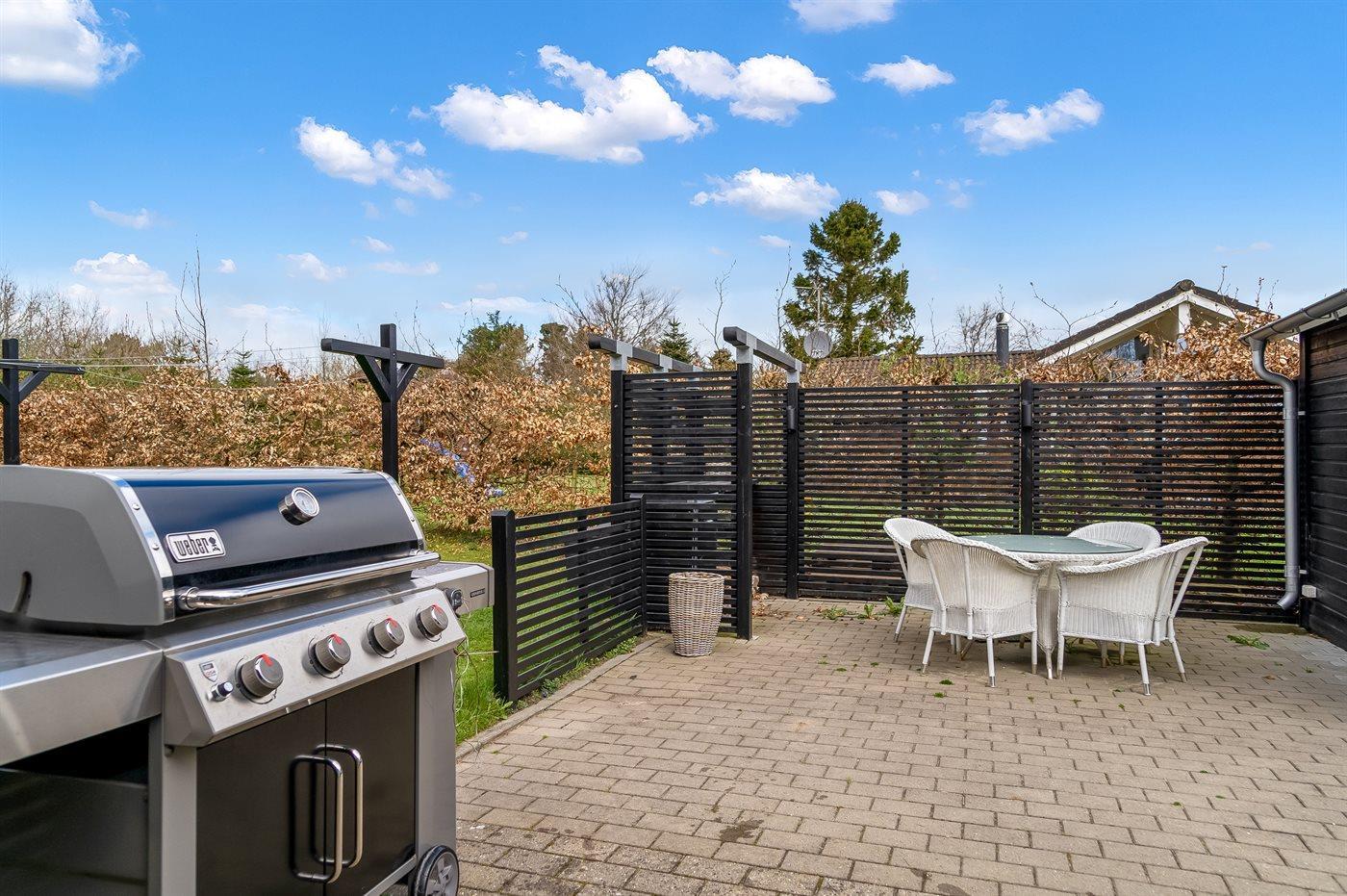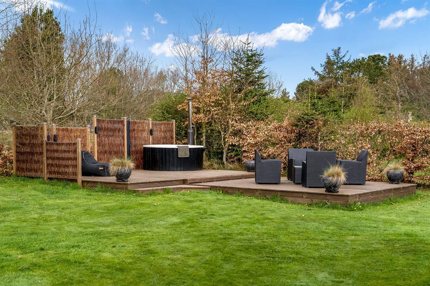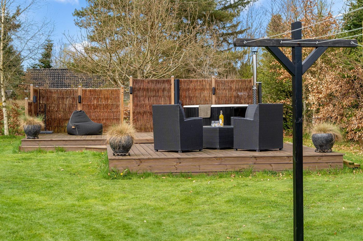 Udendørs er der to terrasser, så I kan nyde naturen fra forskellige vinkler. Den største terrasse har en grill og en overdækket sektion på 13 m², ideel til hyggelige måltider i det fri. Få meter fra huset ligger en ekstra terrasse med et vildmarksbad og en skøn krog, perfekt til romanlæsning i solen. Den store, solrige græsplæne inviterer til leg og aktiviteter for både børn og voksne.