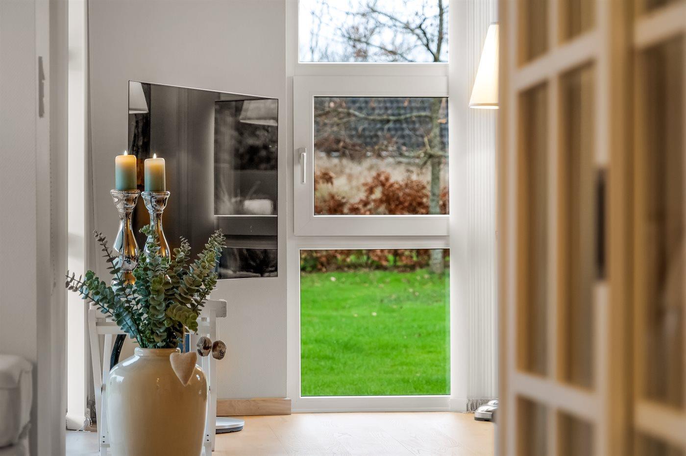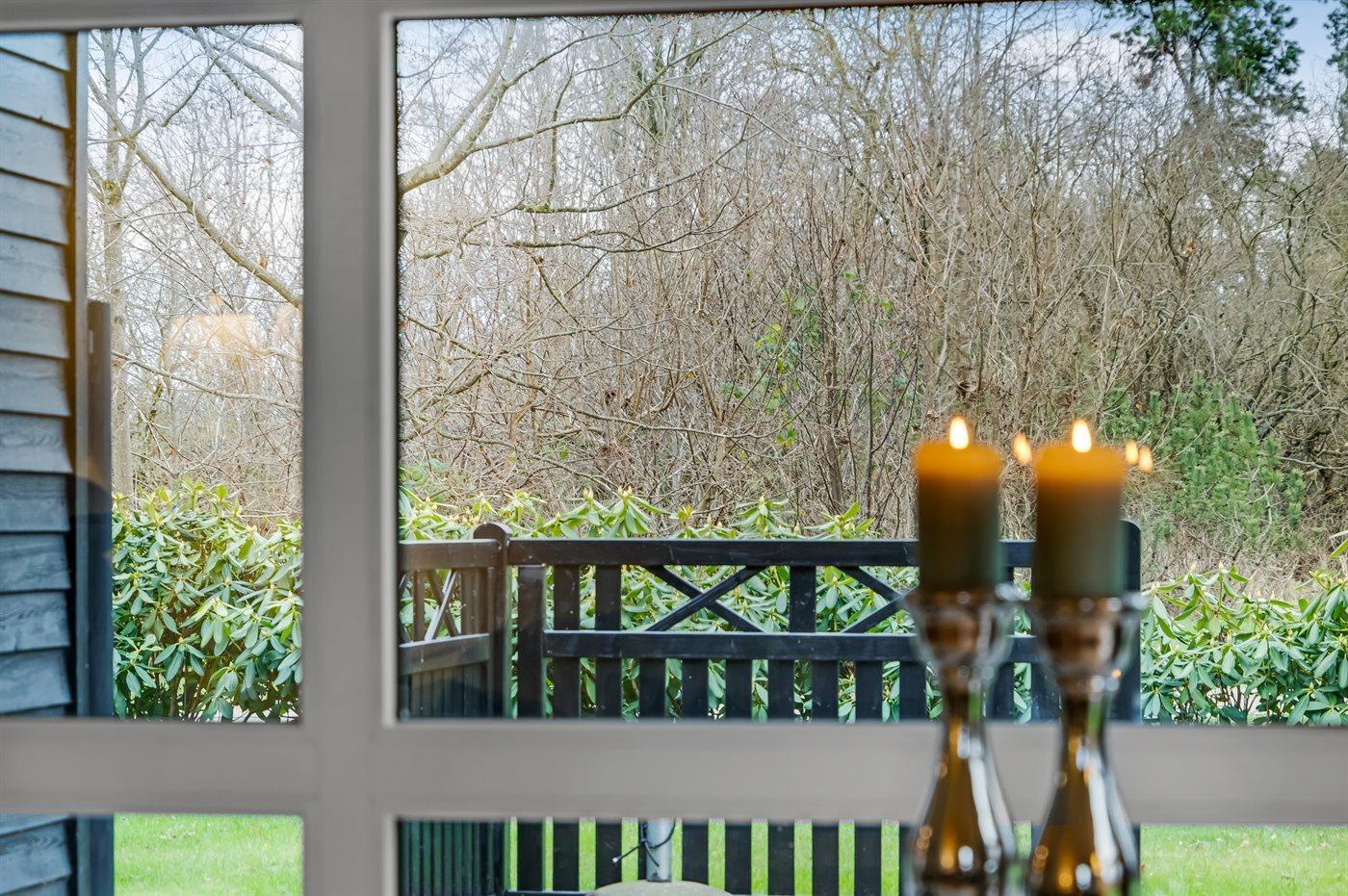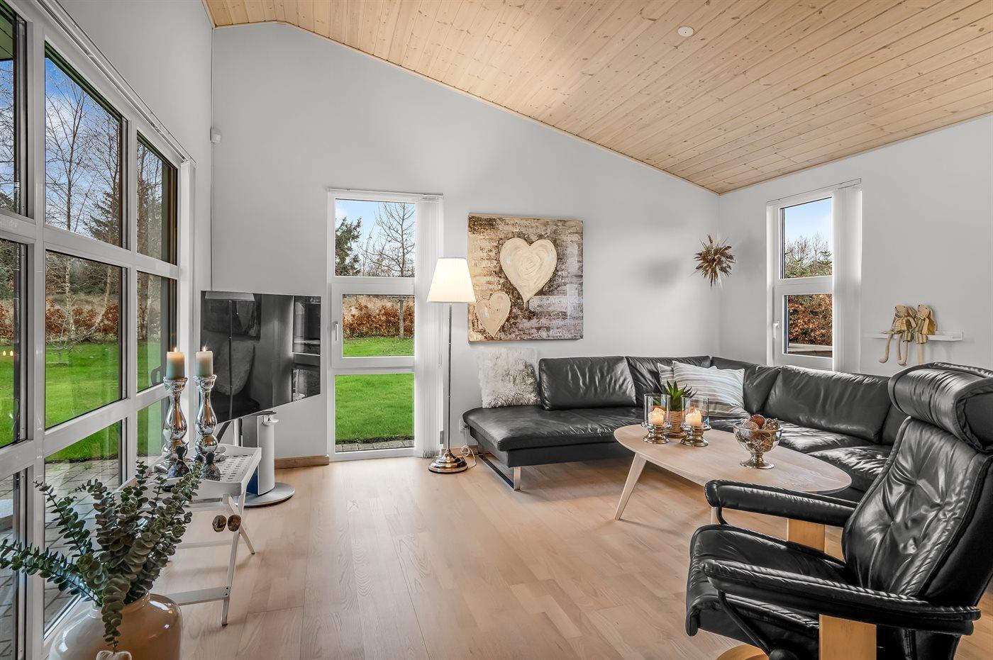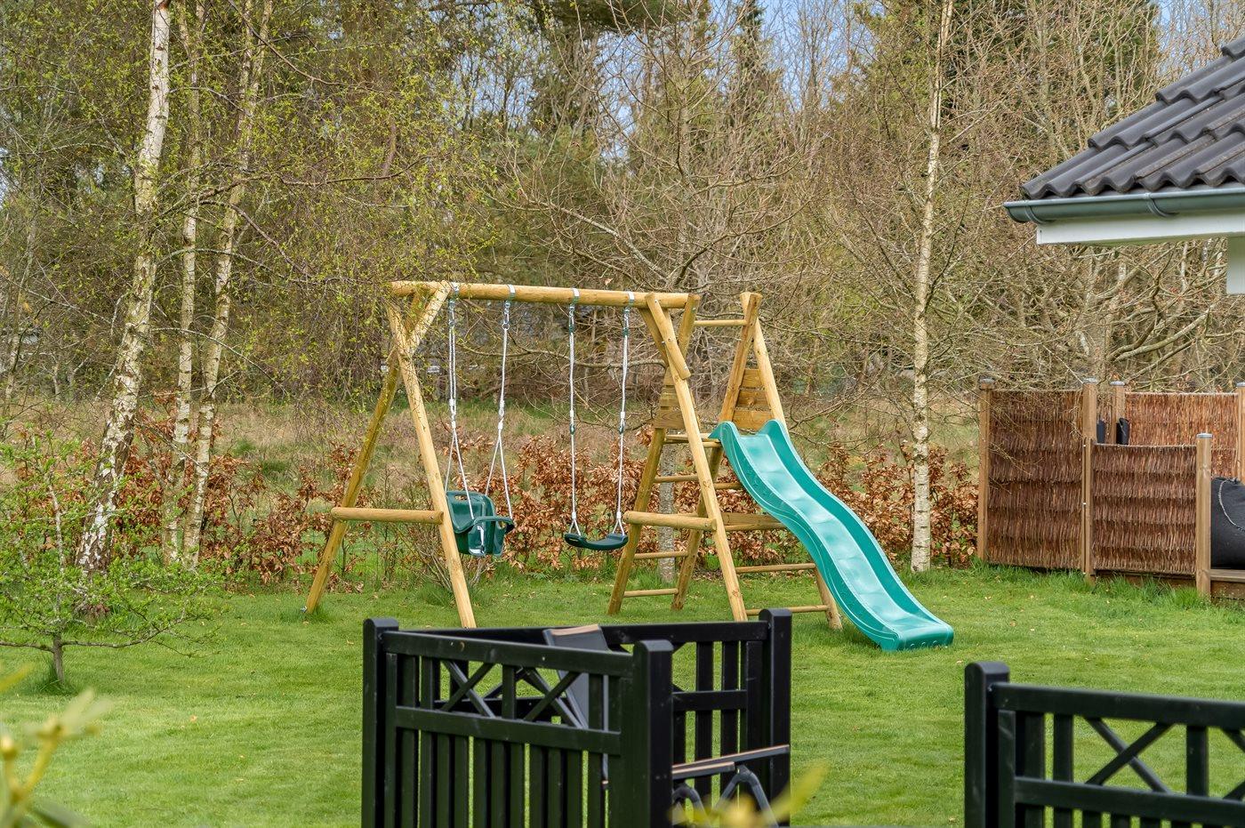 Udendørs er der to terrasser, så I kan nyde naturen fra forskellige vinkler. Den største terrasse har en grill og en overdækket sektion på 13 m², ideel til hyggelige måltider i det fri. Få meter fra huset ligger en ekstra terrasse med et vildmarksbad og en skøn krog, perfekt til romanlæsning i solen. Den store, solrige græsplæne inviterer til leg og aktiviteter for både børn og voksne.