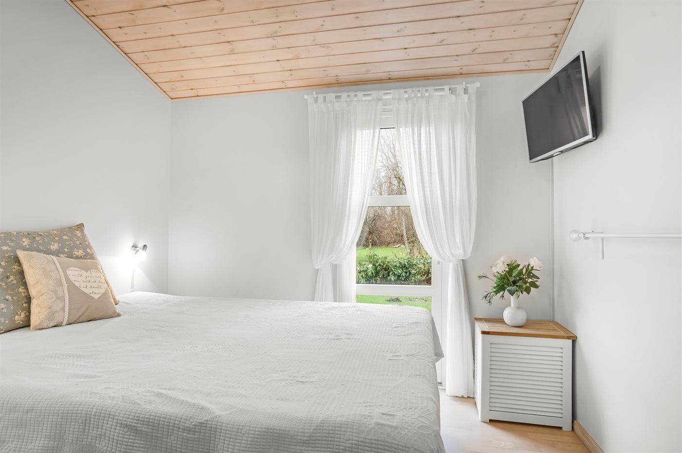 Huset har 3 soveværelser: 2 værelser med dobbeltsenge og et tredje værelse med en køjeseng og en ekstra “træk-ud” seng, så der i alt er 3 sovepladser i værelset. Badeværelset er indrettet med bruseniche, spabad til to personer, vaskemaskine, tørretumbler og gulvvarme for ekstra komfort.