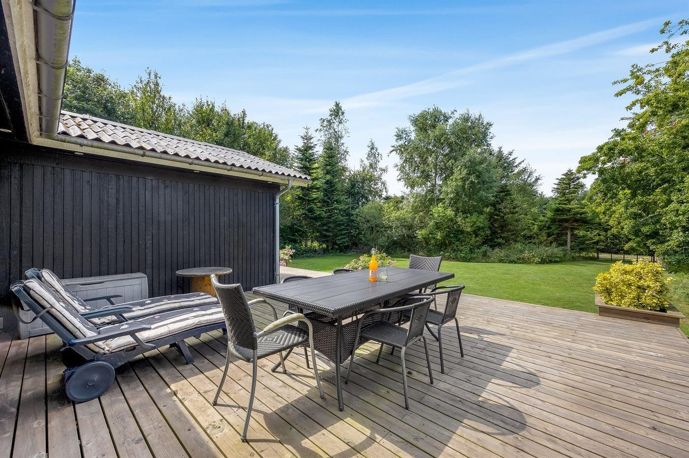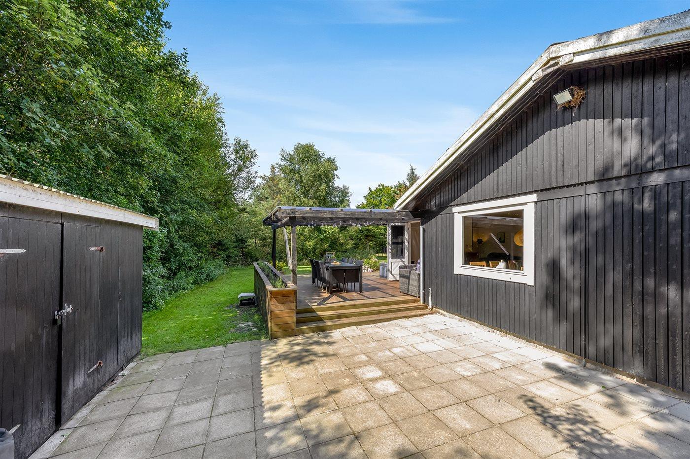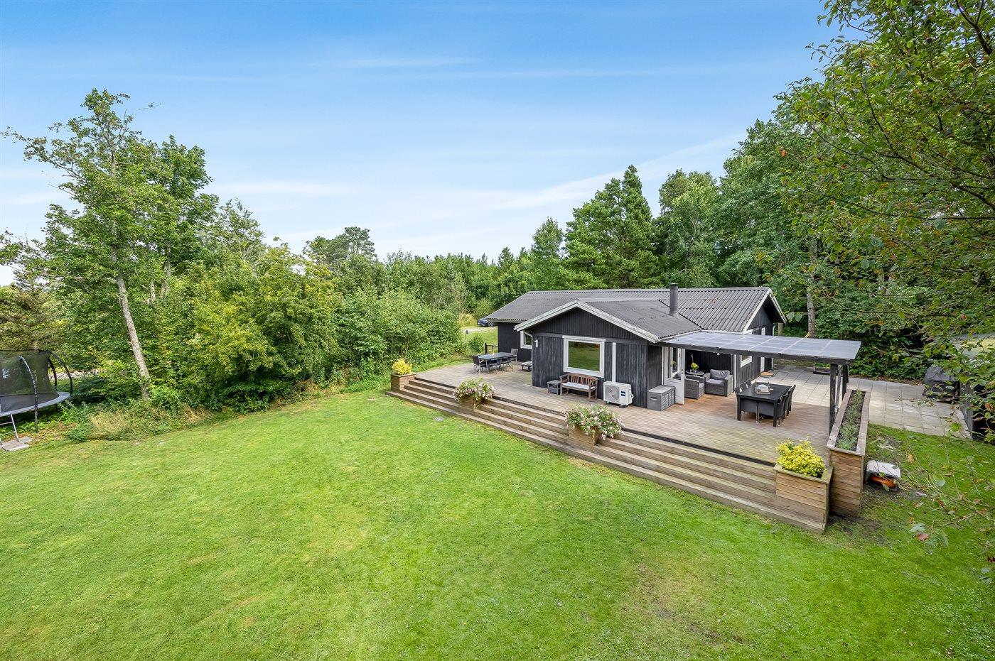 Ferieboligen er beliggende på en 1180 m² stor naturgrund. Grunden er indhegnet. Der er 1300 m til havet. Der er 6700 m til fjorden. Nærmeste forretning er beliggende i en afstand af 1300 m. Der er en golfbane i en afstand af 5500 m. Til ferieboligen hører åbent terrasseareal. Desuden er der overdækket terrasse. Gynge. Sandkasse. Trampolin. Legetårn. Rutchebane. Grill til rådighed. Der er installeret stik til opladning af elbil. Type 2 stik. Med 11 kW ladeeffekt. Parkering ved ferieboligen.