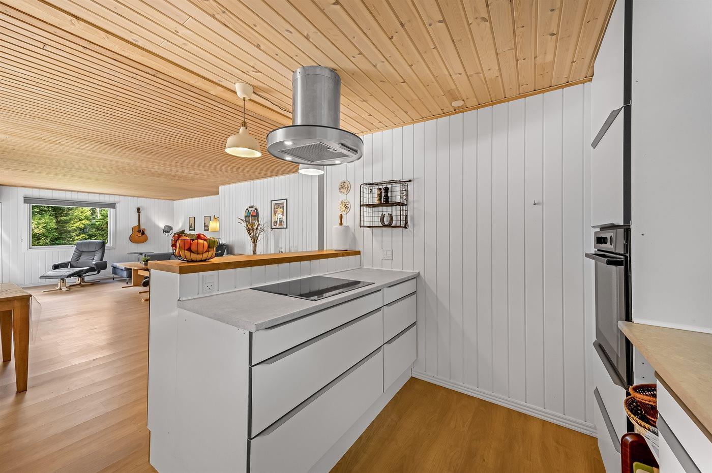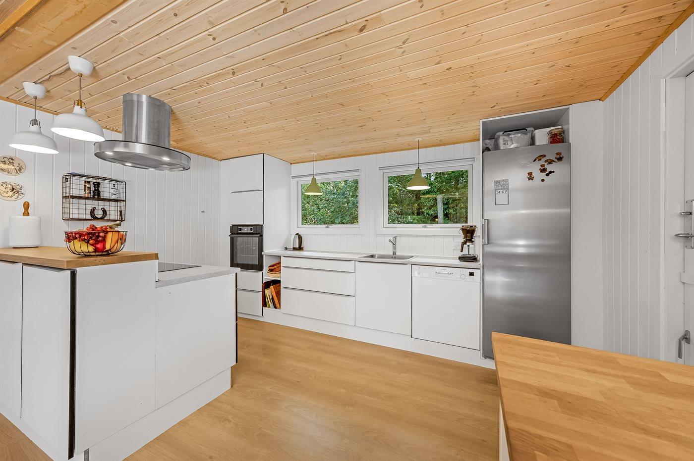 Køkkenet er udstyret med 1 køleskab. Der er 4 keramiske kogeplader, varmluftovn, mikrobølgeovn samt opvaskemaskine.