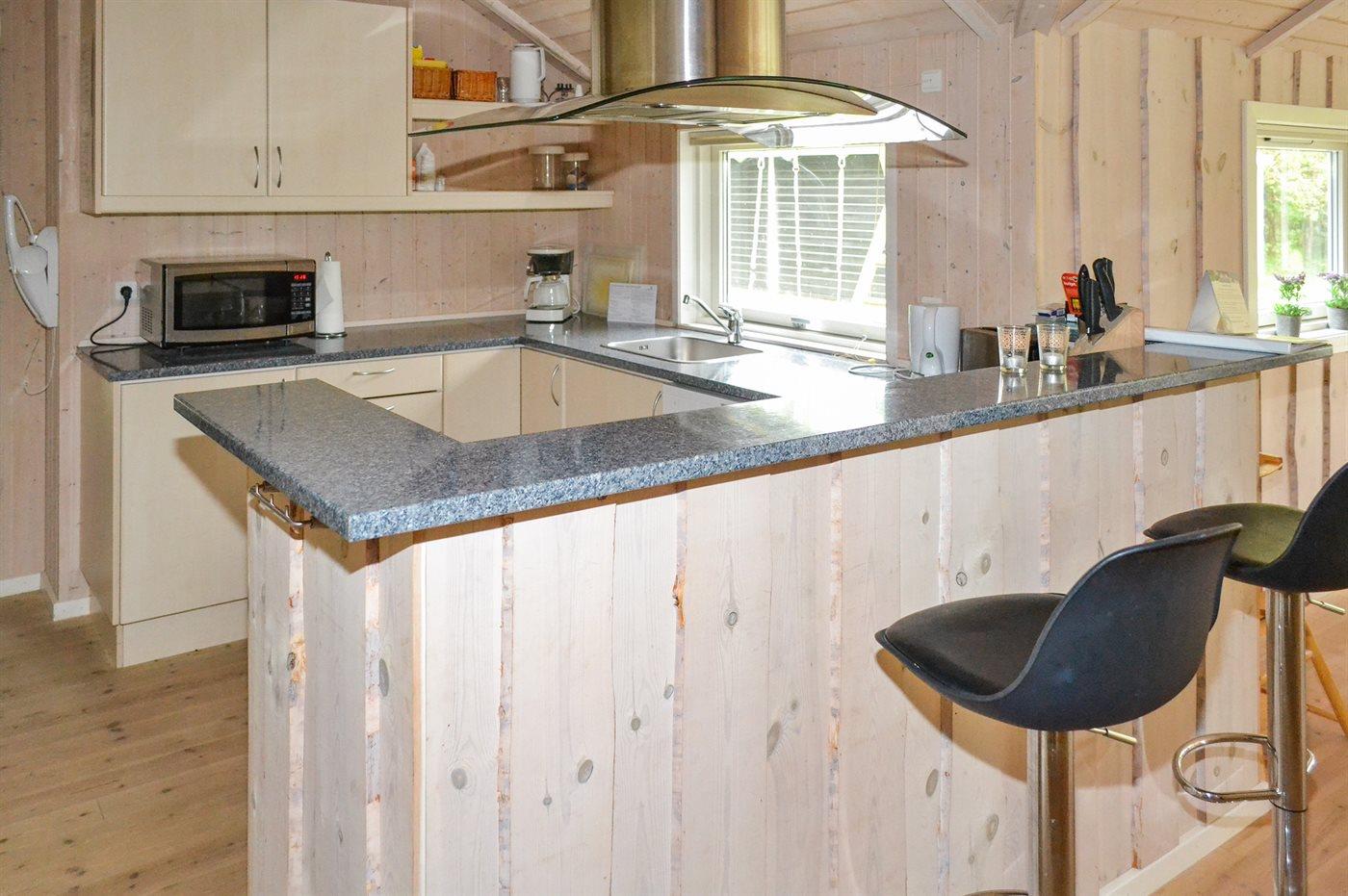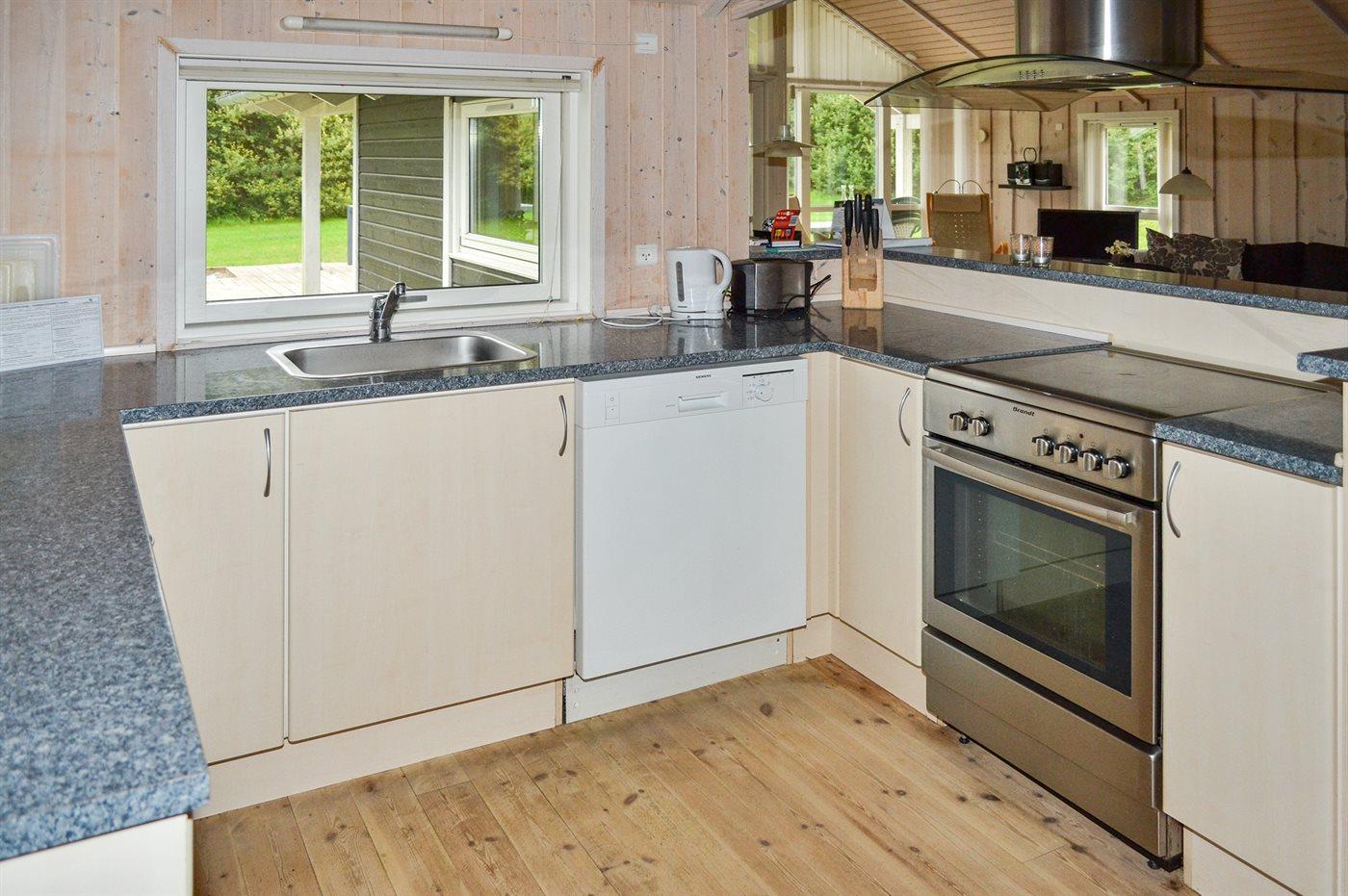Køkkenet er udstyret med 1 køleskab. Der er 4 keramiske kogeplader, varmluftovn, mikrobølgeovn samt opvaskemaskine.