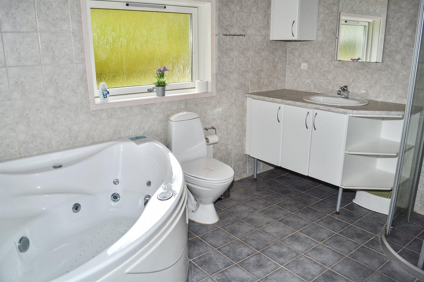 Der er 2 badeværelser med bruseniche og 2 toiletter. Der er gulvvarme på 2 badeværelser. I saunaen er der mulighed for afslapning.