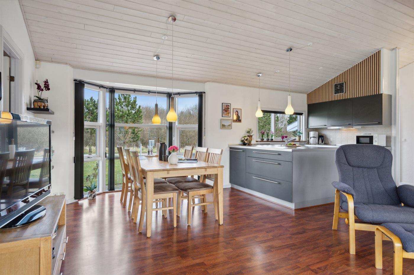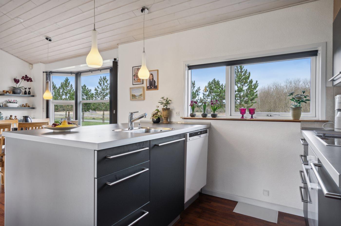 Køkkenet er udstyret med 1 køleskab. Der er 4 keramiske kogeplader, varmluftovn, mikrobølgeovn samt opvaskemaskine.