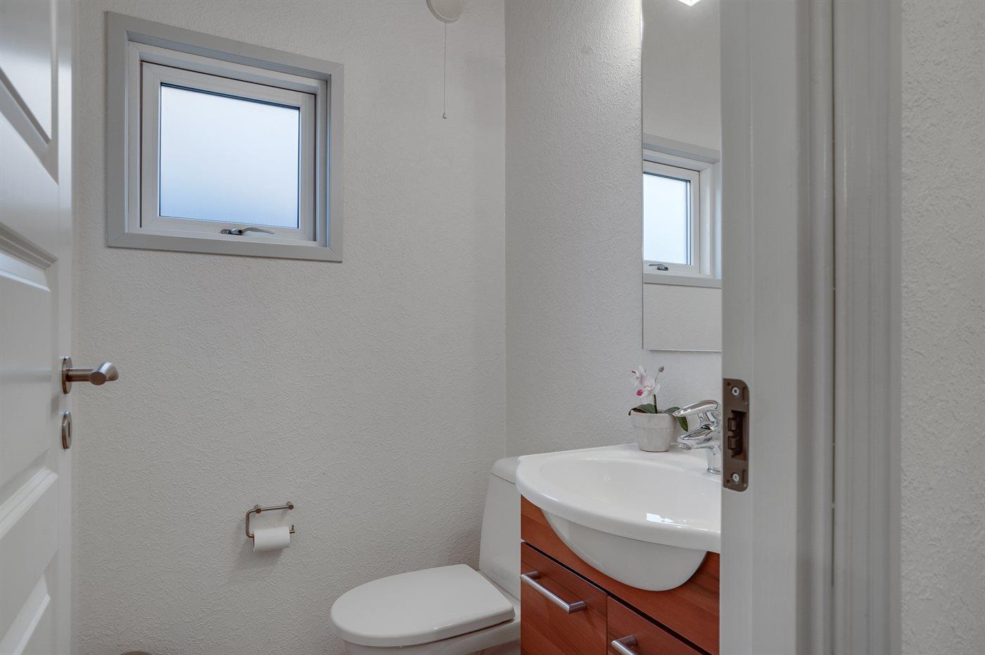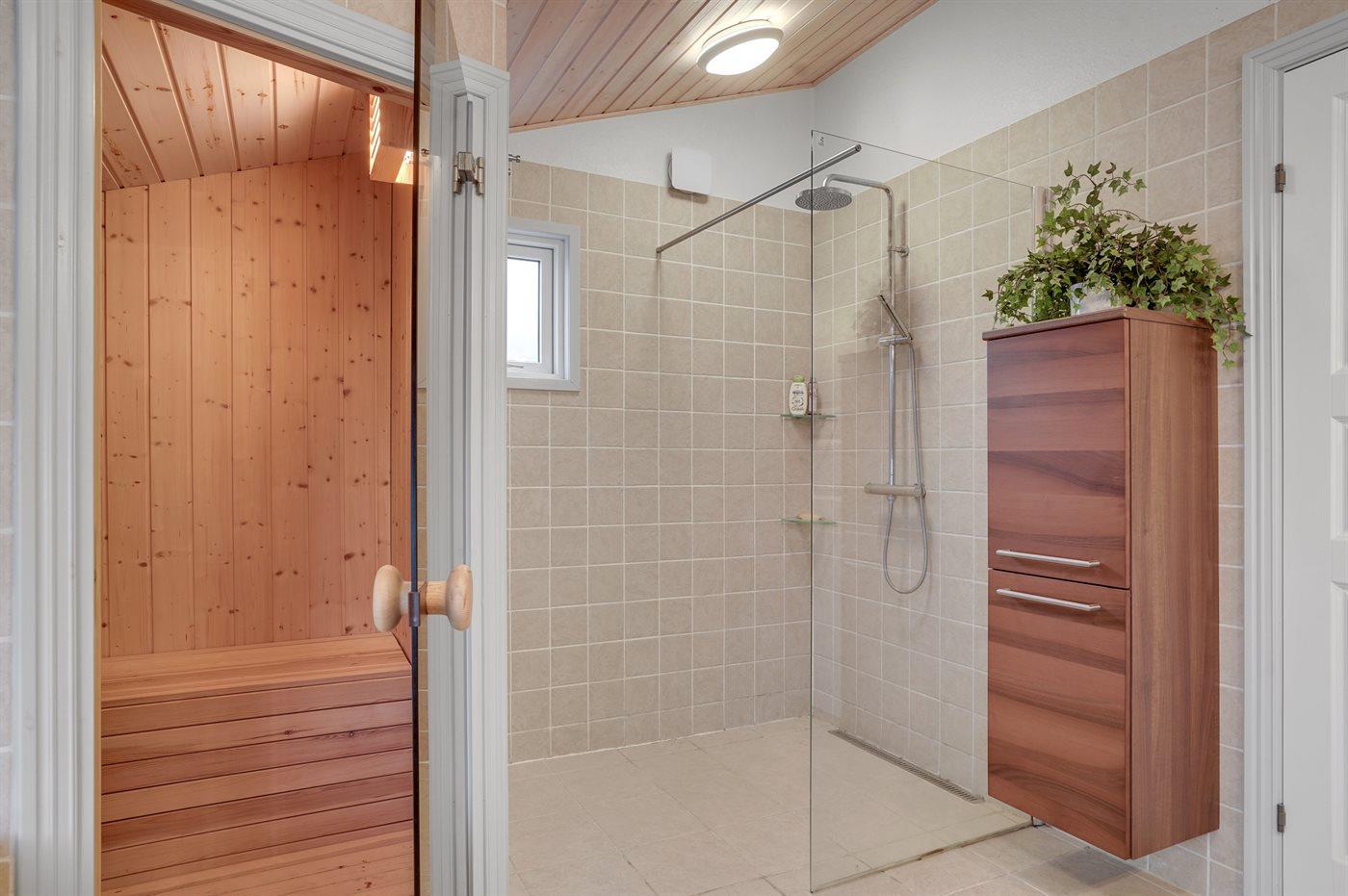 Der er 1 badeværelse med gulvvarme, bruseniche og toilet. Desuden findes der 1 gæstetoilet ligeledes med gulvvarme.