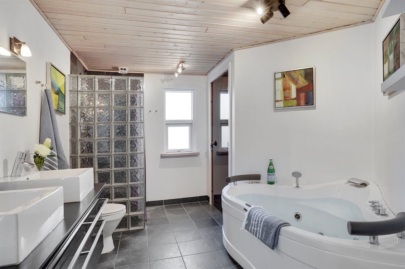 Der er 1 badeværelse med bruseniche og 1 toilet.. Der er gulvvarme på 1 badeværelse. I saunaen er der mulighed for afslapning.