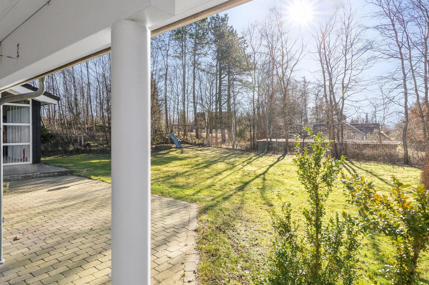 Flotte terrasseområder rundt om huset, hvor både morgen- og aftensolen kan nydes. Der er gode havemøbler, solvogne,