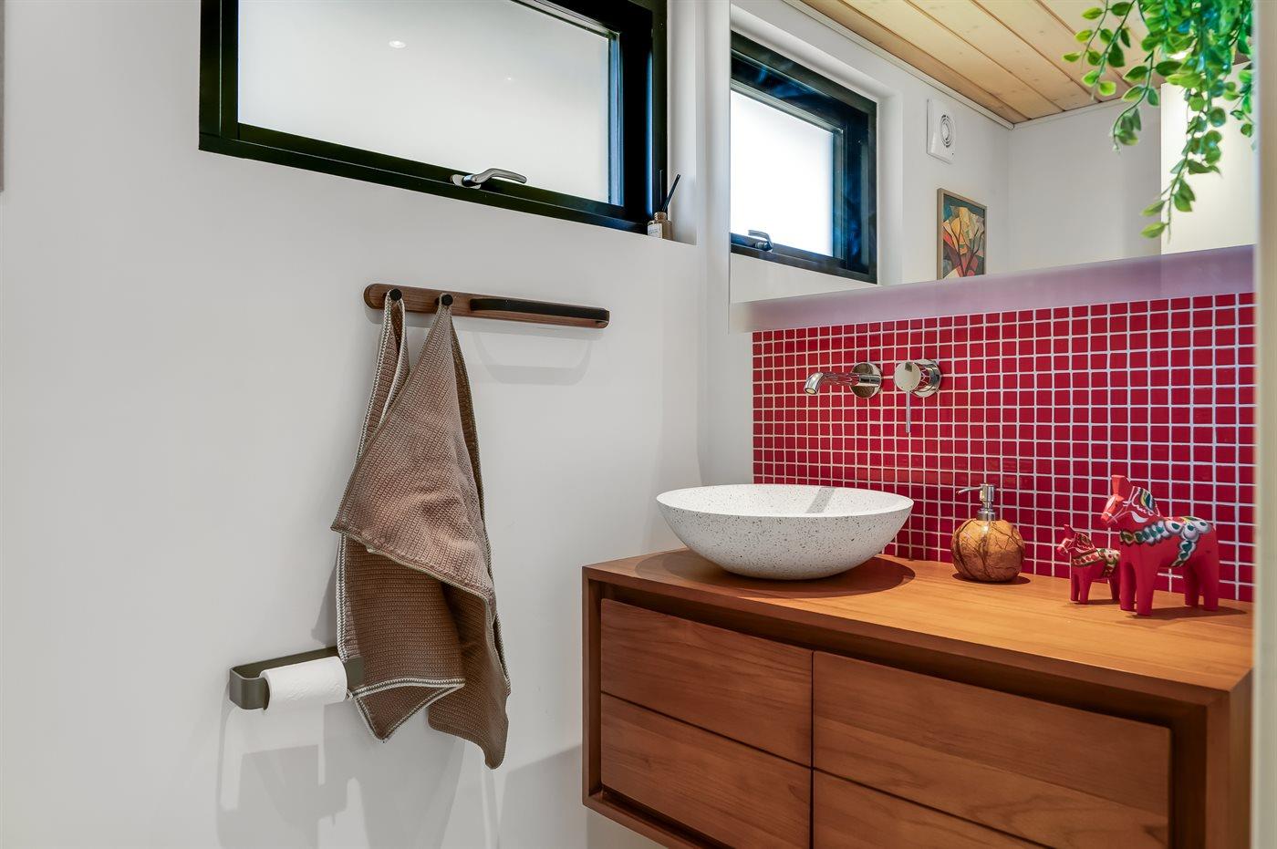 Der er 1 badeværelse med gulvvarme, bruseniche og 1 toilet samt 1 gæstetoilet ligeledes med gulvvarme.