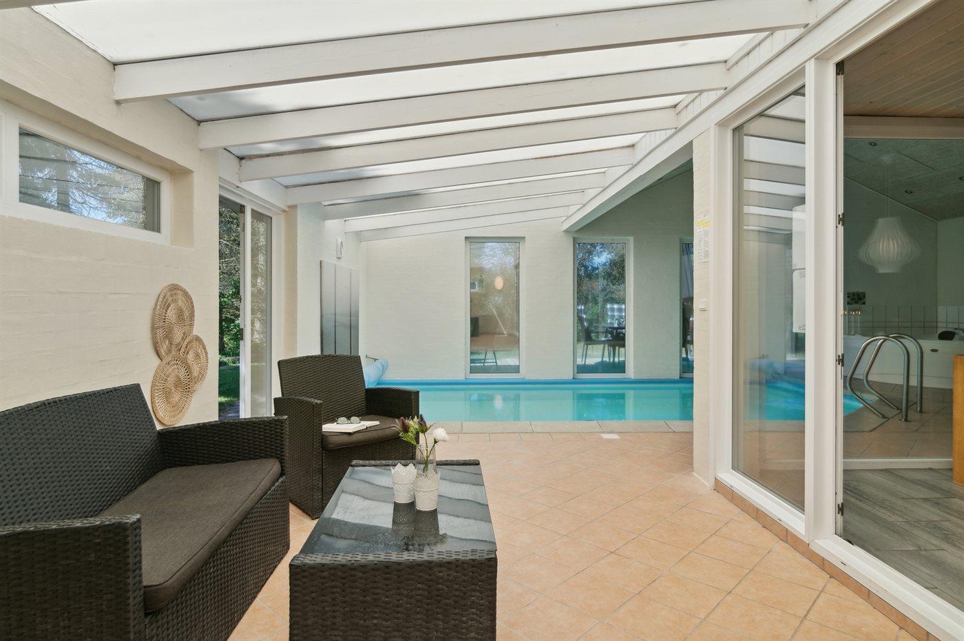Dejligt stort sommerhus med indendørs swimmingpool, beliggende i Nordjylland. Stor terrasse med havemøbler, solvogne og grill. Der er desuden et koldtvandskar til rådighed.