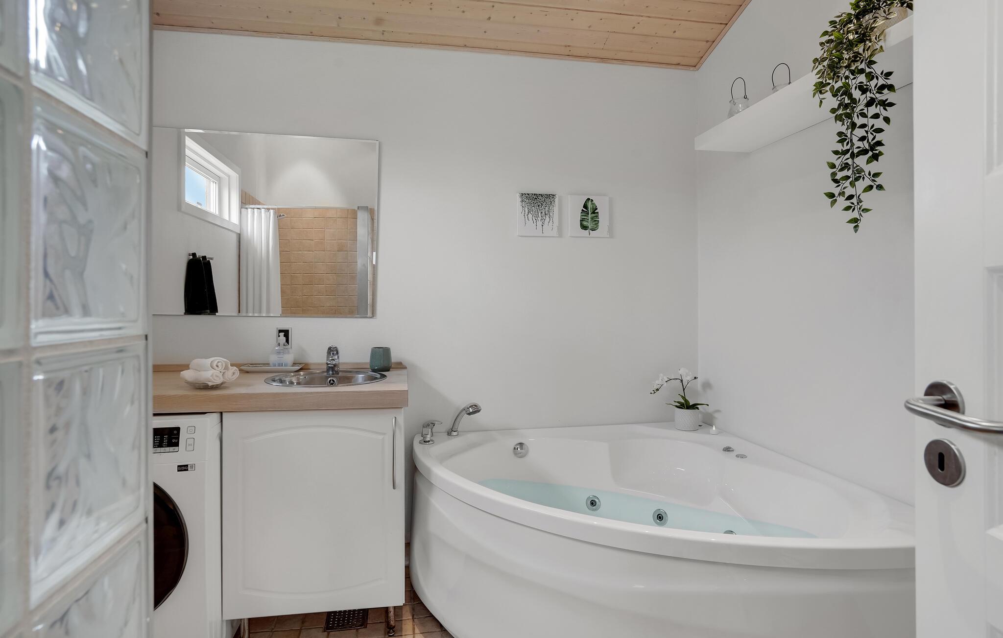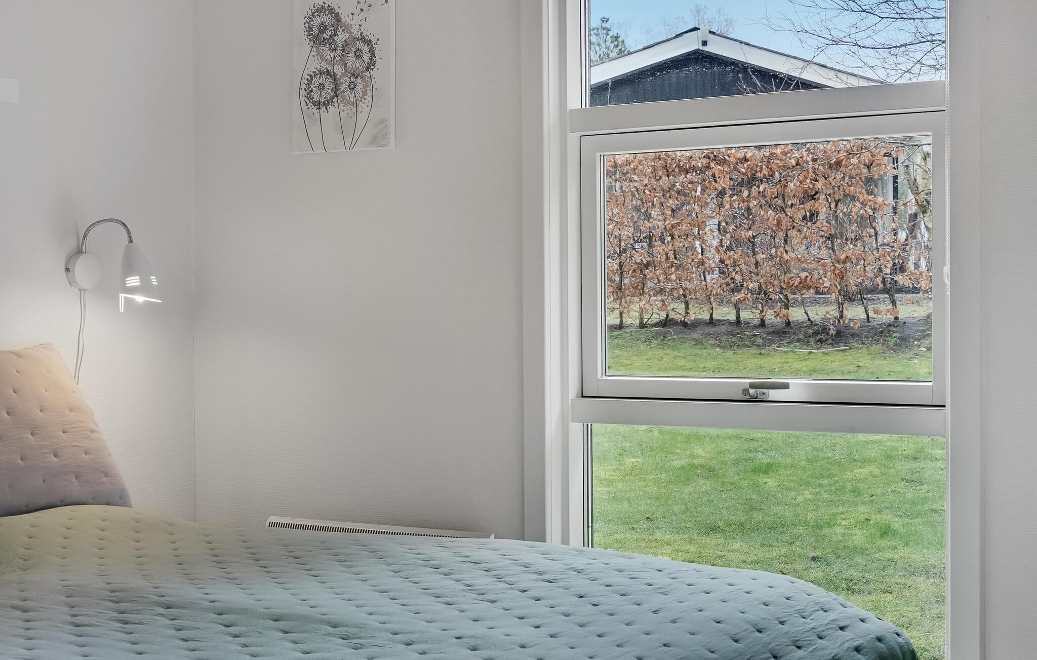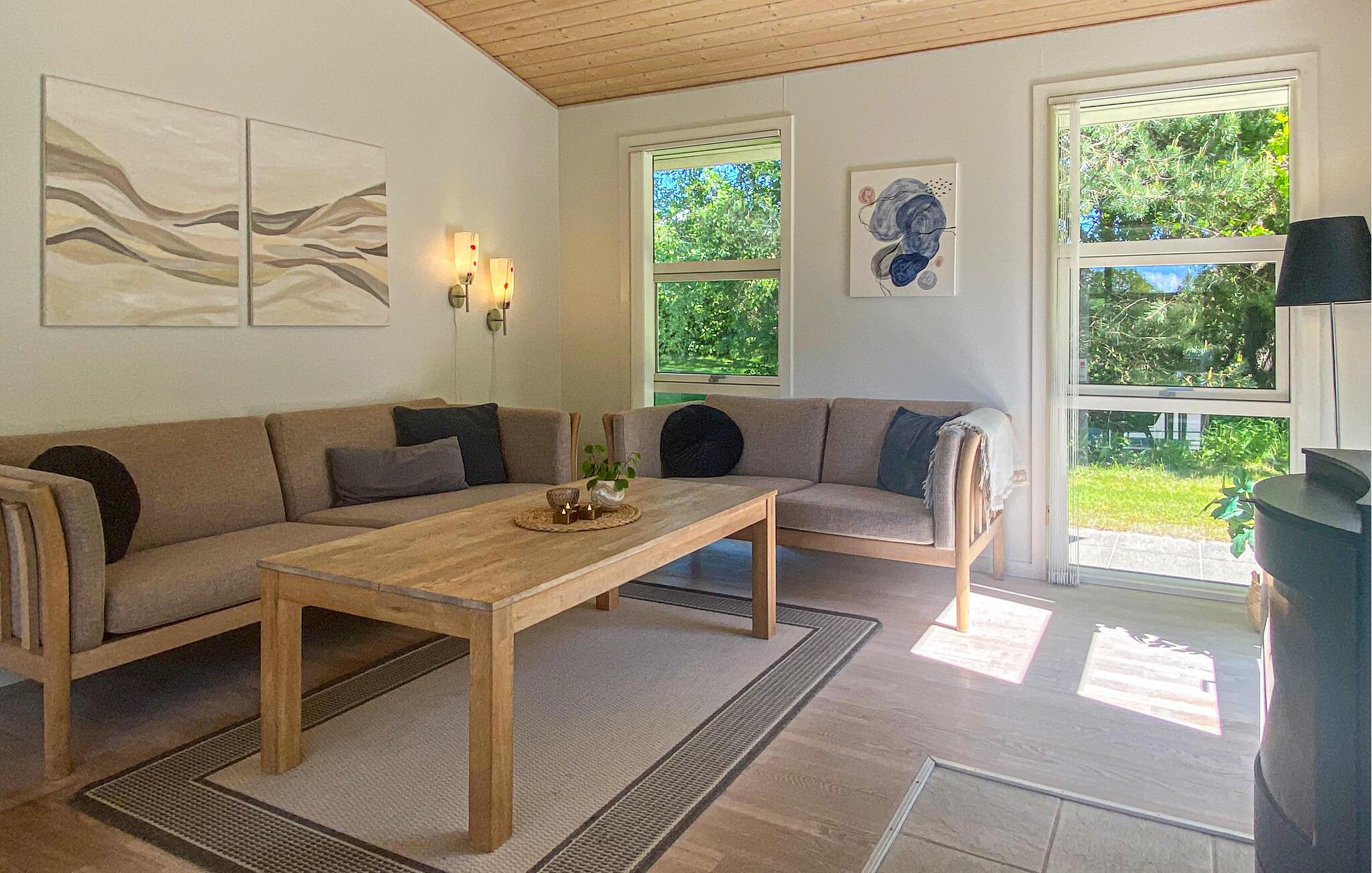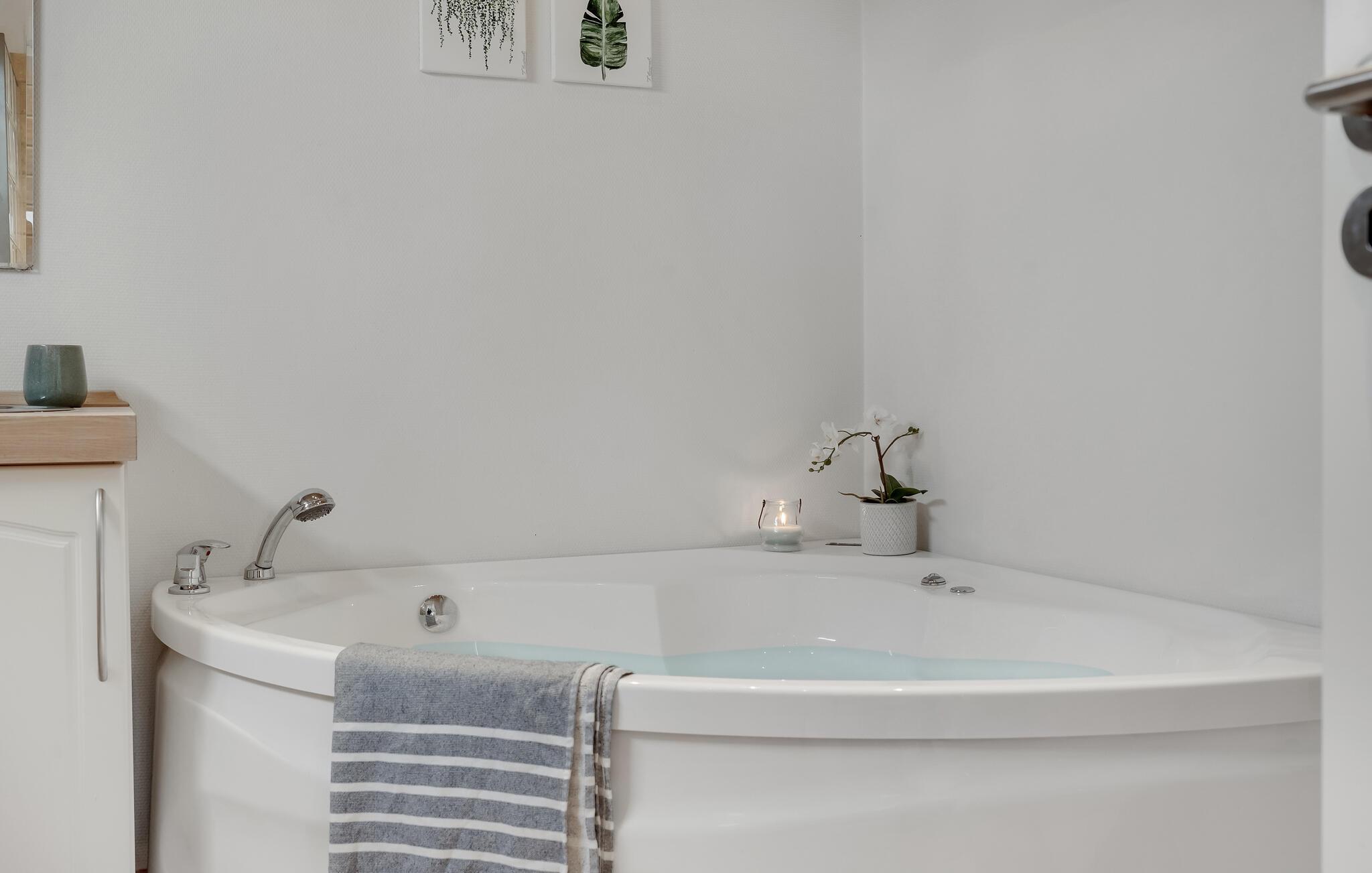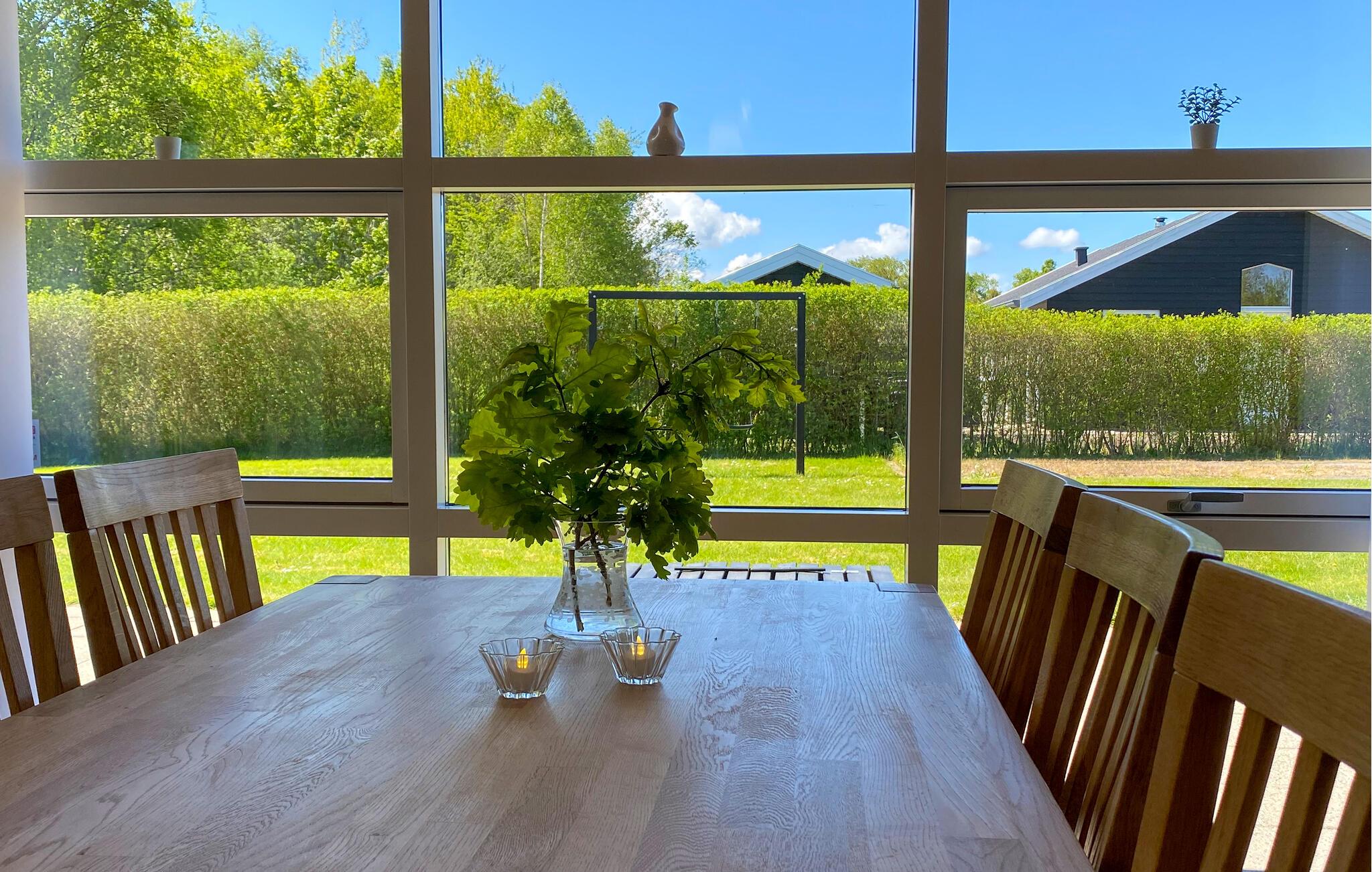 Huset er moderne og velindrettet og har god plads til fælles aktiviteter, og så ligger grunden fredeligt og skønt omkranset af natur og træer. Sæt jer med dagens måltider, eller spil et brætspil i det store køkkenalrum, og nyd udsigten til de grønne omgivelser. Samme fine udsigt kan I nyde, når I svømmer i fællespoolen, mens børnene leger på lavt vand i den anden ende, og derefter kan I læne jer tilbage og slappe af i fællessaunaen. Også husets eget spabad byder på dejlig afslapning. Om aftenen kan I sætte jer godt til rette i den hyggelige stues sofaer, se en film eller snakke om dagen, der er gået, mens ilden knitrer i brændeovnen.