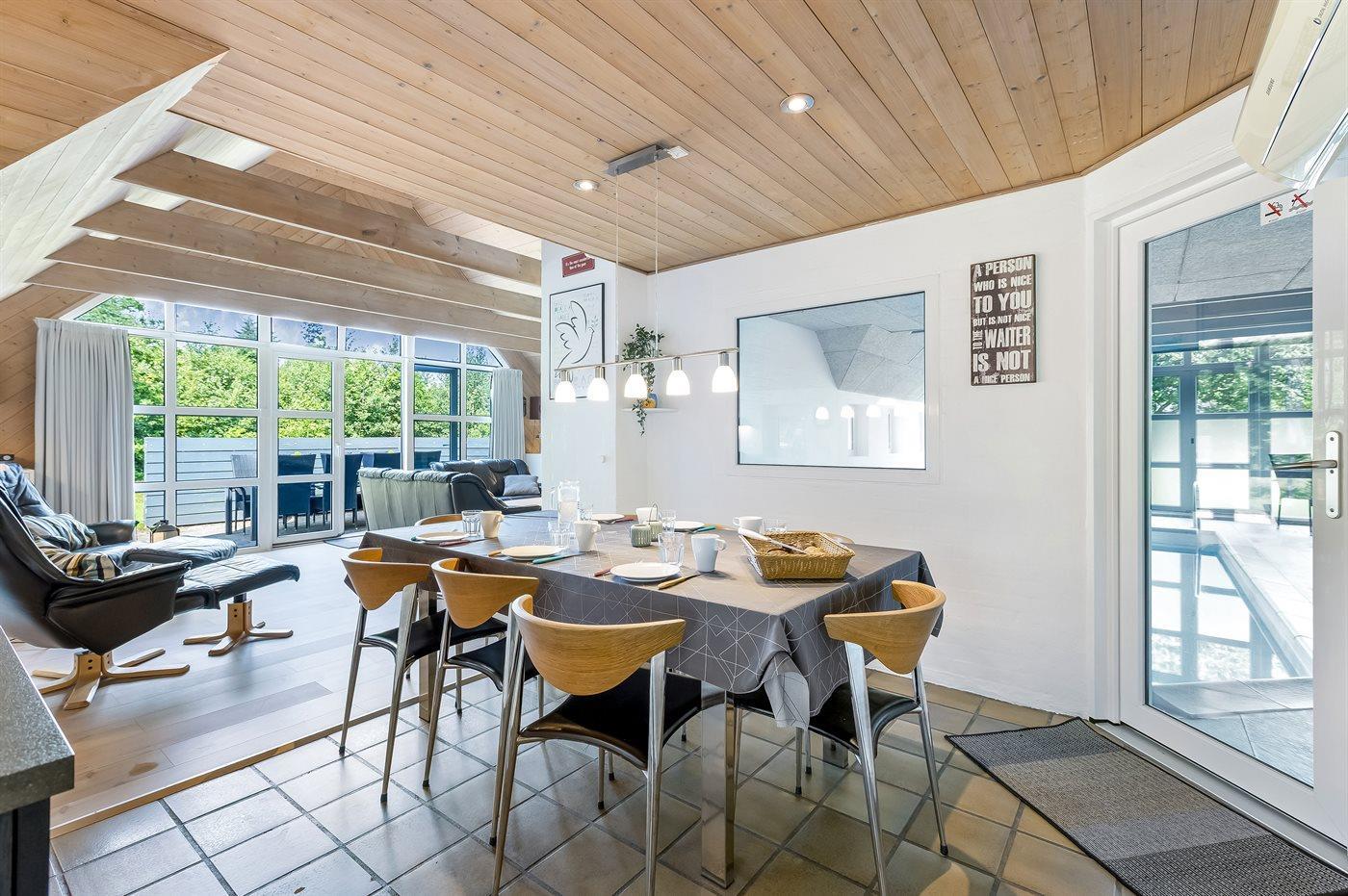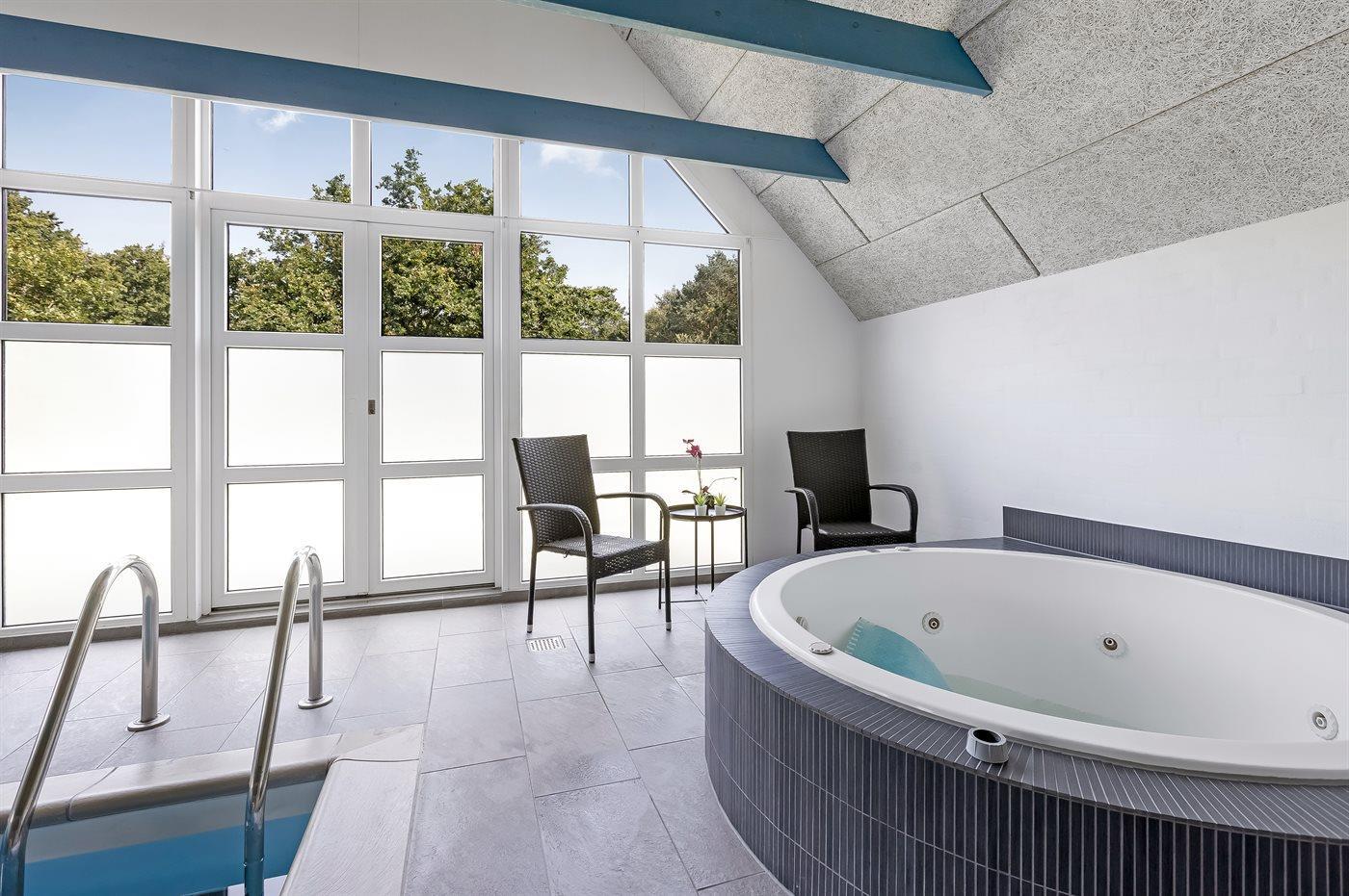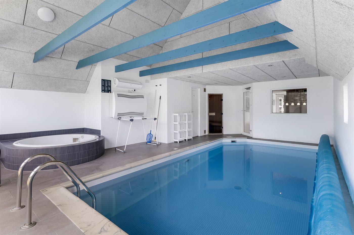 Dejlig pool-afdeling med gulvvarme, swimmingpool (6,0 x 3,0 x 1,40 m), stor 6-pers. spa (standvand) samt direkte adgang til saunaen og et af de to baderum. I forbindelse med opholdsstuen ligger det veludstyrede køkken med bl.a. mikrobølgeovn, opvaskemaskine, køleskab, varmluftsovn samt indgang og udsigt til pool-afdelingen.