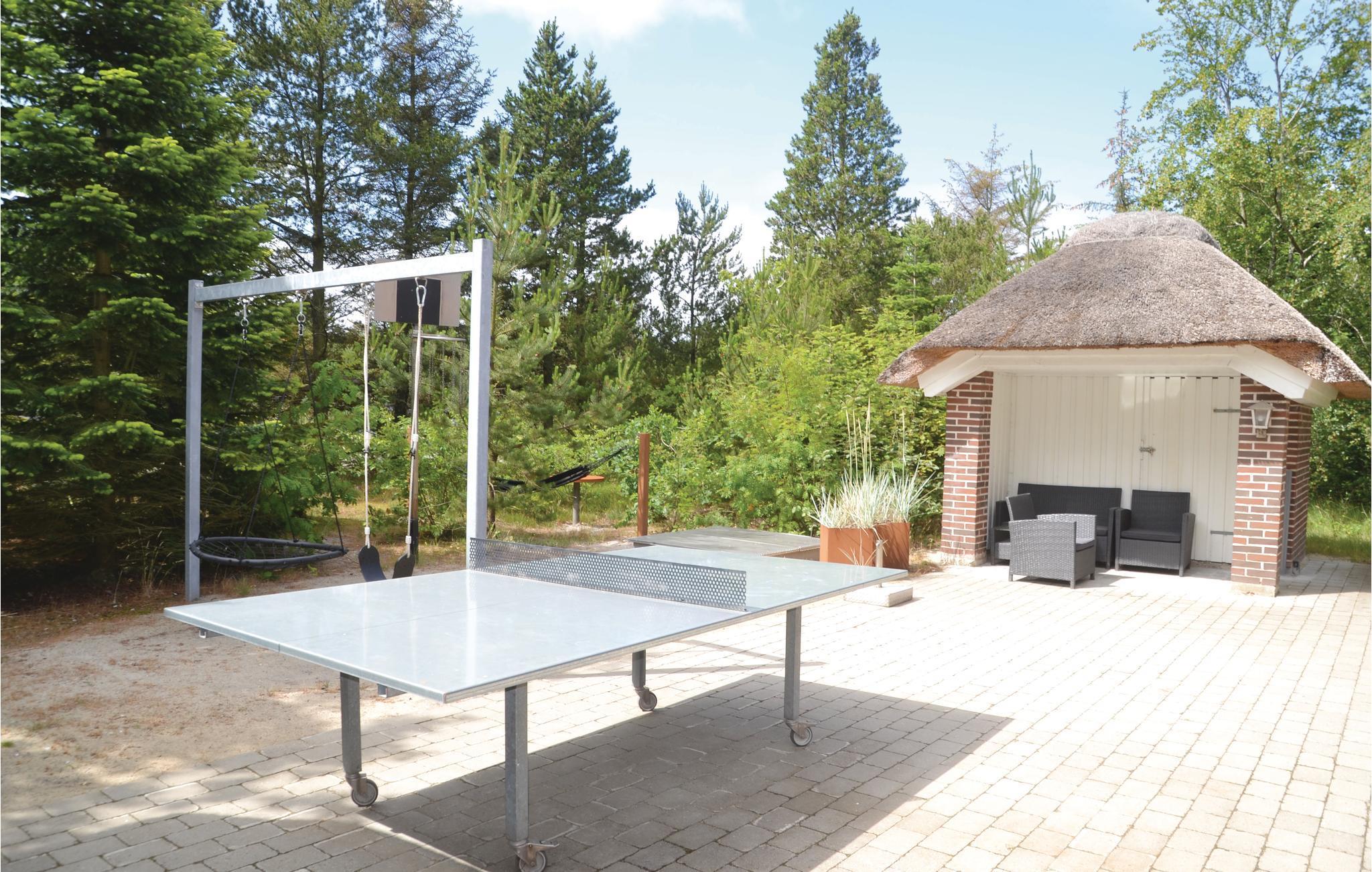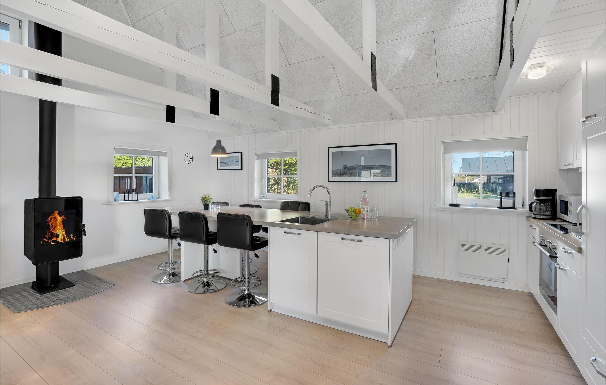 Fra det lyse køkken/alrum med loft til kip og et godt og funktionelt spiseområde samt brændeovn, er der trappe op til første sal (med børnesikring) til en dejlig, rummelig lys tv-stue, afskærmet med et New York-inspireret vinduesparti. På grunden er der en ugenert legeplads til de mindste samt en ugenert solgård med grill og udendørs bordtennis. Slap af i liggestolene eller tag en lur i hængekøjen under åben himmel. Der er flere gode naturstier i området samt cykelafstand til den jyske vestkyst med de dejlige badestrande. Feriehuset ligger ikke langt fra det store badeland Seawest samt Ringkøbing Fjord. Træ til brændeovnen kan købes ved feriehuset af husejer til en fast ugepris.