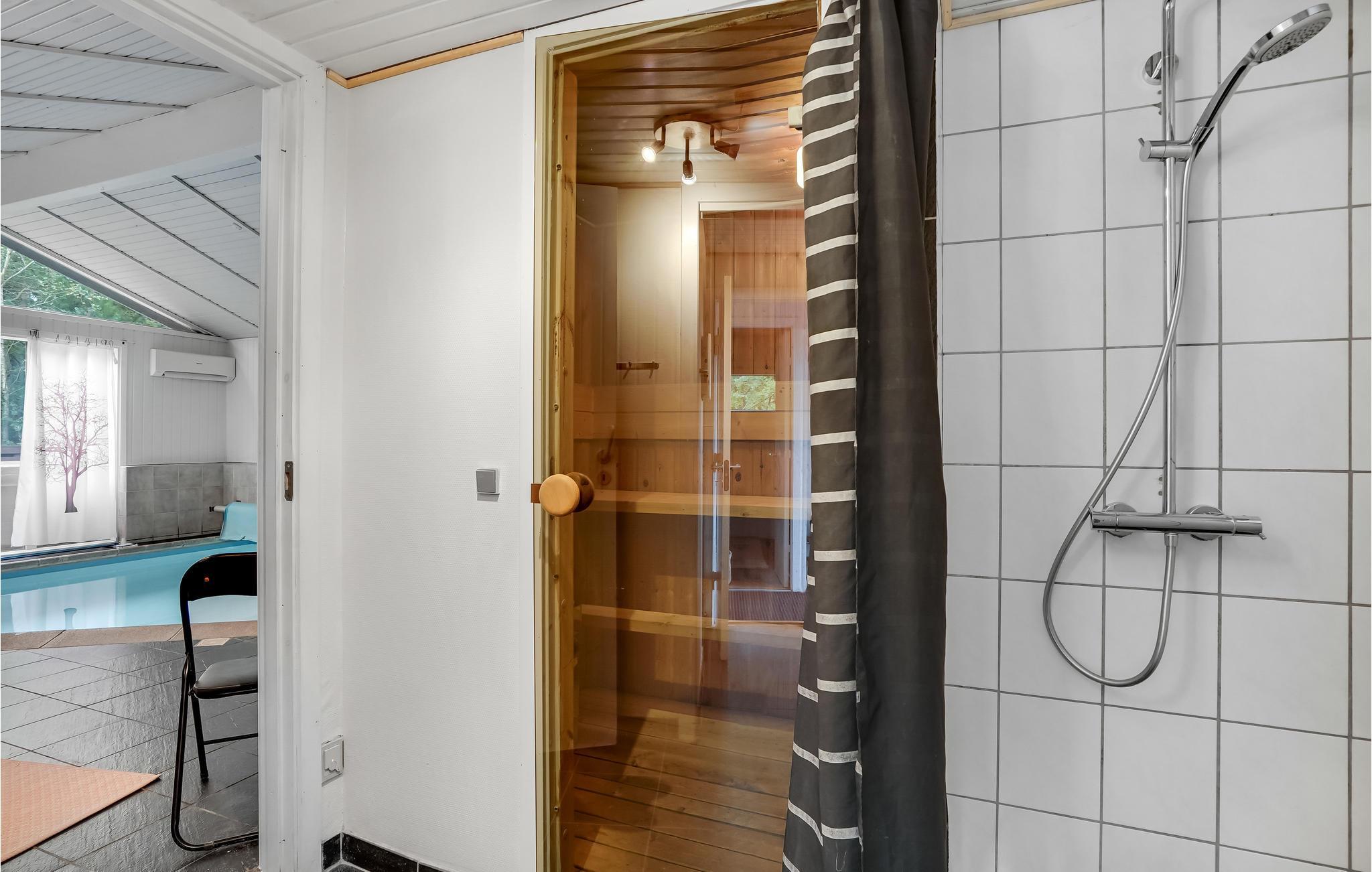 Hyggeligt swimmingpoolhus med sauna og udendørs spabad nær Houstrup Strand.