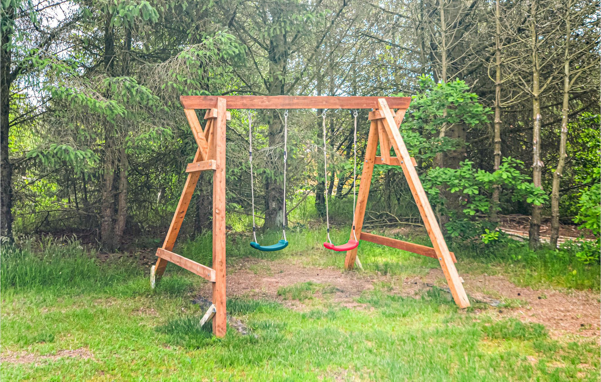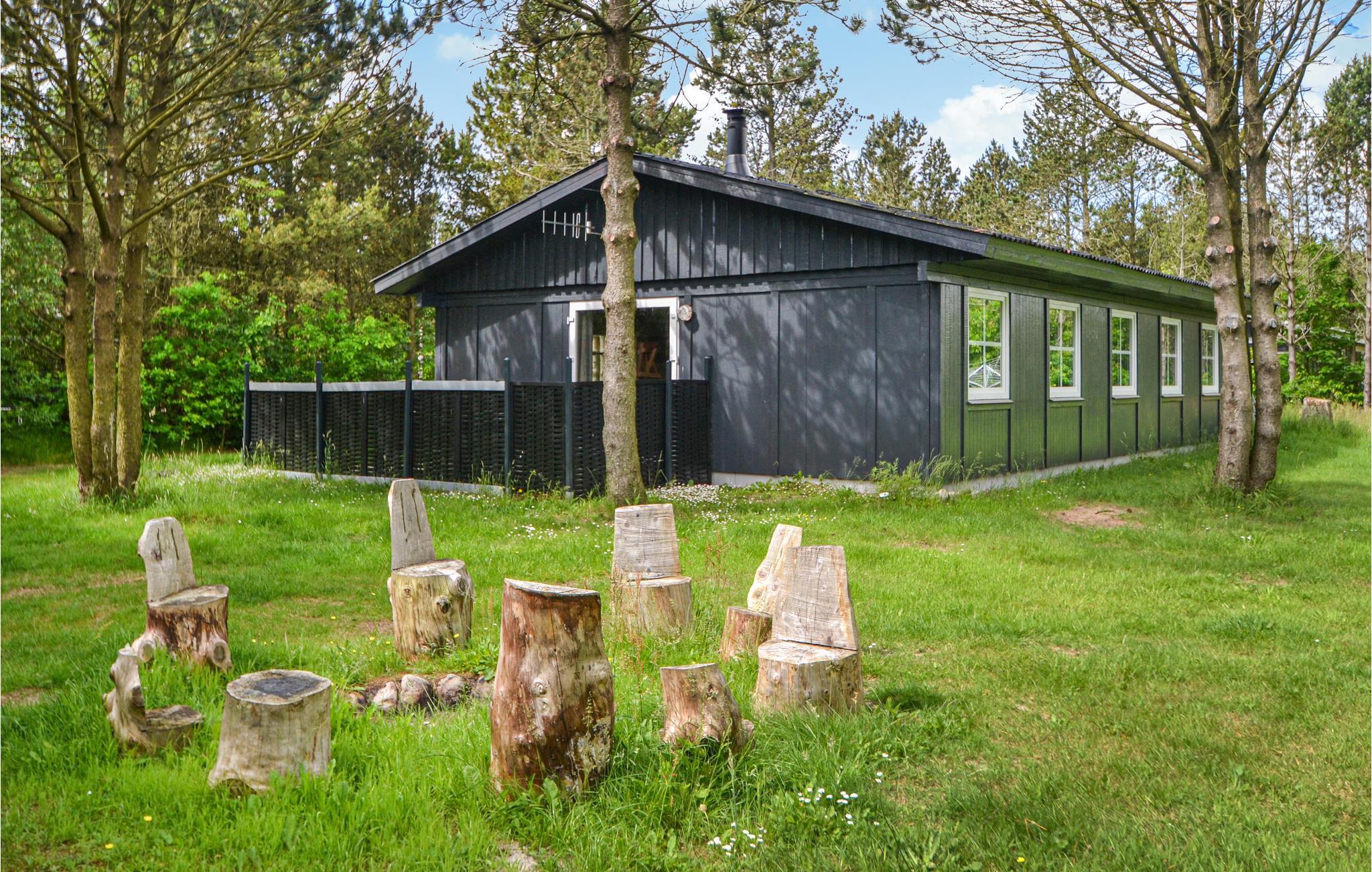 Hyggeligt træhus i Houstrup med brændeovn, terrasse og tæt på legeplads, indkøb og cykelafstand til Vestkystens strand.