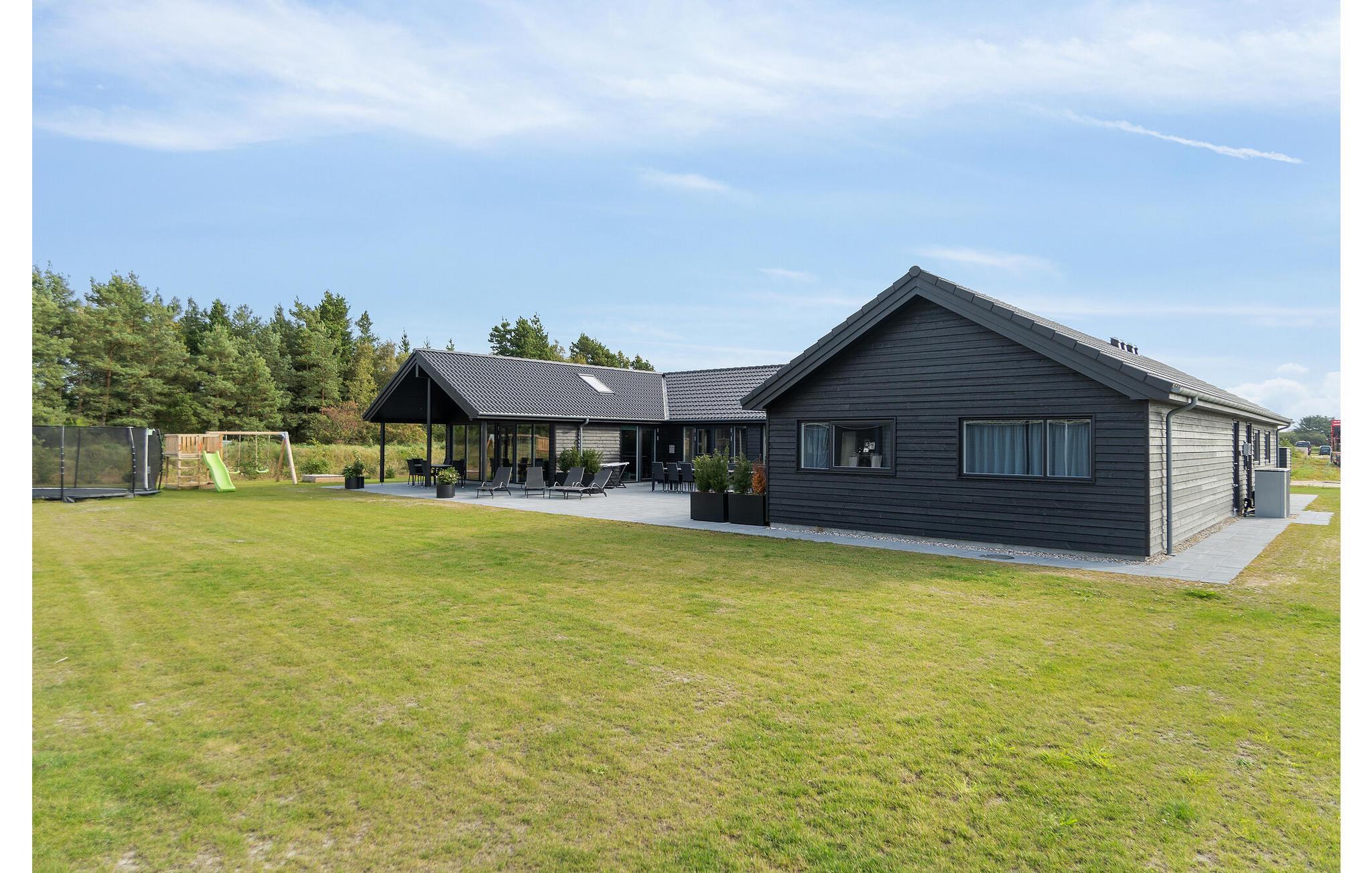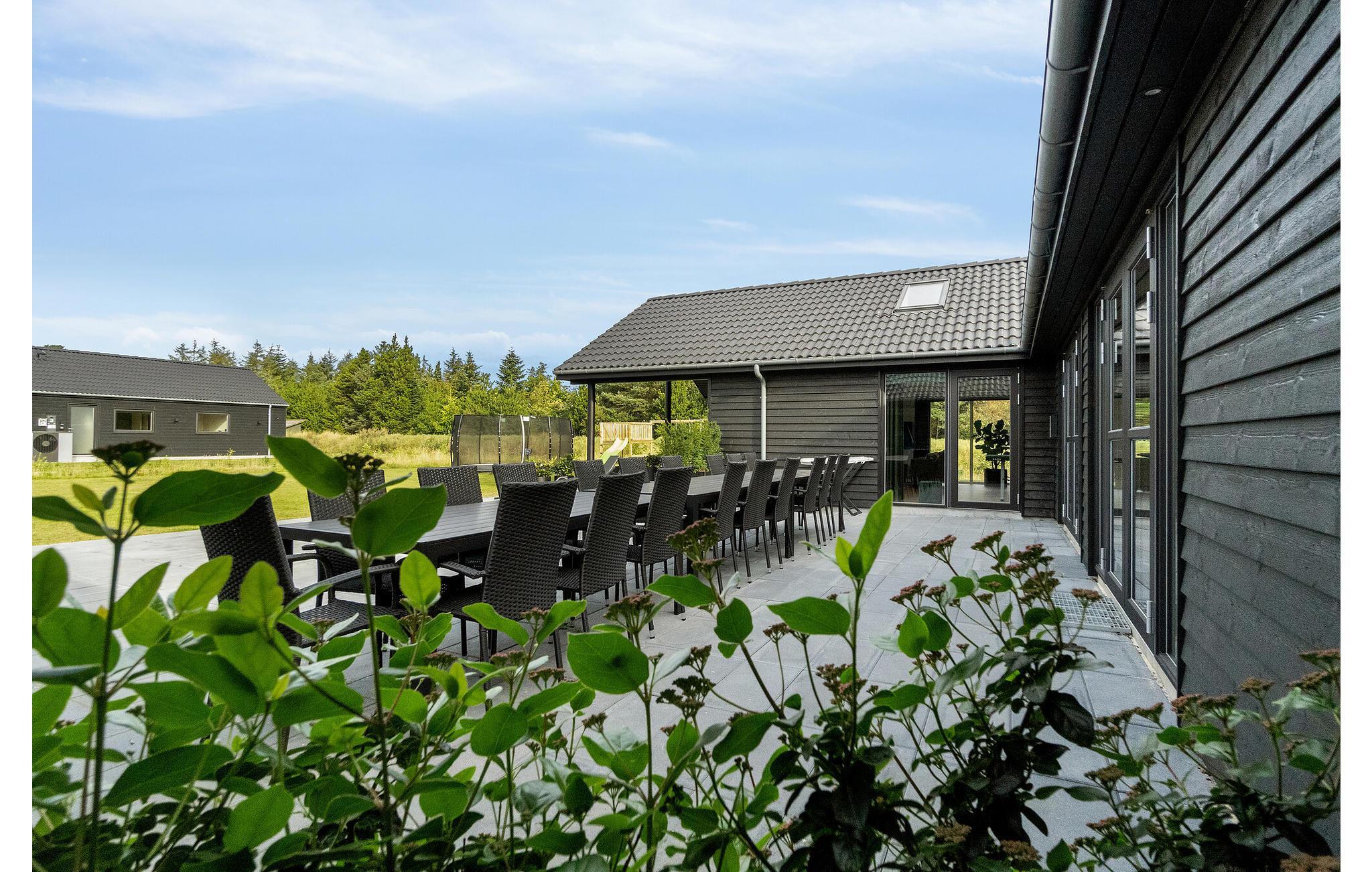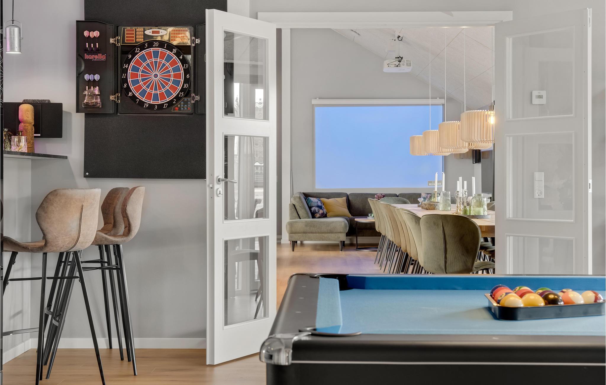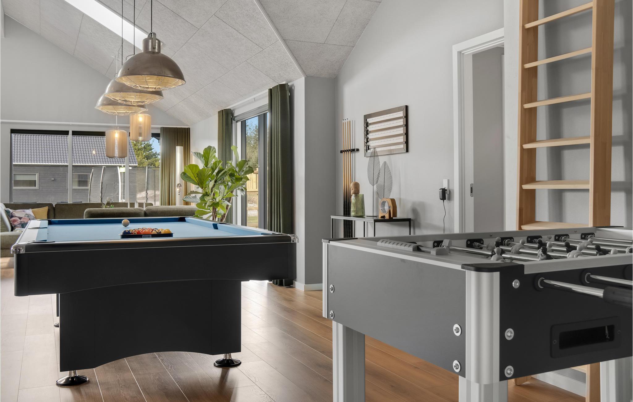 Dette skønne feriehus med plads til flere familier ligger i Houstrup, ikke langt fra Vesterhavet. Her får I faciliteter af høj kvalitet og et stort udvalg af aktiviteter for store og små. I løbet af dagen kan I more jer med at spille billard eller bordtennis og af og til nyde en kold forfriskning i baren. Poolafdelingen inviterer til timevis af badesjov og byder også på muligheder for wellness i spabad og sauna. Om aftenen, efter en begivenhedsrig dag, kan I sammen tilberede lækre måltider i det rummelige, moderne køkken og nyde dem i godt selskab ved spisebordet. Den store terrasse byder på både solrige og skyggefulde hjørner, så I kan nyde sommervejret fuldt ud. Lad børnene hygge sig på trampolinen eller i legetårnet, mens I forbereder en lækker grillmiddag til hele selskabet.