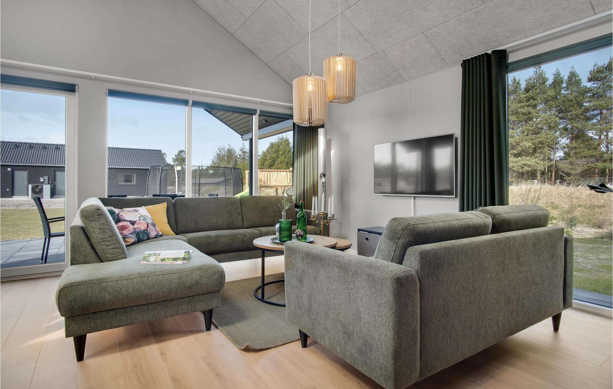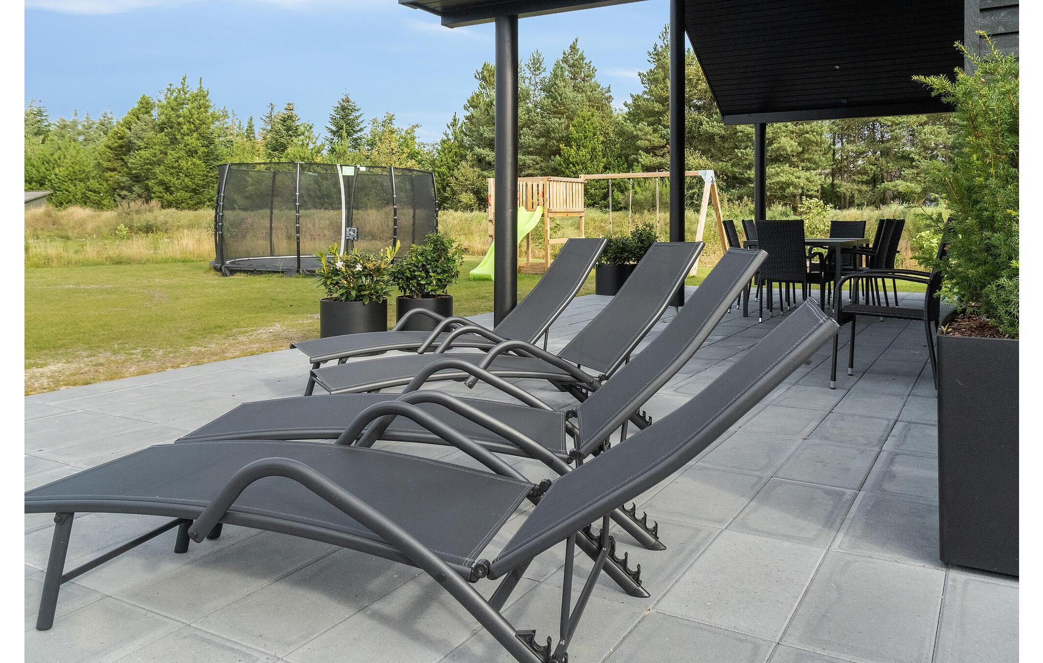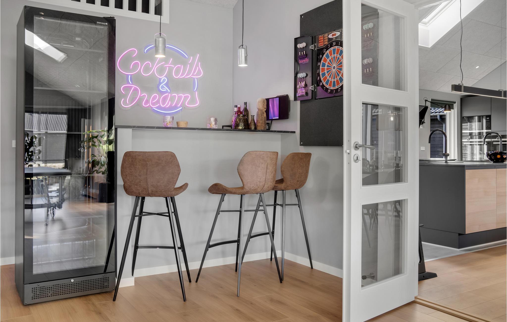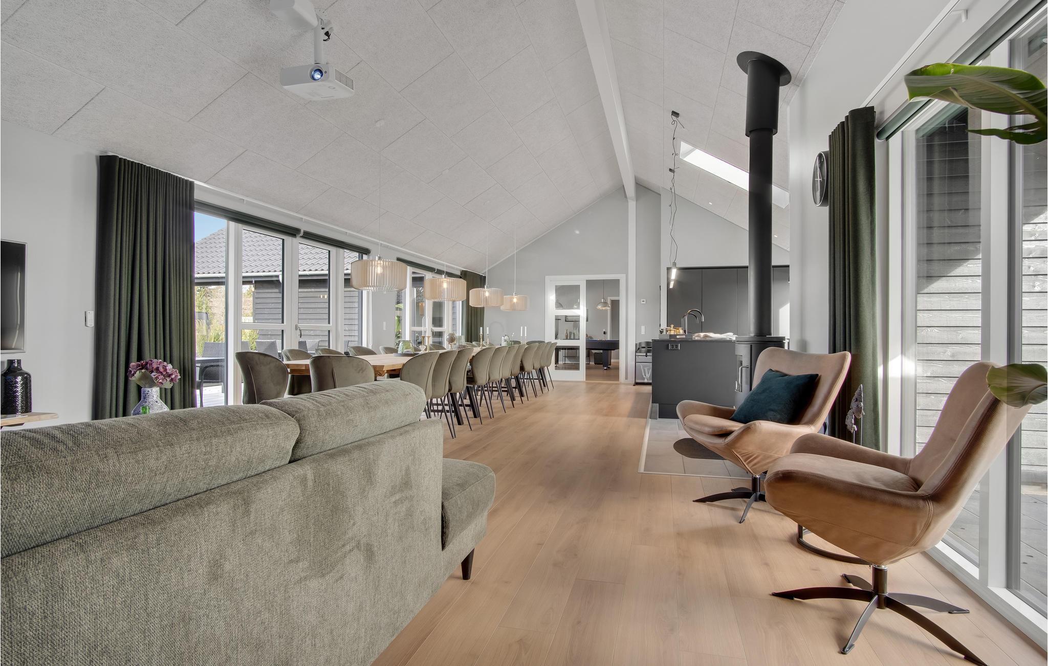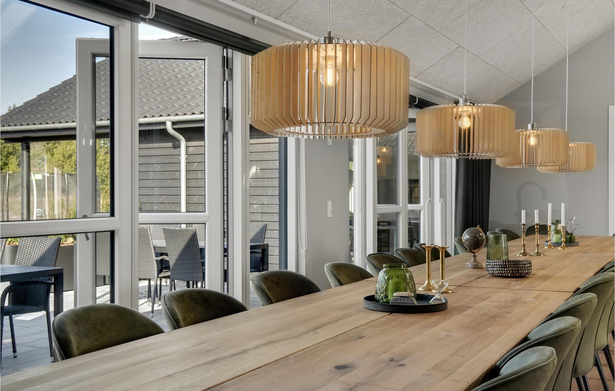 Dette skønne feriehus med plads til flere familier ligger i Houstrup, ikke langt fra Vesterhavet. Her får I faciliteter af høj kvalitet og et stort udvalg af aktiviteter for store og små. I løbet af dagen kan I more jer med at spille billard eller bordtennis og af og til nyde en kold forfriskning i baren. Poolafdelingen inviterer til timevis af badesjov og byder også på muligheder for wellness i spabad og sauna. Om aftenen, efter en begivenhedsrig dag, kan I sammen tilberede lækre måltider i det rummelige, moderne køkken og nyde dem i godt selskab ved spisebordet. Den store terrasse byder på både solrige og skyggefulde hjørner, så I kan nyde sommervejret fuldt ud. Lad børnene hygge sig på trampolinen eller i legetårnet, mens I forbereder en lækker grillmiddag til hele selskabet.