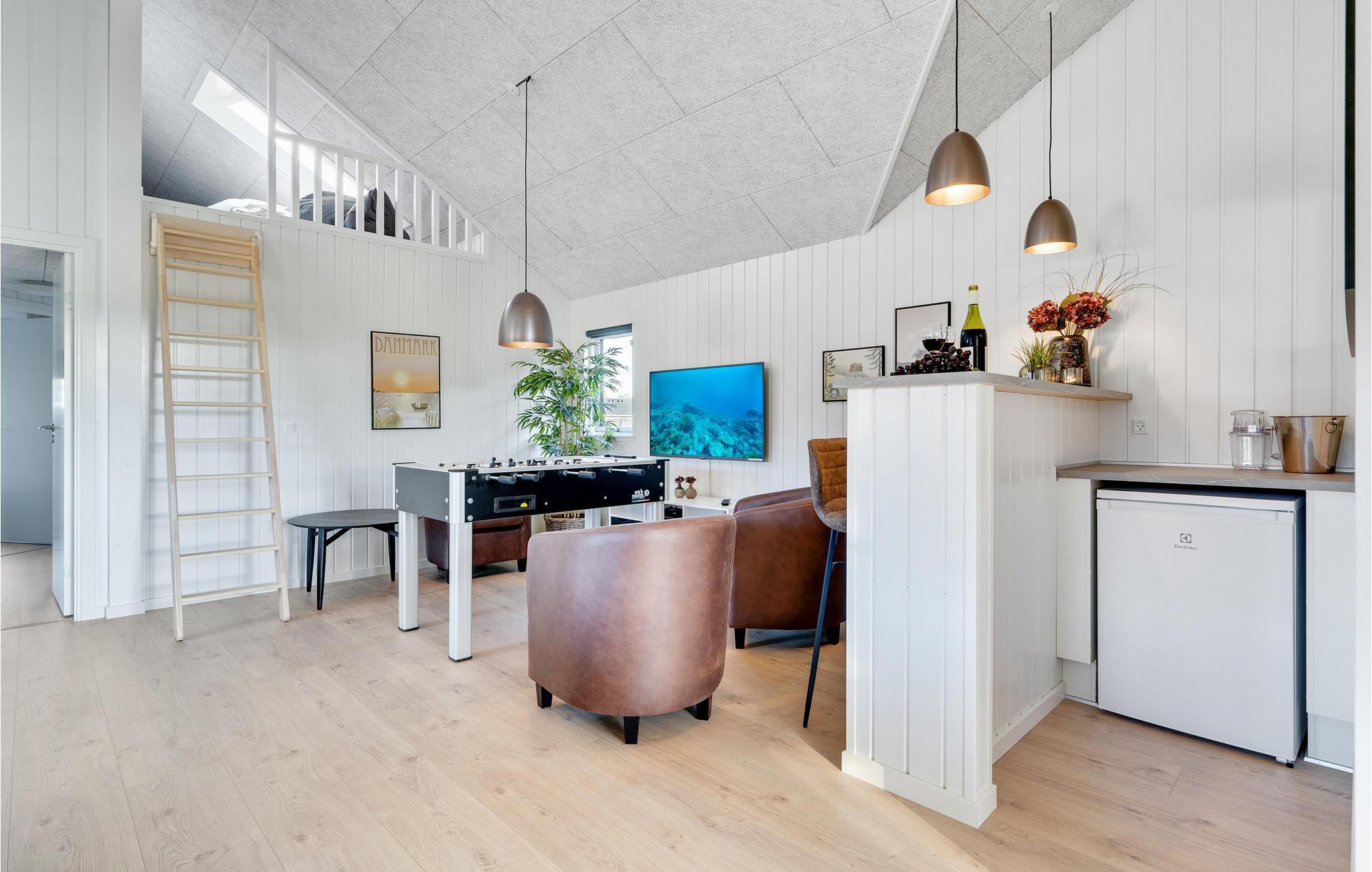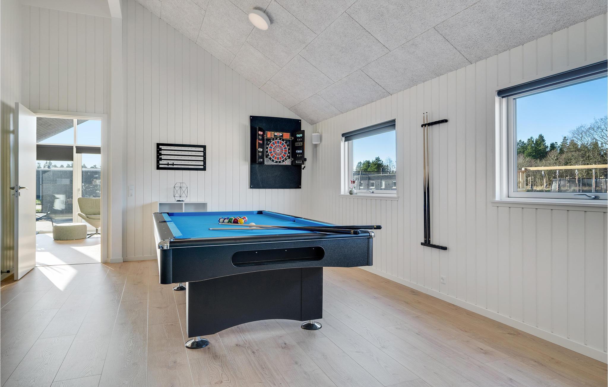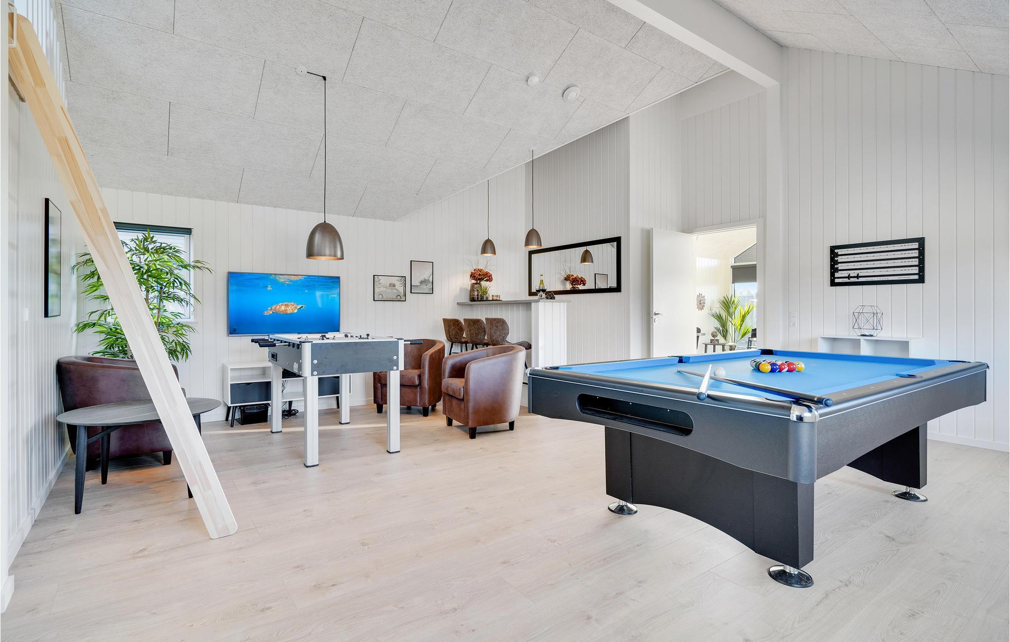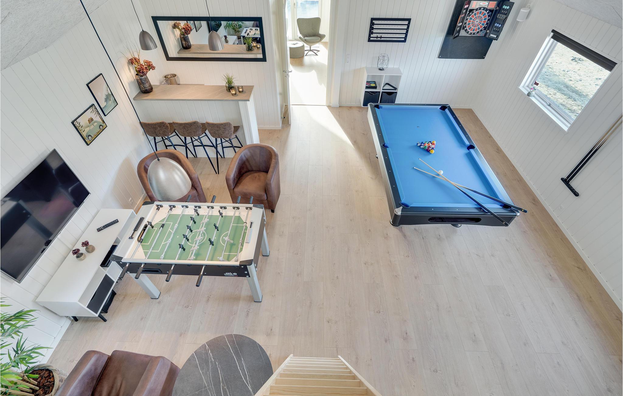 I Houstrup, ikke langt fra Vesterhavet, finder I dette fantastiske feriehus med hyggelig og indbydende indretning. Huset emmer af høj kvalitet, og har et lyst interiør og mange komfortable og familievenlige faciliteter. I aktivitetsrummet kan I udfordre hinanden til et spil bordtennis eller bordfodbold og imens nyde en kold forfriskning i baren. Den smukke saltvandspool med vandrutsjebane inviterer store og små til mange hyggelige timer. Husets hjerte er den skønne opholdsstue med åbent køkken og plads til fælles madlavning. Nyd lækre måltider i godt selskab ved det store spisebord og hyg jer bagefter med brætspil eller sæt jer godt til rette foran brændeovnen.