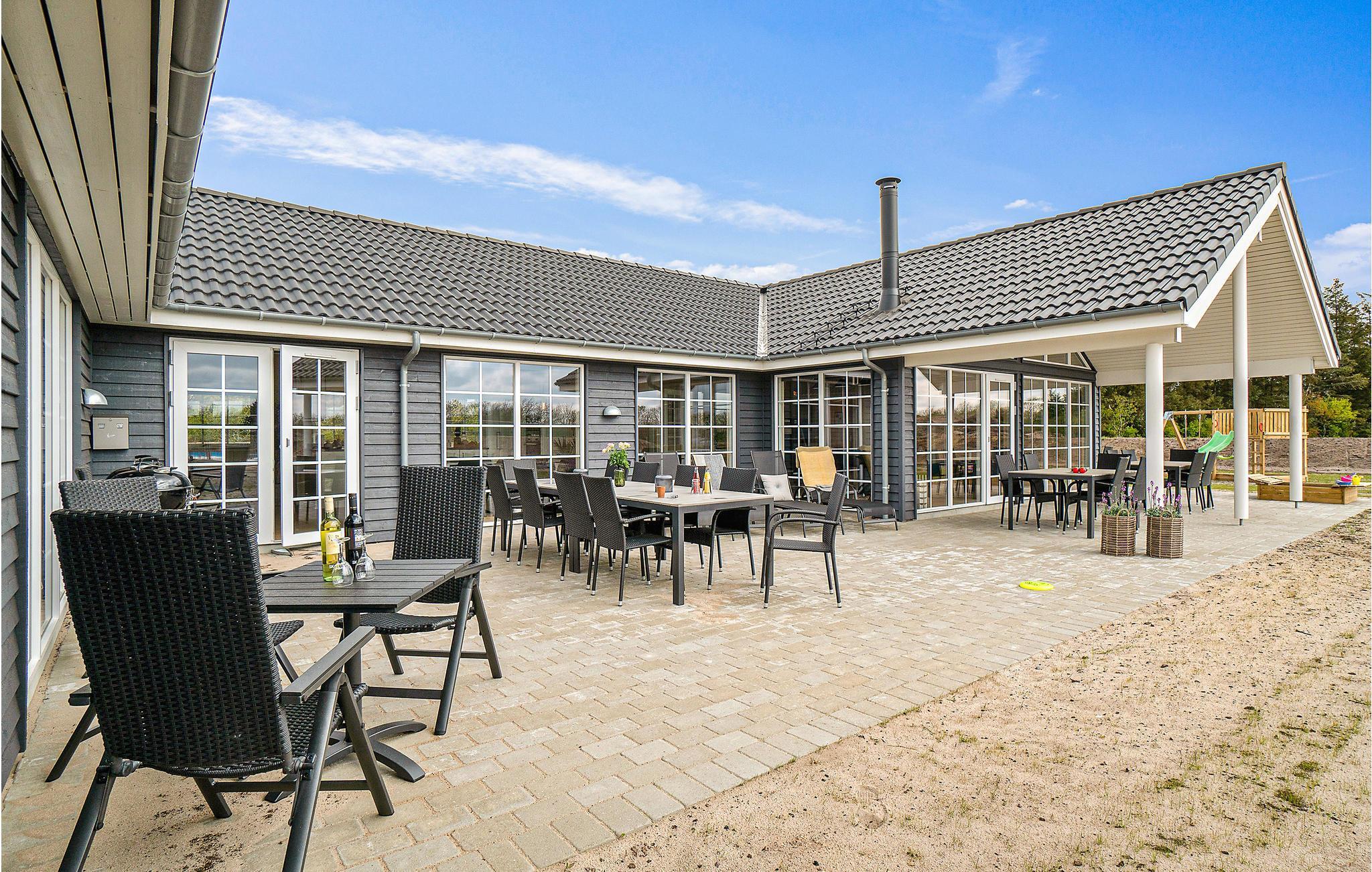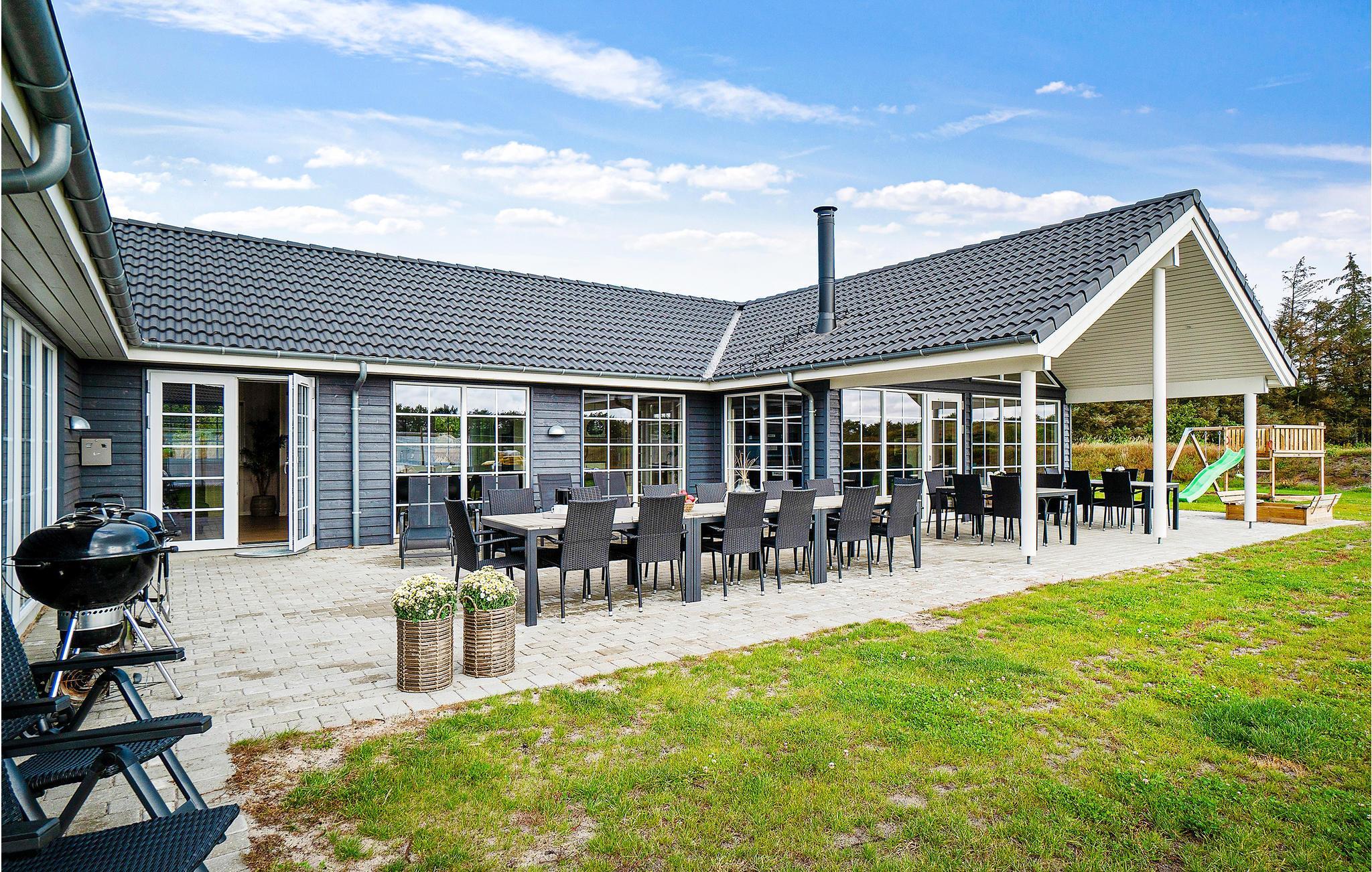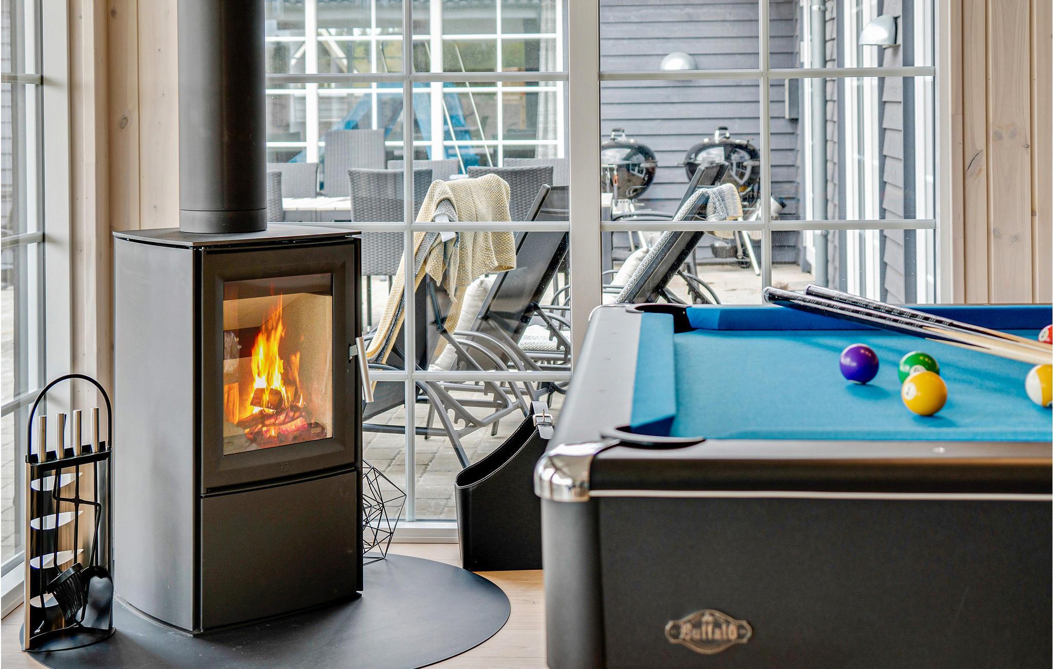 Her har I mulighed for en gennemført ferieoplevelse, uanset om I er til afslapning eller til aktiviteter. Er I til aktiv ferie, så har sommerhuset rigeligt at byde på, hvad angår indendørs aktiviteter. Aktivitetsrummet indeholder både billard, bordtennis og bordfodbold og fra baren i hjørnet kan tilskuerne nyde en kølig drink. I husets eget badeland kan I nyde godt af poolen med vandrutsjebane, svømmetræner, stort spabad med plads til 4-6 personer og sauna. Det flotte, moderne køkken er stilfuldt indrettet og udstyret, og har direkte forbindelse til stuen hvor I finder spiseområdet med plads til alle husets gæster. Udendørs kan I hygge jer på den sydvendte terrasse som er delvist overdækket. Mens I nyder solen kan børnene lege på trampolin, gynge eller legetårnet med rutsjebanen. Senere kan I tilberede familiens livretter i den udendørs pizzaovn og nyde et lækkert måltid under aftensolen.
