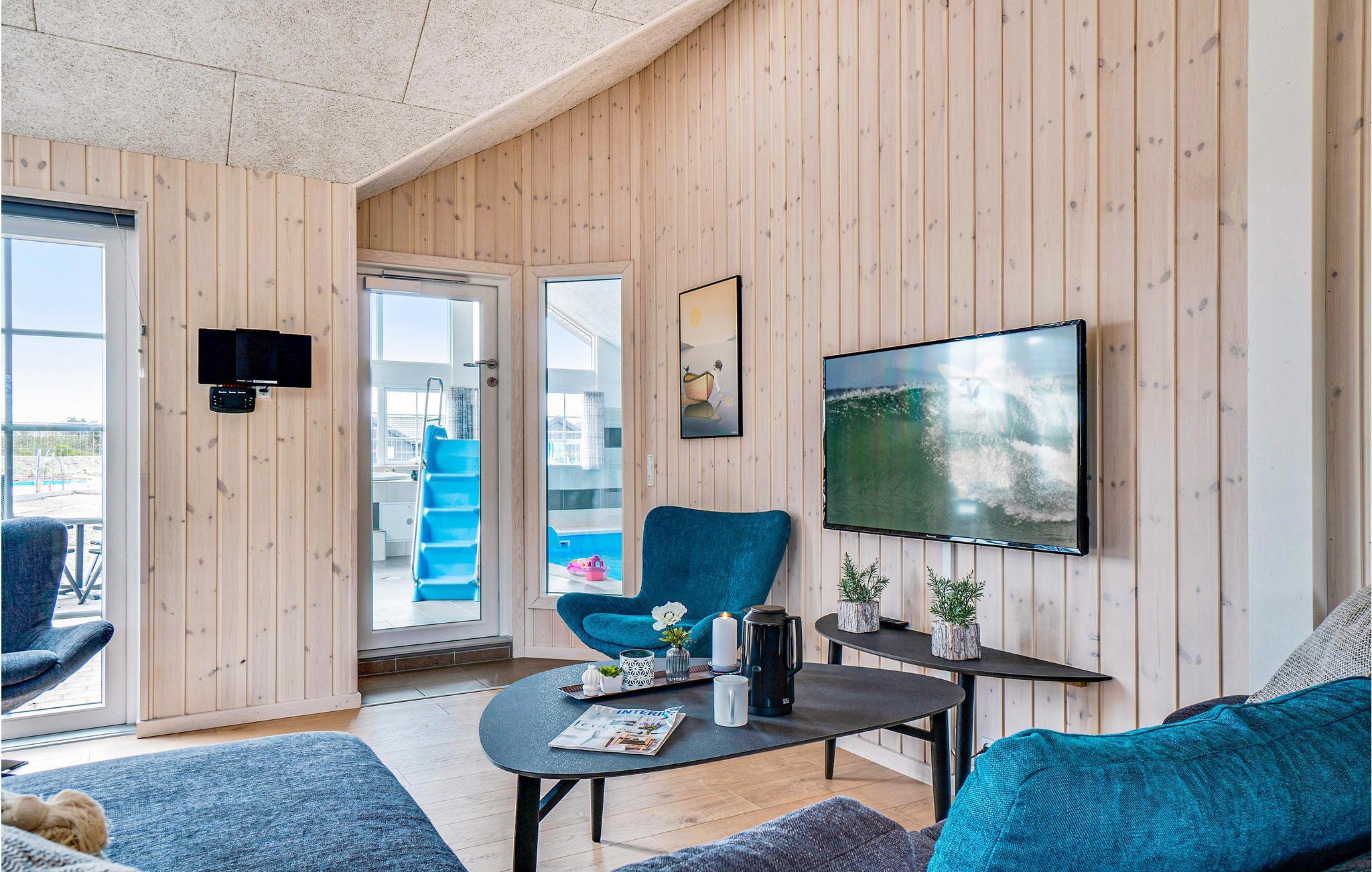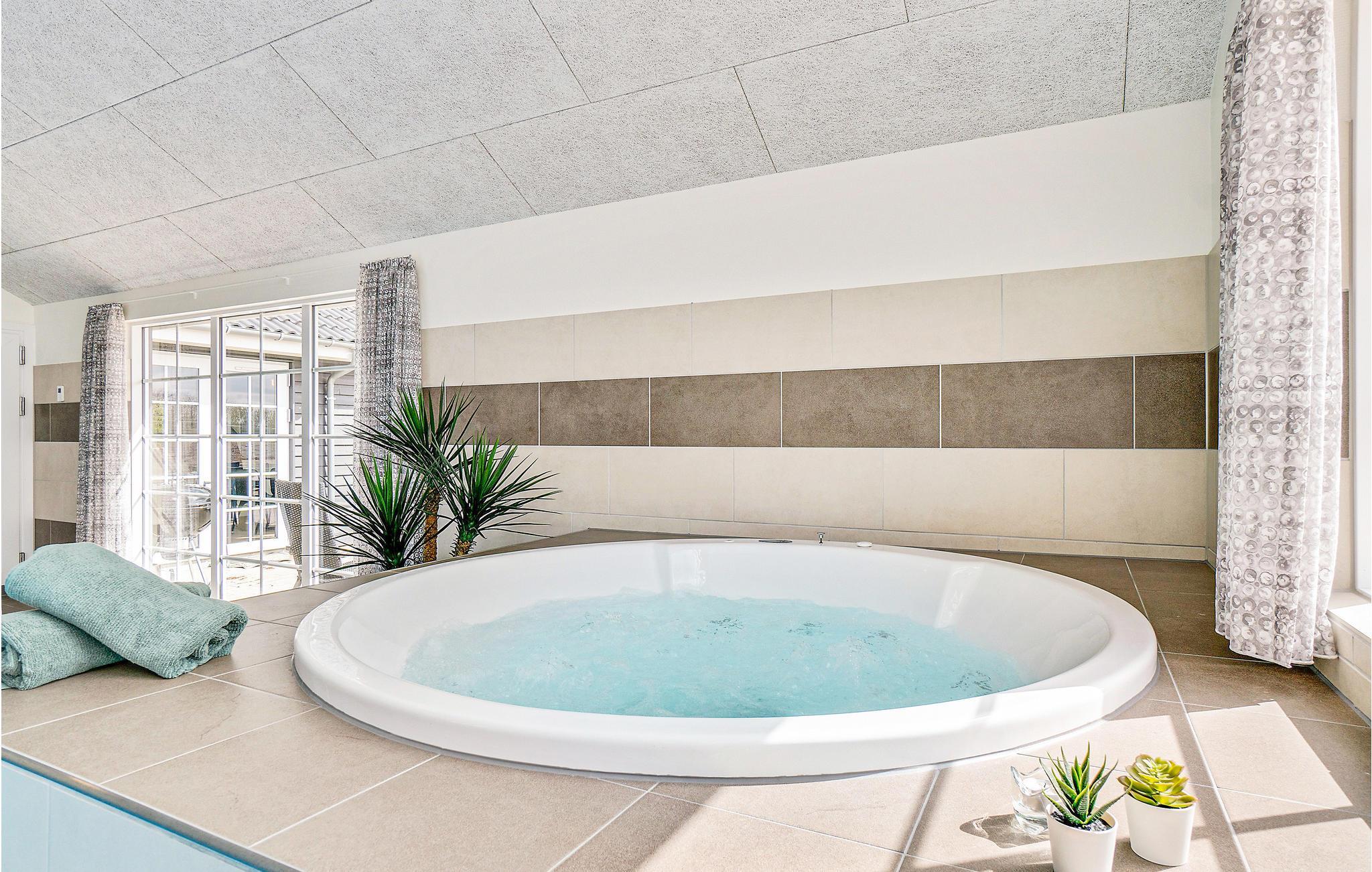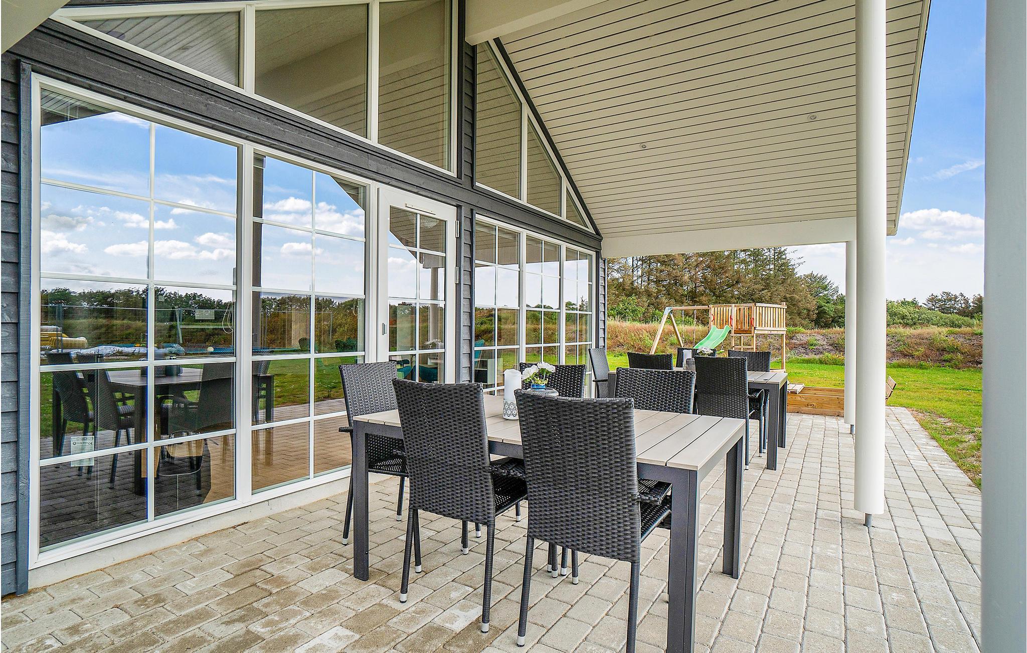 Her har I mulighed for en gennemført ferieoplevelse, uanset om I er til afslapning eller til aktiviteter. Er I til aktiv ferie, så har sommerhuset rigeligt at byde på, hvad angår indendørs aktiviteter. Aktivitetsrummet indeholder både billard, bordtennis og bordfodbold og fra baren i hjørnet kan tilskuerne nyde en kølig drink. I husets eget badeland kan I nyde godt af poolen med vandrutsjebane, svømmetræner, stort spabad med plads til 4-6 personer og sauna. Det flotte, moderne køkken er stilfuldt indrettet og udstyret, og har direkte forbindelse til stuen hvor I finder spiseområdet med plads til alle husets gæster. Udendørs kan I hygge jer på den sydvendte terrasse som er delvist overdækket. Mens I nyder solen kan børnene lege på trampolin, gynge eller legetårnet med rutsjebanen. Senere kan I tilberede familiens livretter i den udendørs pizzaovn og nyde et lækkert måltid under aftensolen.