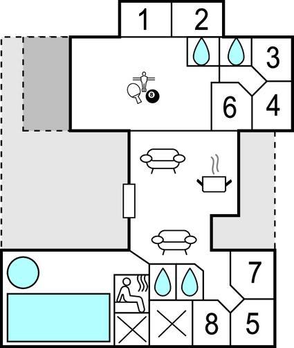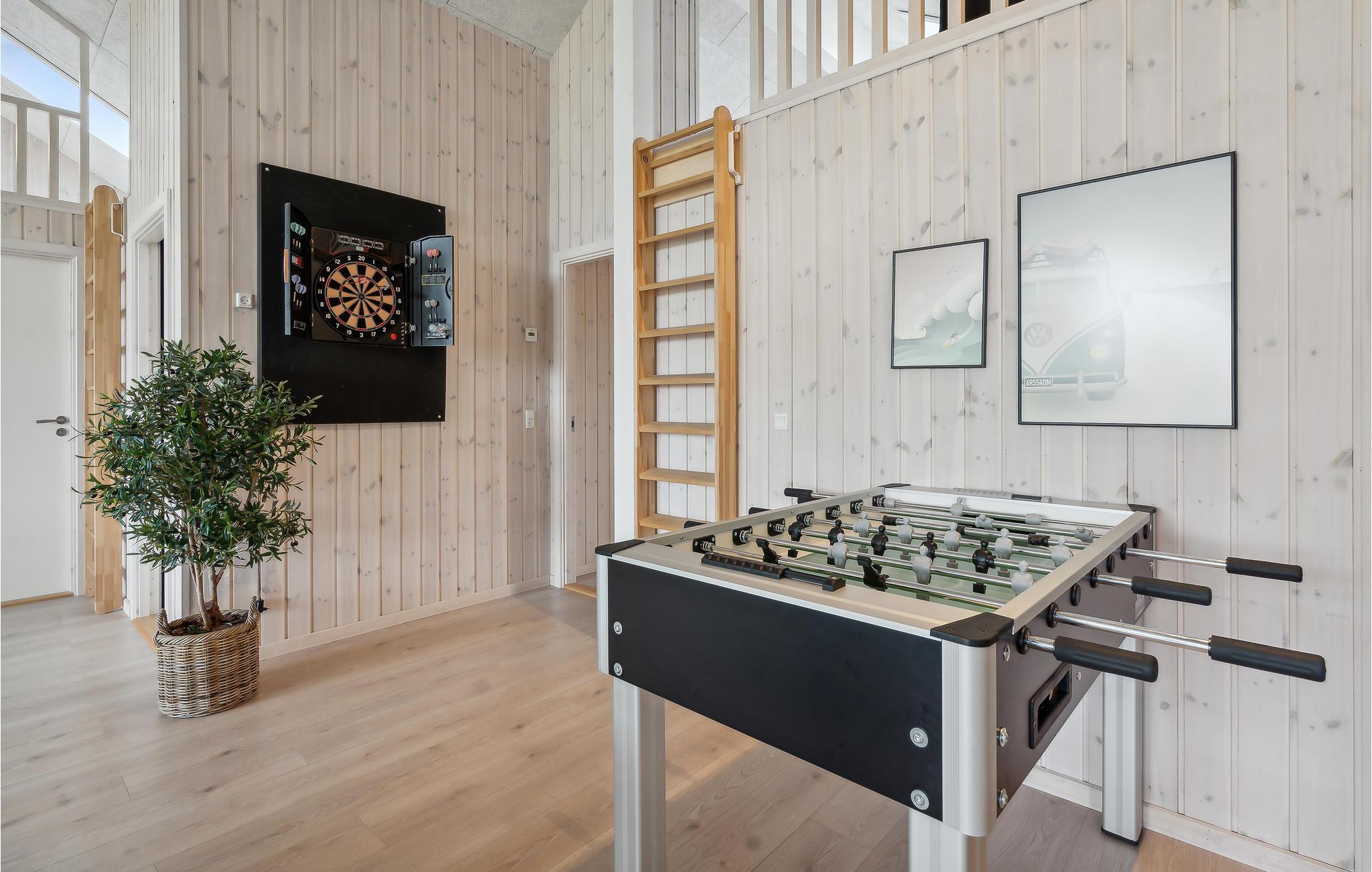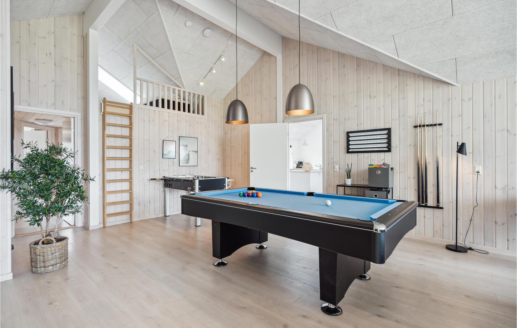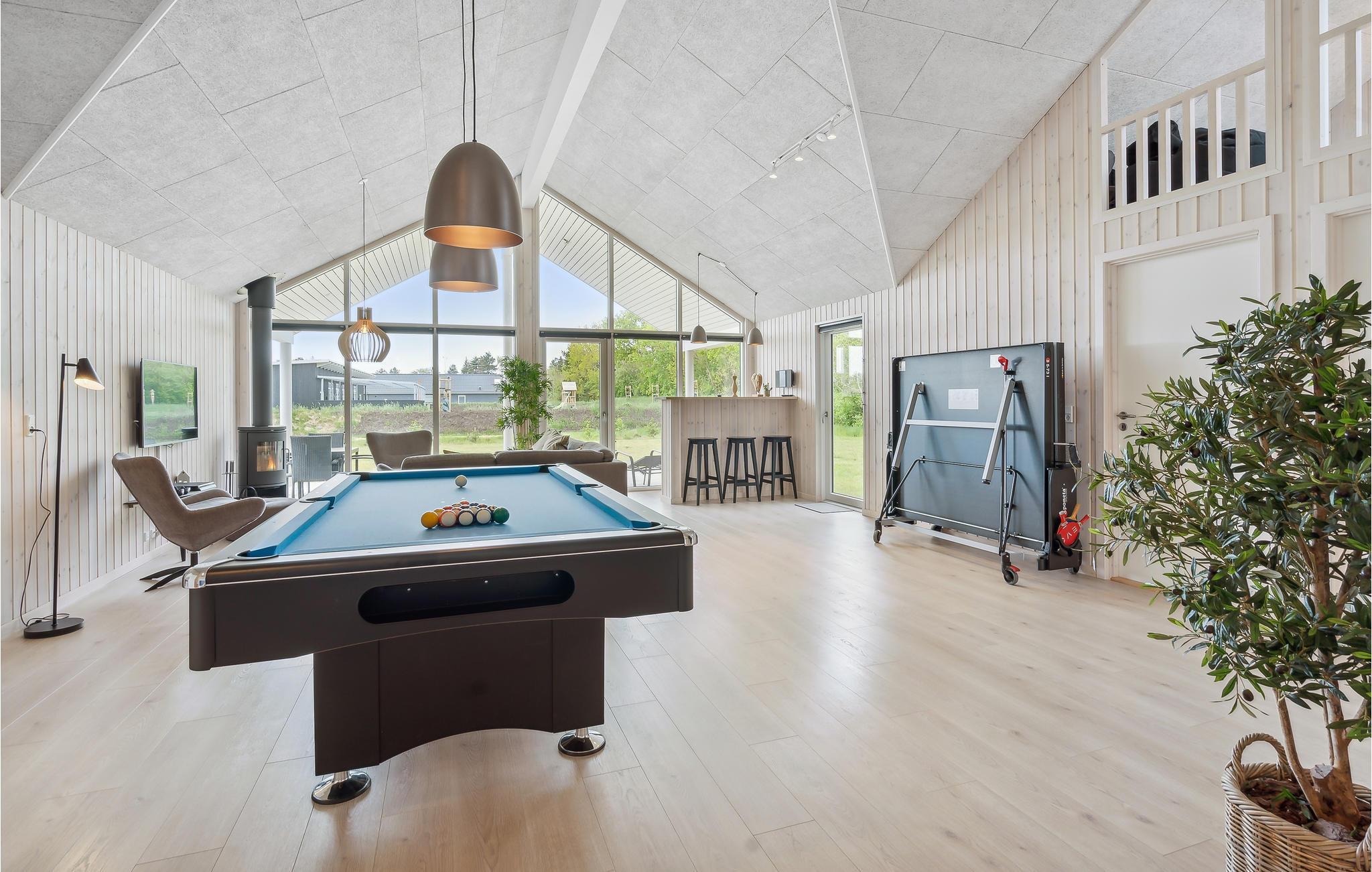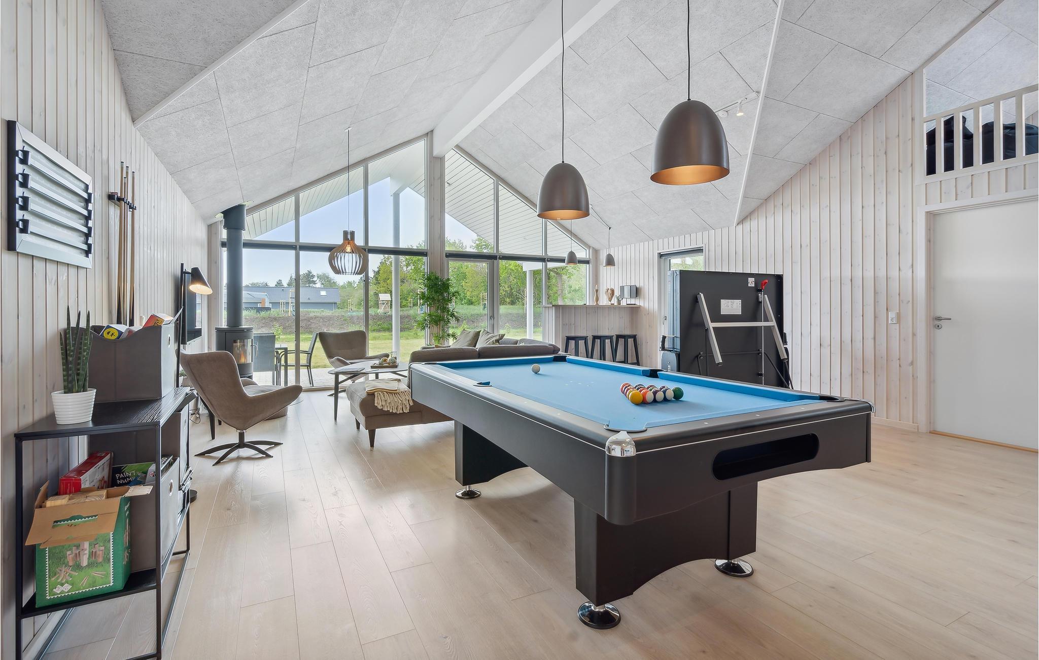 I sommerhusets aktivitetsrum er der en række forskellige faciliteter. Her kan I spille bordtennis, bordfodbold, billard eller dart. Aktivitetslokalet har også en bar med køleskab, hvor man kan sørge for kolde drikkevarer til spillerne. Efter vilde dueller kan I slappe af i rummets sofagruppe, hvor I kan se en film eller et spil på PS4 på tv'et.