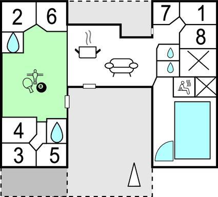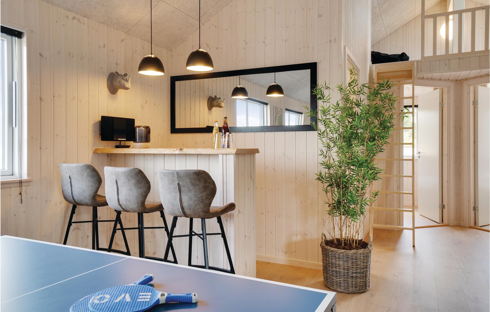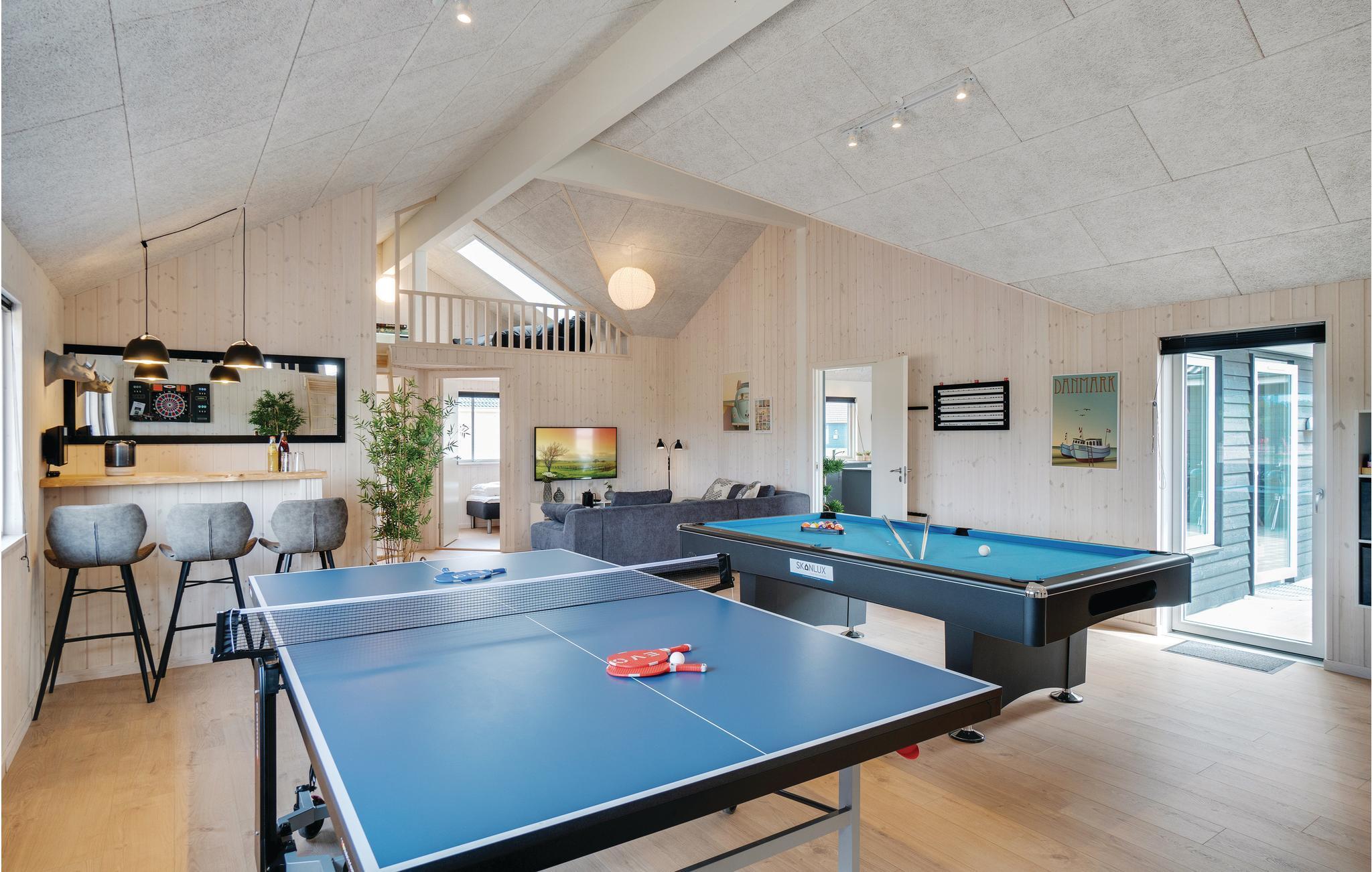 Dette luksuriøse og meget rummelige swimmingpool sommerhus er opført midt i det skønne sommerhusområde ved Houstrup. Her har I mulighed for en gennemført ferieoplevelse, uanset om I er til afslapning eller til aktiviteter. I husets eget badeland kan I nyde godt af den store pool med vandrutsjebane, svømmetræner, stort spabad med plads til 4-6 personer og sauna. Er I til aktiv ferie, så har sommerhuset rigeligt at byde på, hvad angår indendørs aktiviteter. Aktivitetsrummet indeholder både billard, bordtennis og fodboldspil samt et hyggeligt sofahjørne med fladskærm og Playstation4. Trådløst internet i huset er en selvfølge. Det flotte, yderst rummelige køkken har direkte forbindelse til stuen samt rummet hvor baren findes. Køkkenet rummer alle ønskværdige faciliteter, deriblandt to komfurer samt to køleskabe så der let kan laves og opbevares mad til alle.