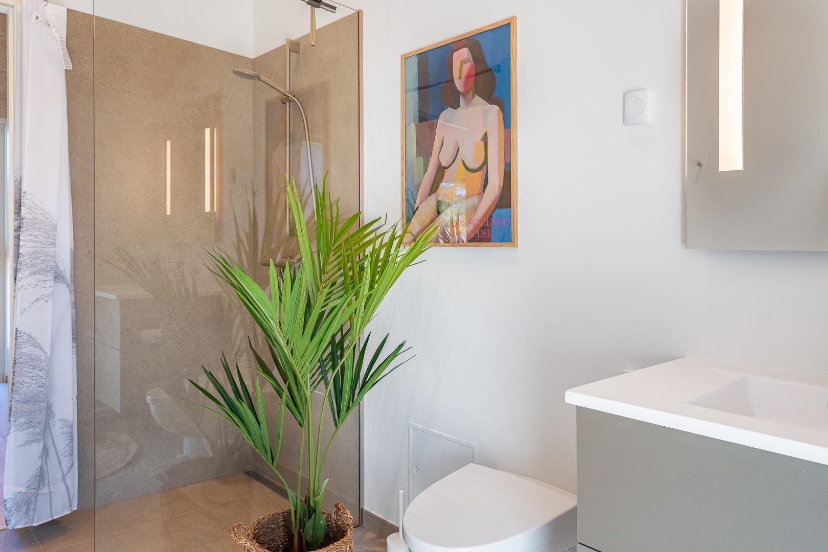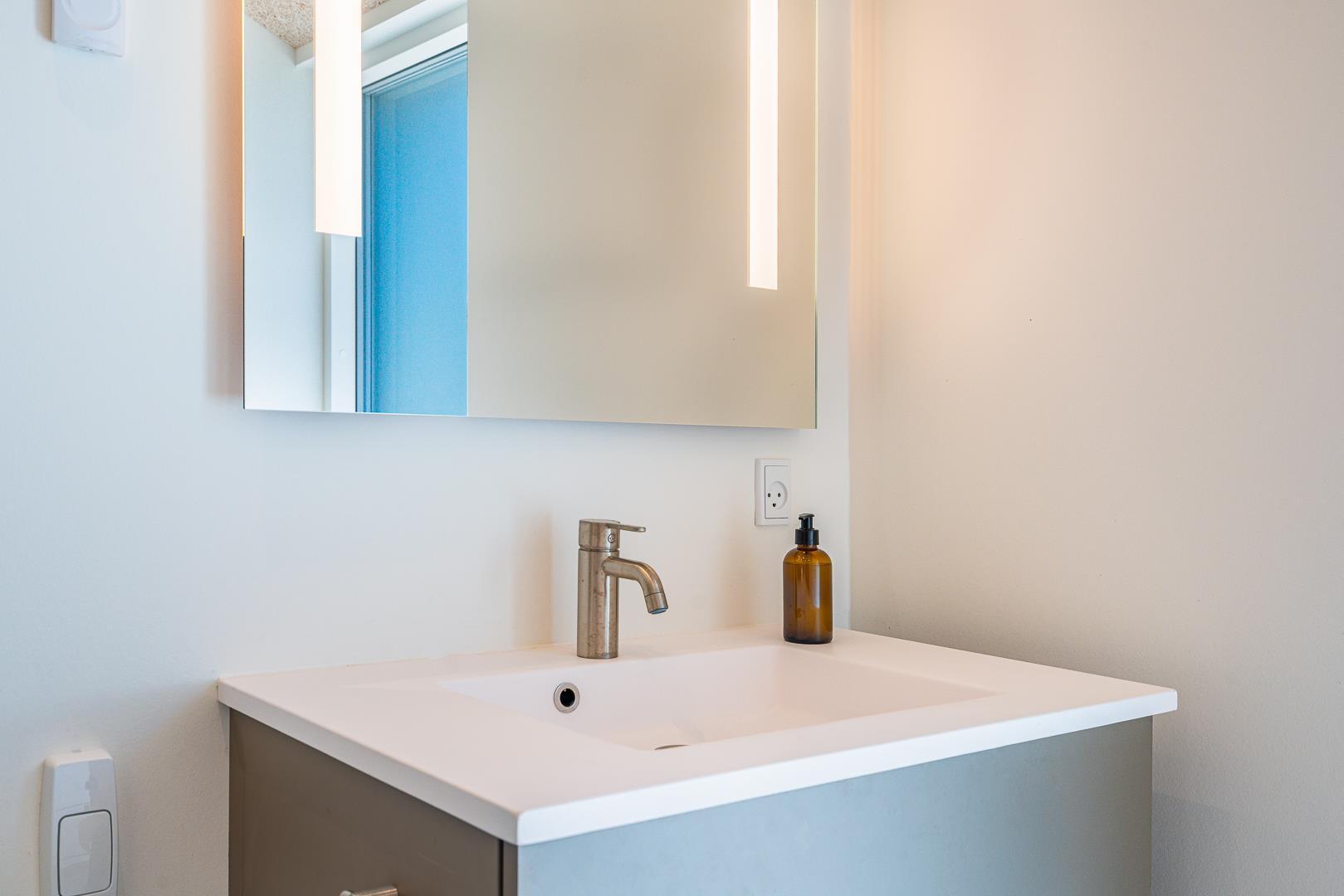 Det store, flotte køkken ligger i åben forbindelse med den smagfuldt indrettede stue, hvilket skaber et lyst og indbydende opholdsrum, hvor hele familien kan samles. Derudover er der en rummelig entré og to flotte badeværelser, begge udstyret med bruser.