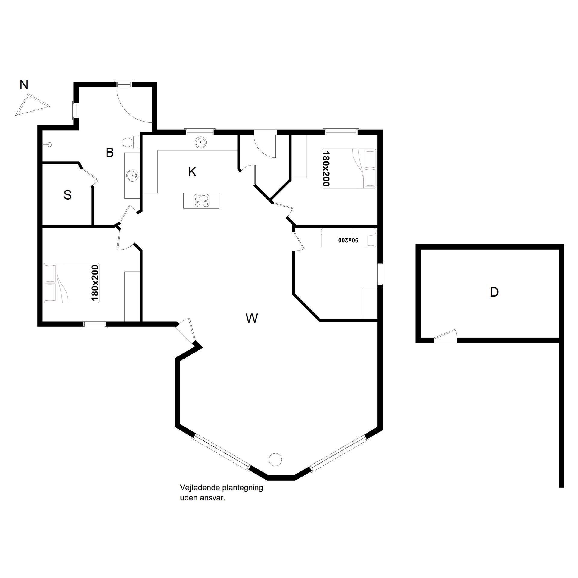 Sengestørrelser: 2 dobbeltsenge 180 x 200 cm + 1 køjeseng 90 x 200 cm.