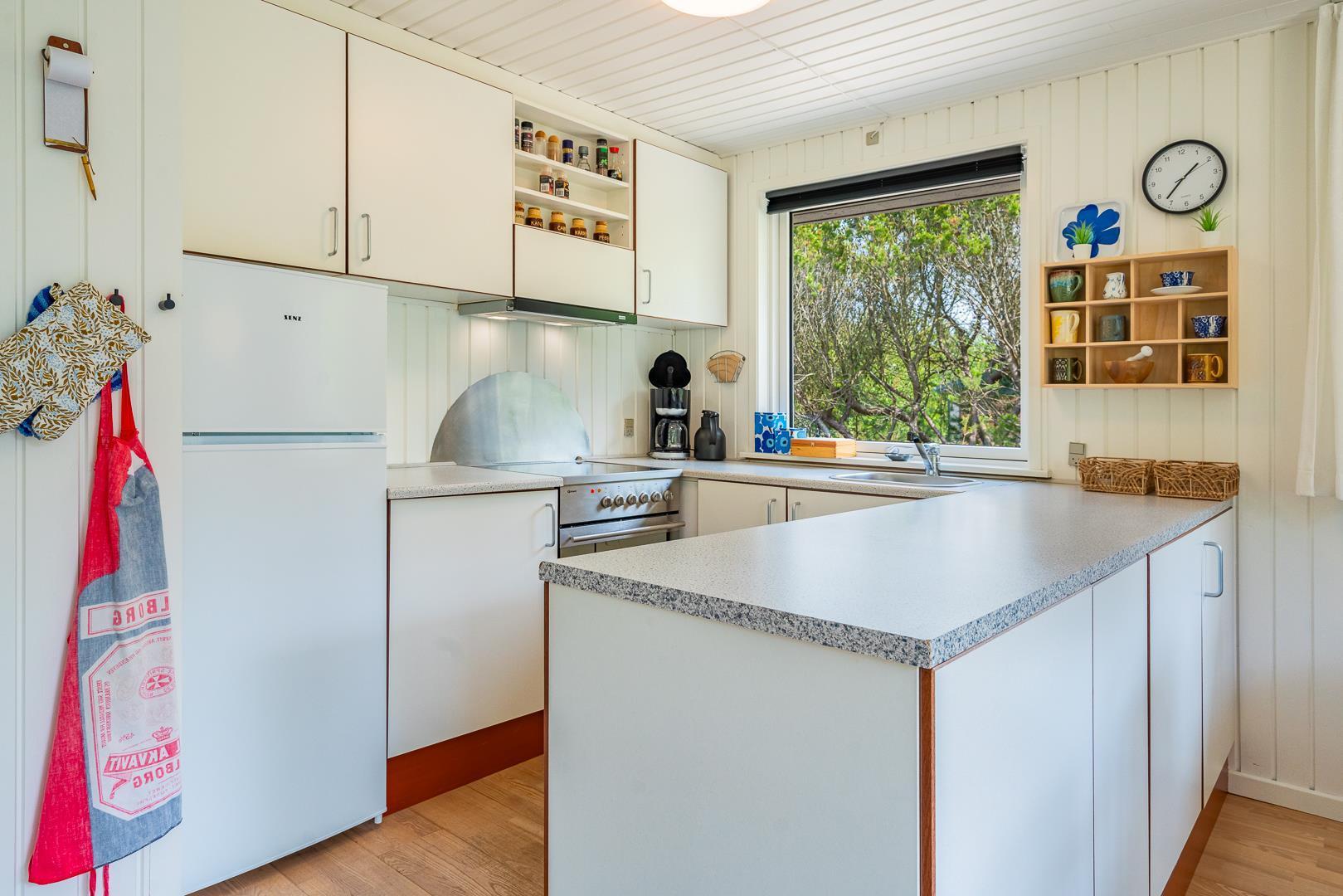 Det åbne køkken er funktionelt og veludstyret med blandt andet opvaskemaskine, keramisk komfur, ovn og kaffemaskine – så ferien føles nem og afslappet. Ved spisebordet kan I samles til måltider, kortspil og hyggelige aftener.