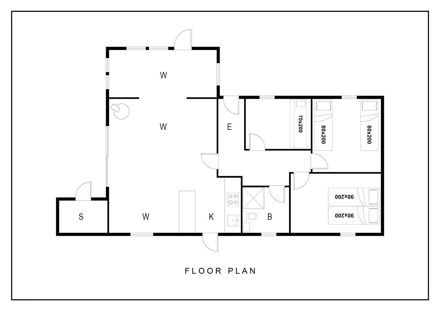 Sommerhuset har 3 soveværelser – perfekt indrettet til familier: Ét værelse med køjeseng (70x200 cm), ét med to enkeltsenge (80x200 cm) og ét med dobbeltseng (2 x 90x200 cm) – god komfort til både store og små. Badeværelset er enkelt og funktionelt med alt, hvad I har brug for til jeres daglige rutiner.