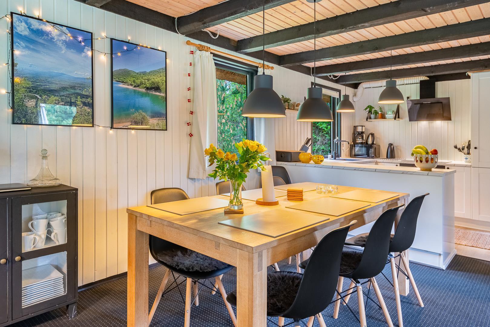 Indendørs byder sommerhuset på en hyggelig stue med synlige bjælker i loftet, som er i åben forbindelse med spiseafdelingen og køkkenet. Stuen er udstyret med fjernsyn med parabol. Her finder du også CD-afspiller, DVD-afspiller, Playstation samt en brændeovn, der skaber en varm og indbydende atmosfære i rummet. Spiseafdelingen har god plads til hele familien, hvilket gør det ideelt til fælles måltider og hyggelige stunder.