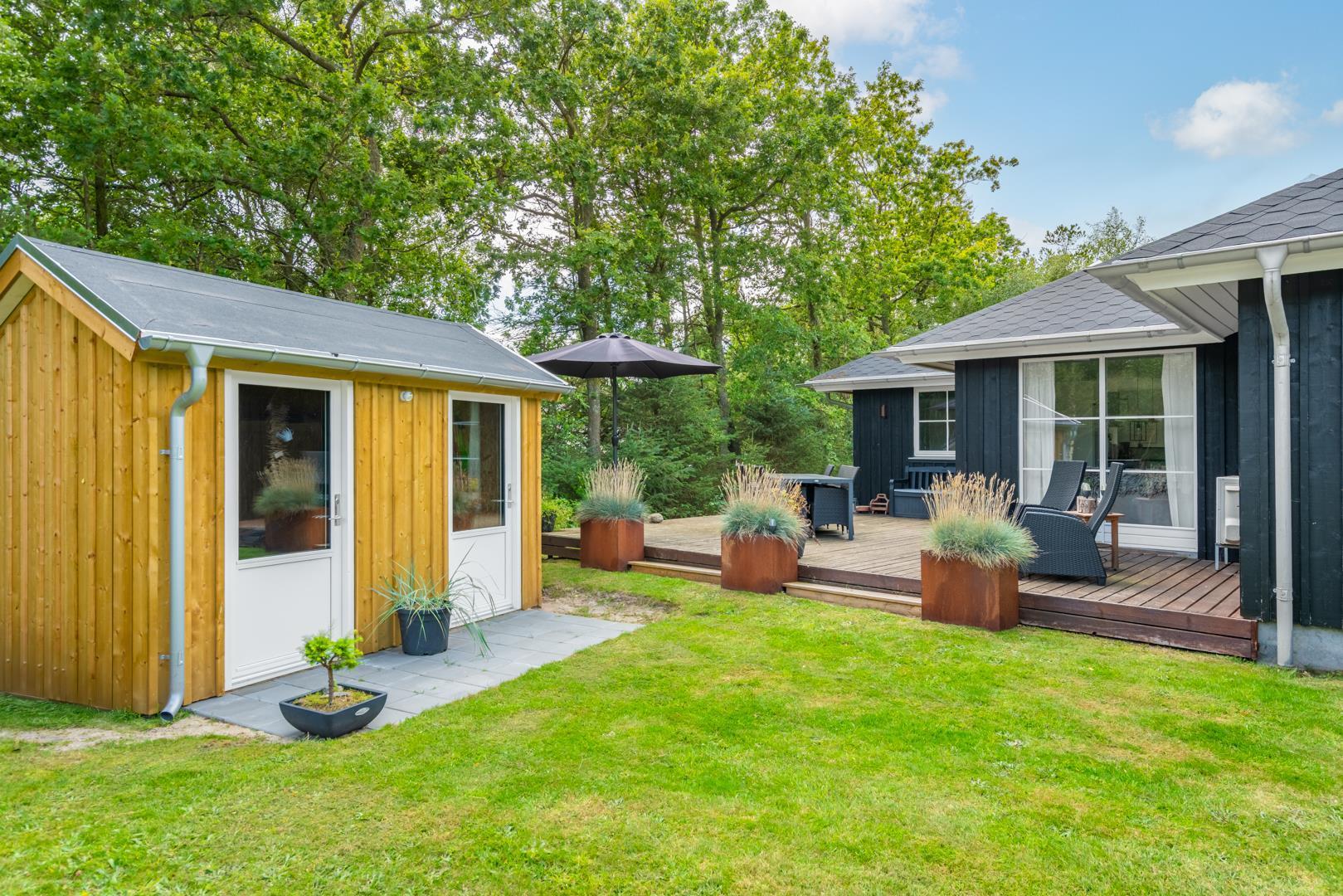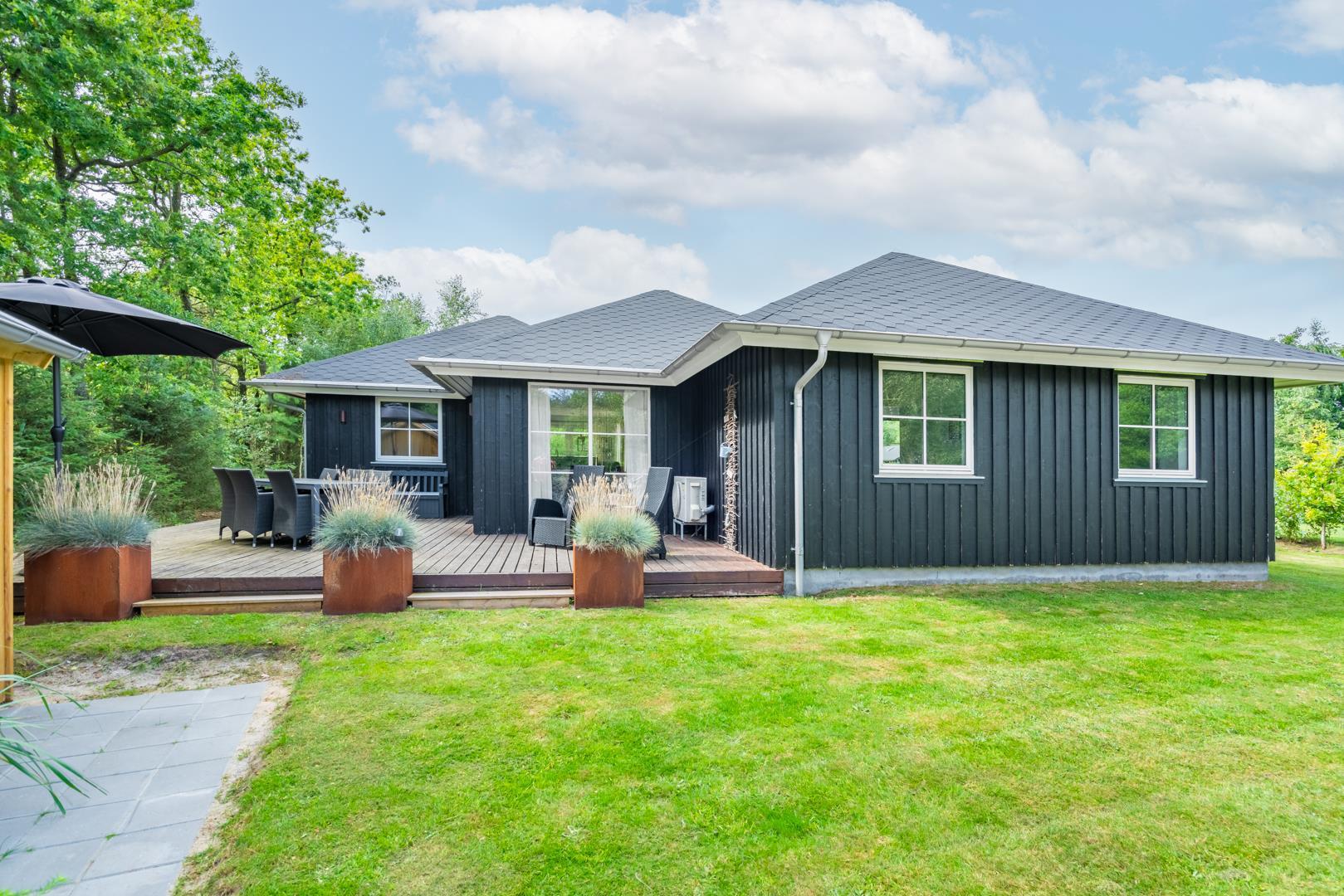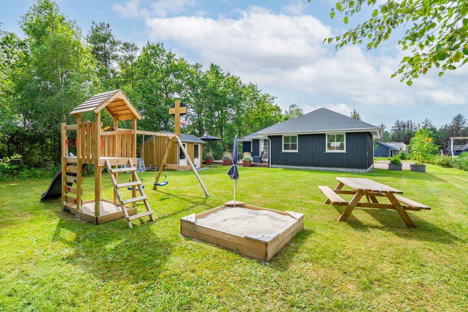 Udendørs er to store træterrasser, hvor der både er sol, læ og skygge i løbet af dagen. Her kan du nyde morgenkaffen eller et glas vin i aftensolen – og selvfølgelig tænde op i grillen til en hyggelig middag under åben himmel. Den store naturgrund byder på masser af plads til boldspil og leg, og børnene vil elske legetårnet og sandkassen.