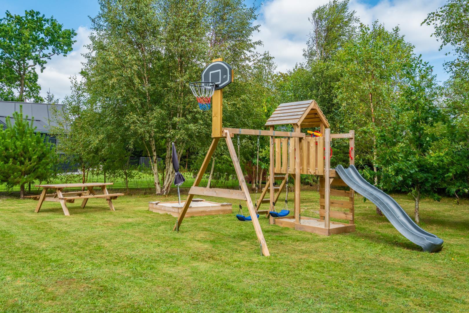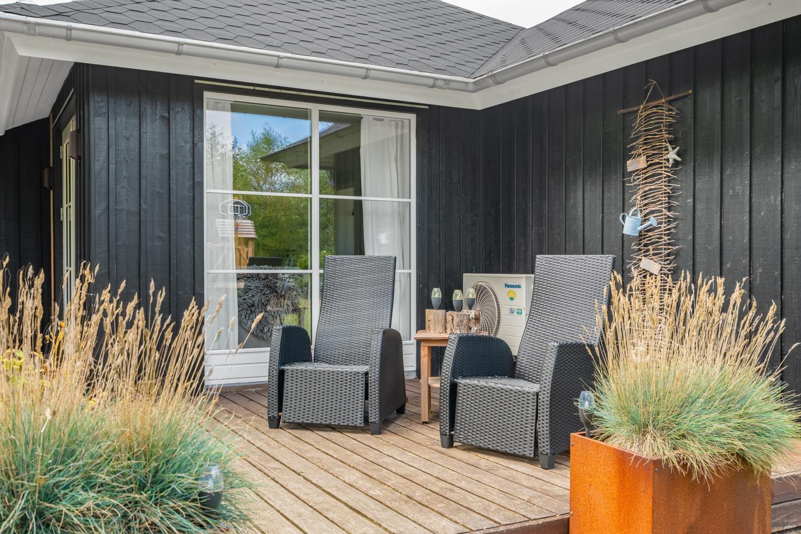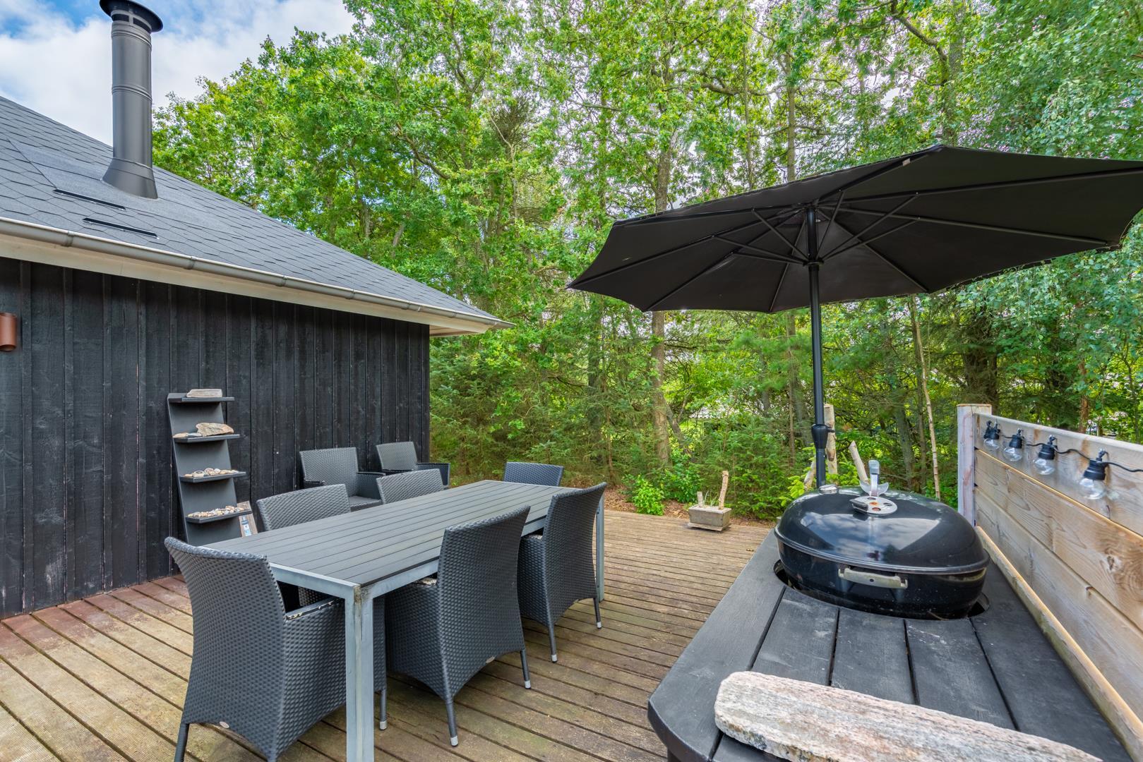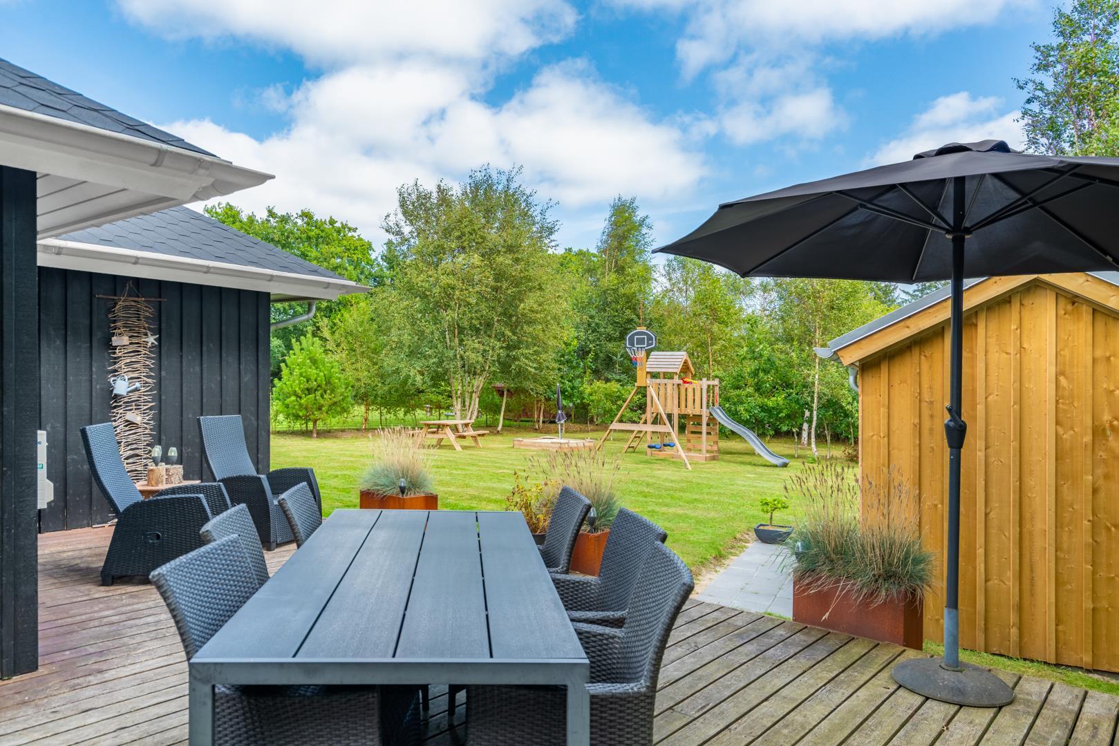Udendørs er to store træterrasser, hvor der både er sol, læ og skygge i løbet af dagen. Her kan du nyde morgenkaffen eller et glas vin i aftensolen – og selvfølgelig tænde op i grillen til en hyggelig middag under åben himmel. Den store naturgrund byder på masser af plads til boldspil og leg, og børnene vil elske legetårnet og sandkassen.