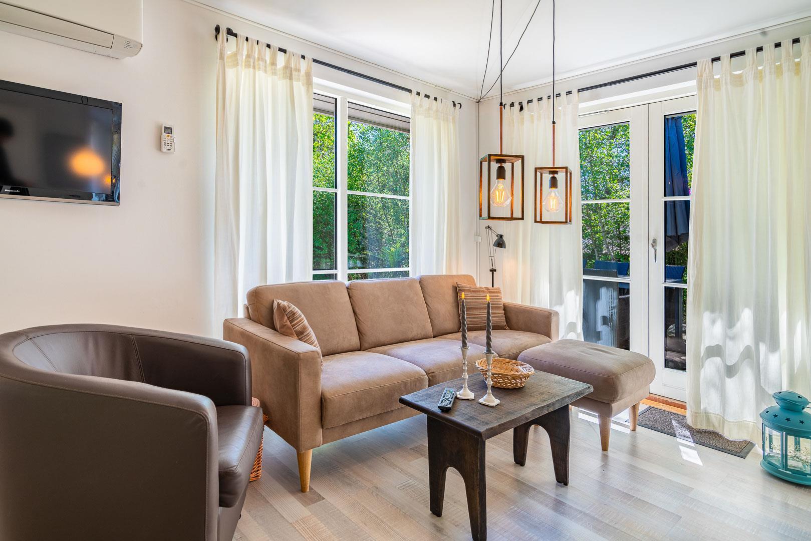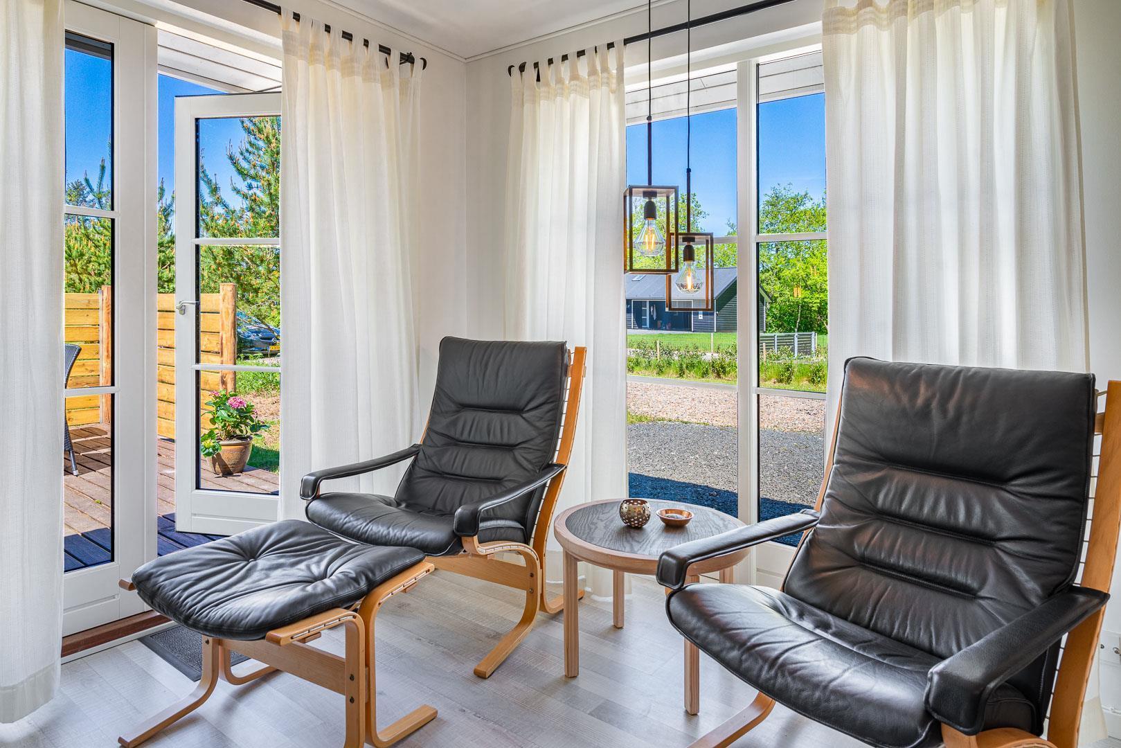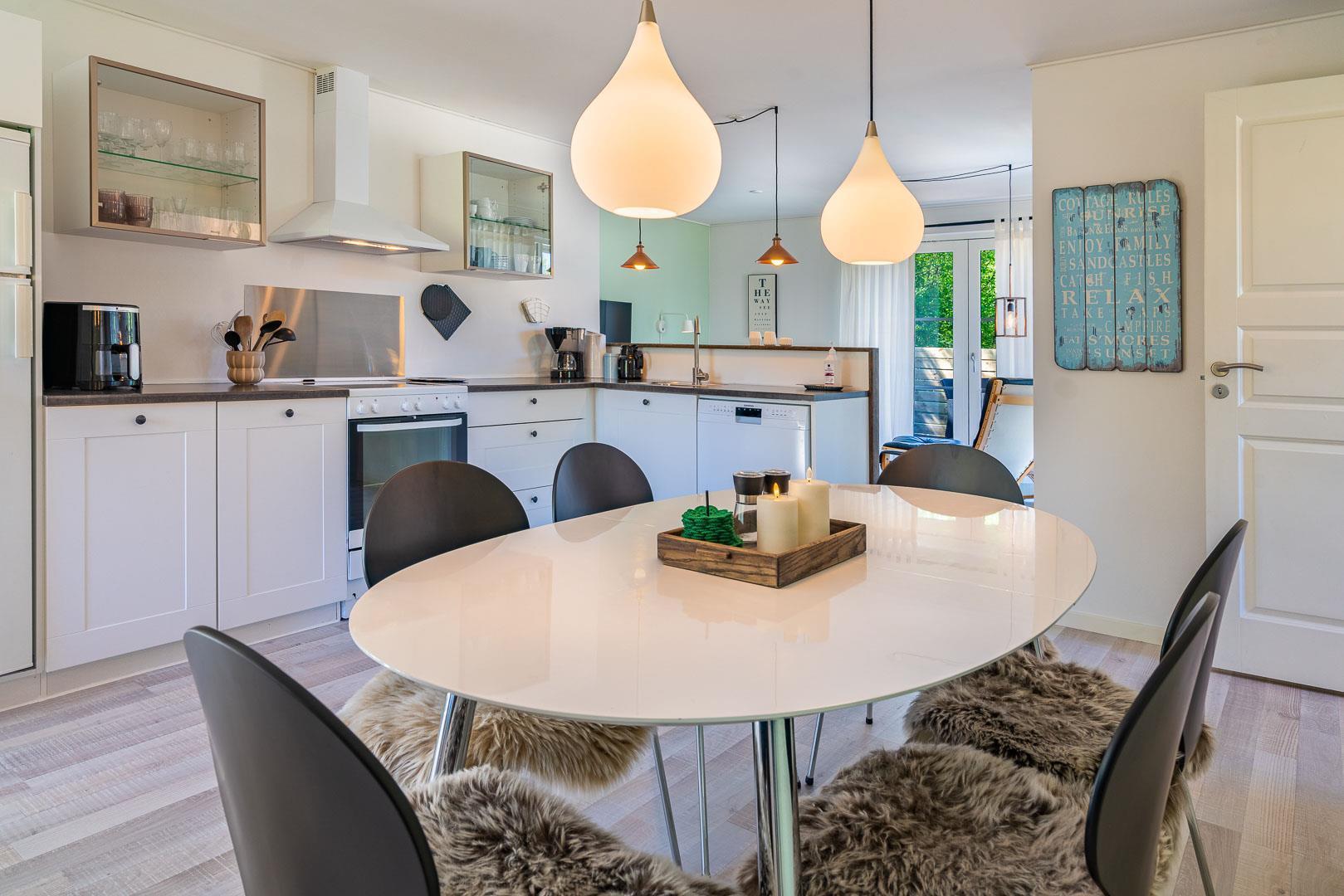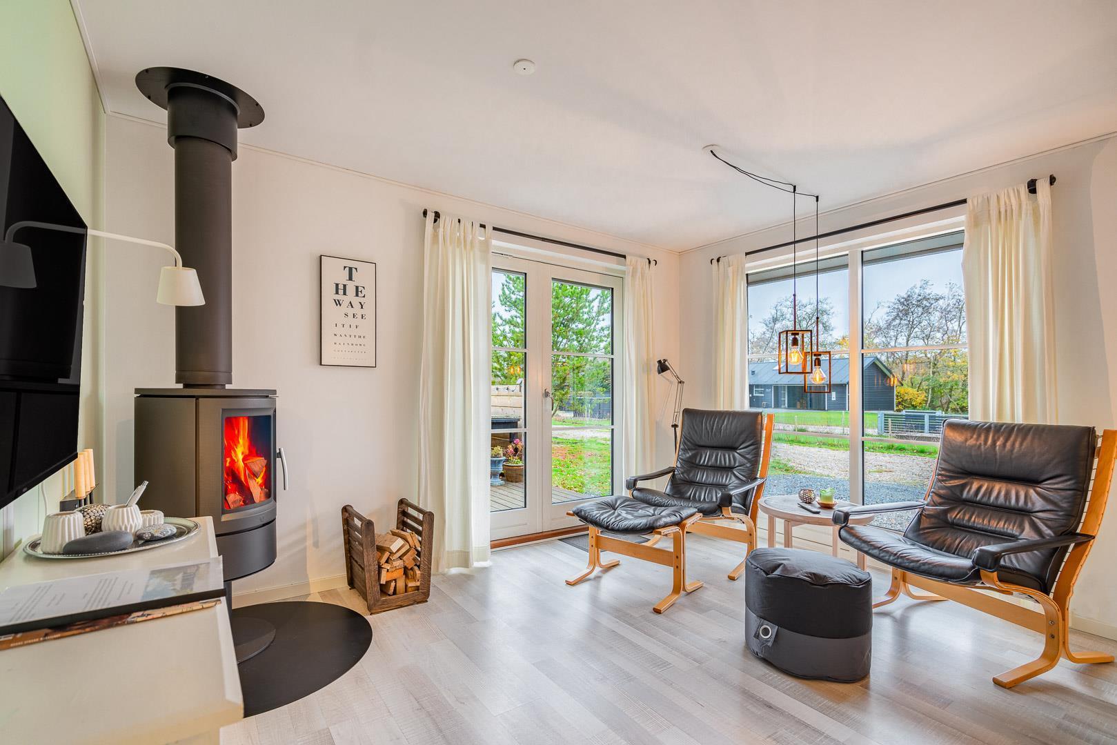 Det åbne køkken er moderne og veludstyret med opvaskemaskine og separat fryser, og hænger sammen med den lyse og hyggelige stue, hvor brændeovnen spreder varme og stemning. Her er også Chromecast-tv, gratis WiFi og en energivenlig varmepumpe, som sikrer godt klima året rundt. Der er selvfølgelig også vaskemaskine og tørretumbler, hvis behovet skulle opstå under ferien.
