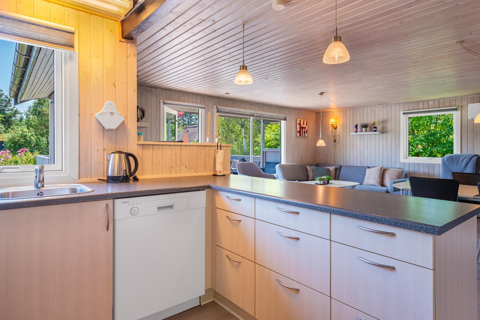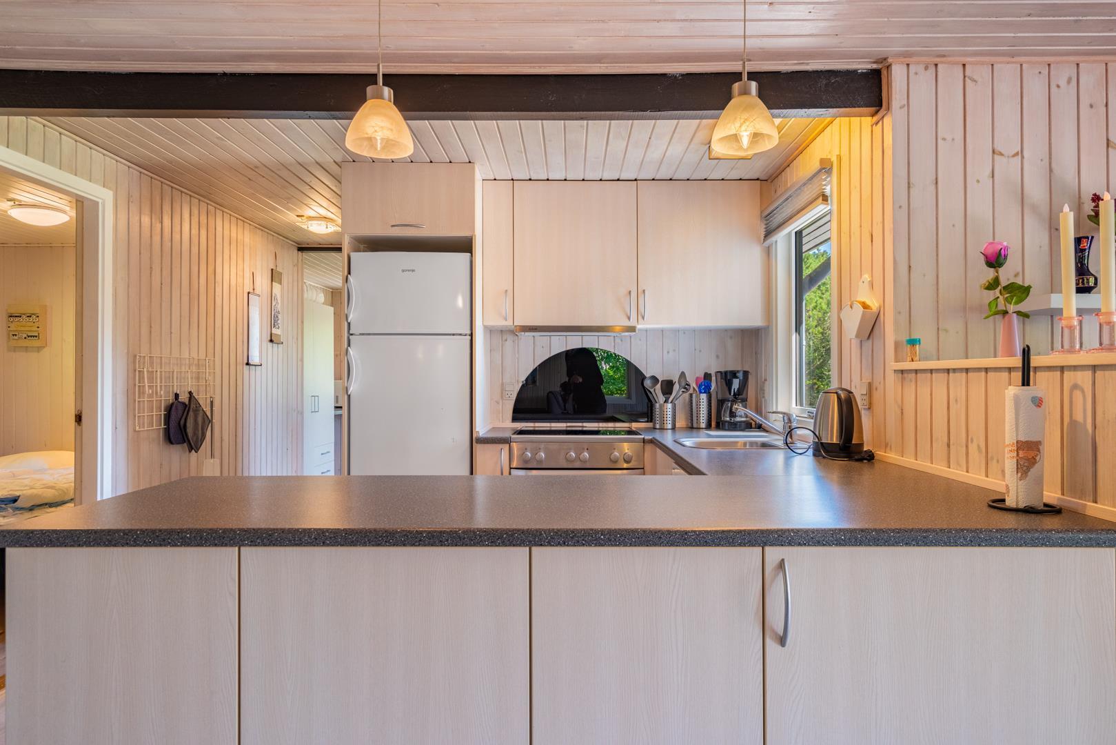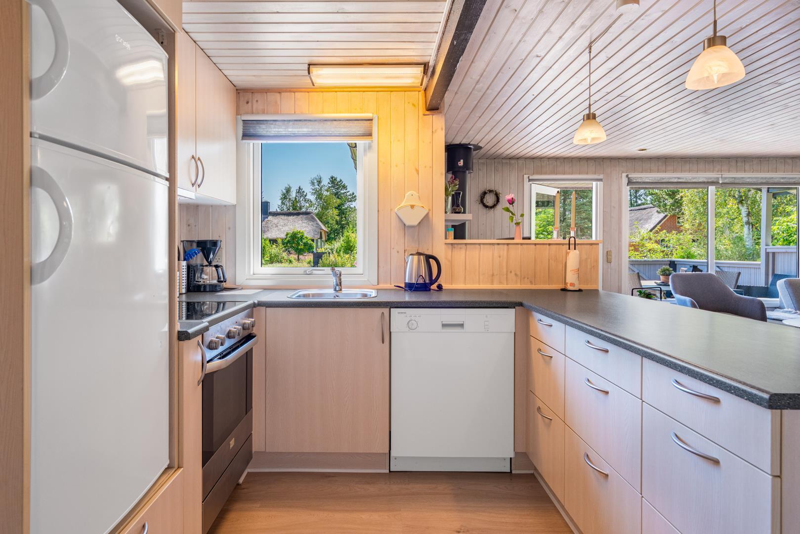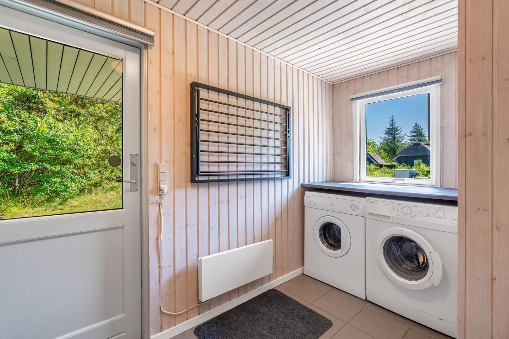 Køkkenet er åbent forbundet med stuen. Til længere ophold eller ferie med børn er det praktisk, at der er både vaskemaskine og tørretumbler i den rummelige entré. I det store skur er der plads til at stille cykler.