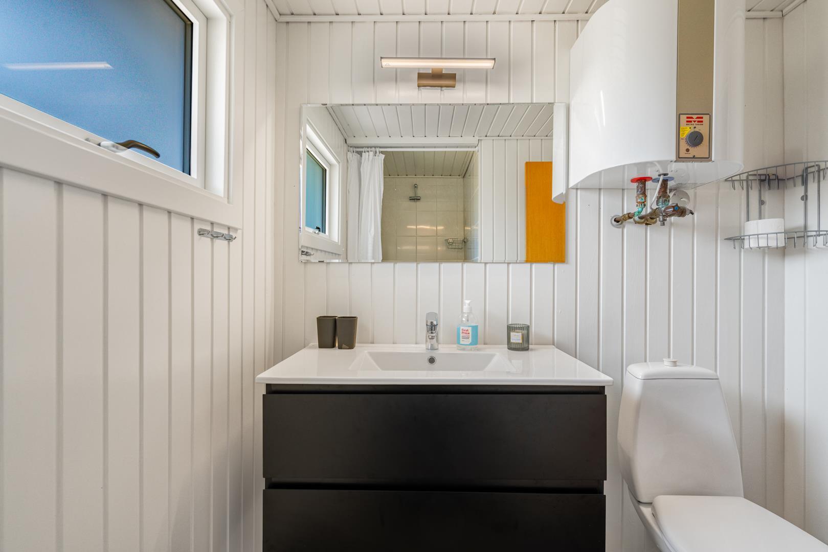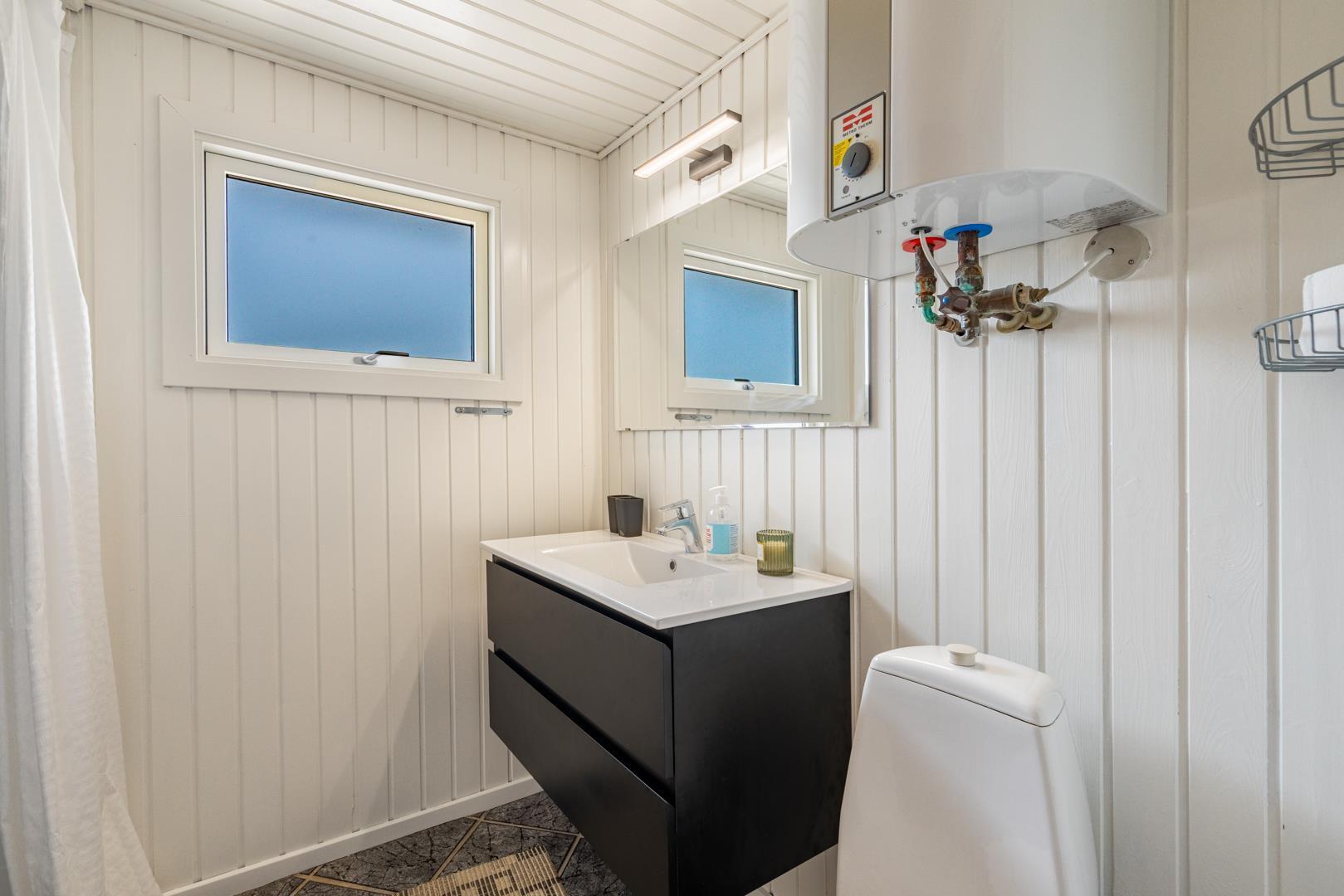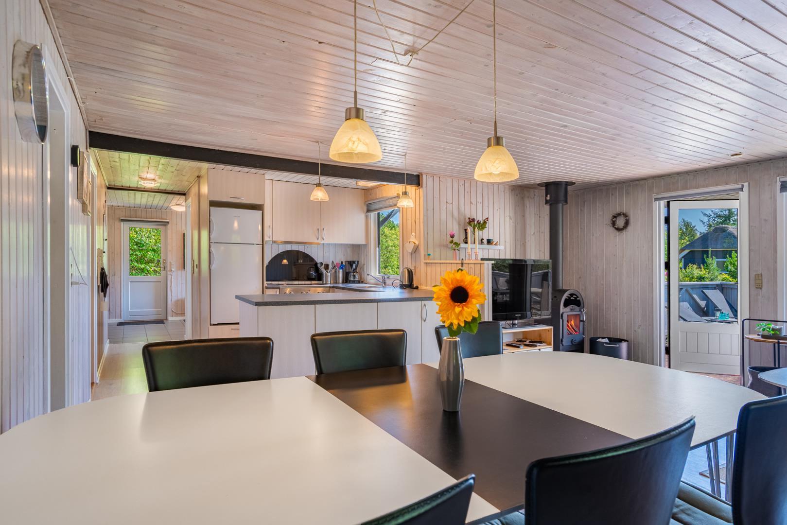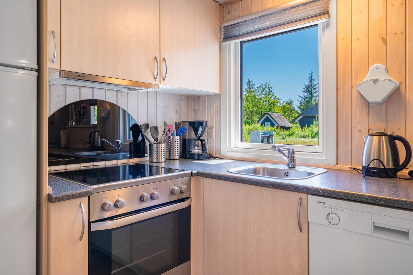 Køkkenet er åbent forbundet med stuen. Til længere ophold eller ferie med børn er det praktisk, at der er både vaskemaskine og tørretumbler i den rummelige entré. I det store skur er der plads til at stille cykler.
