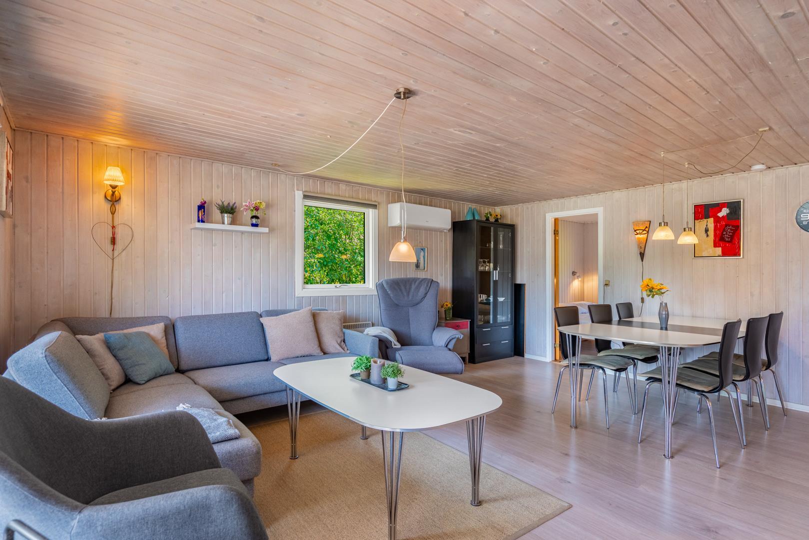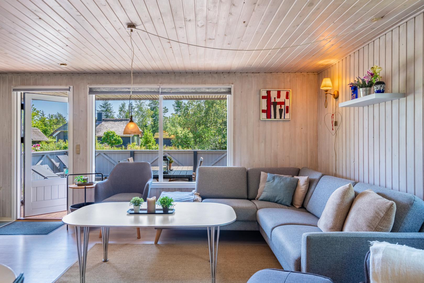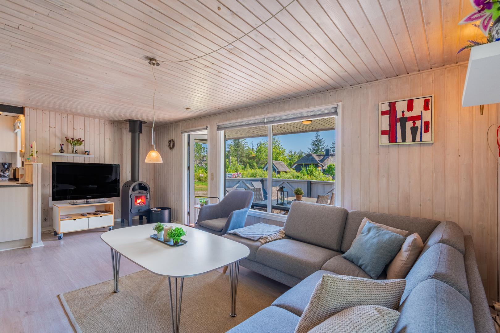 Veludstyret og hyggeligt indrettet sommerhus med en stor, dejlig stue med brændeovn og varmepumpe samt direkte adgang til en delvist overdækket terrasse på Hedevang 15.