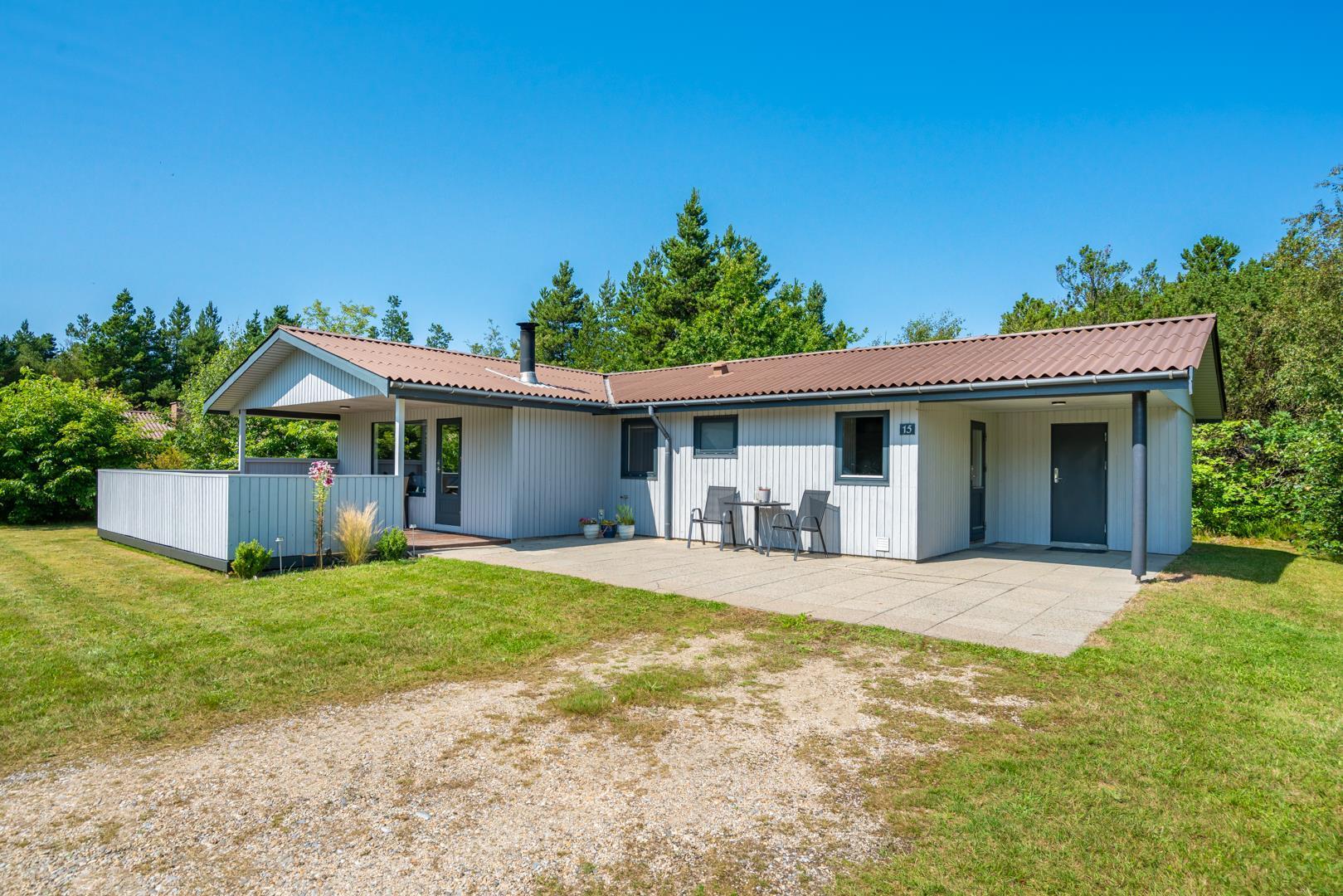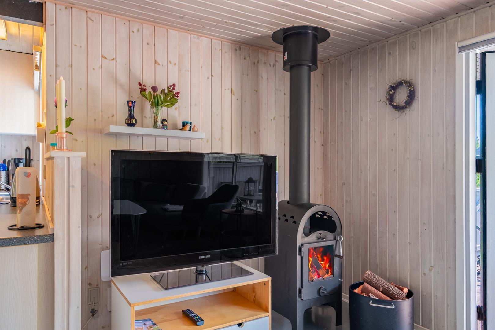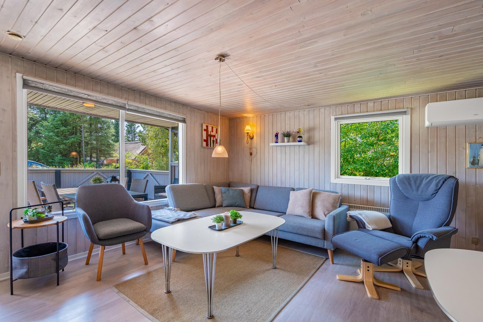 Veludstyret og hyggeligt indrettet sommerhus med en stor, dejlig stue med brændeovn og varmepumpe samt direkte adgang til en delvist overdækket terrasse på Hedevang 15.
