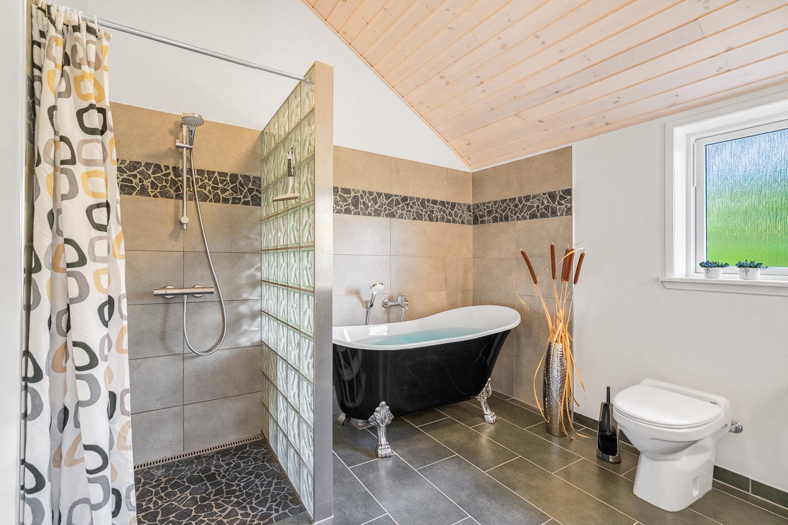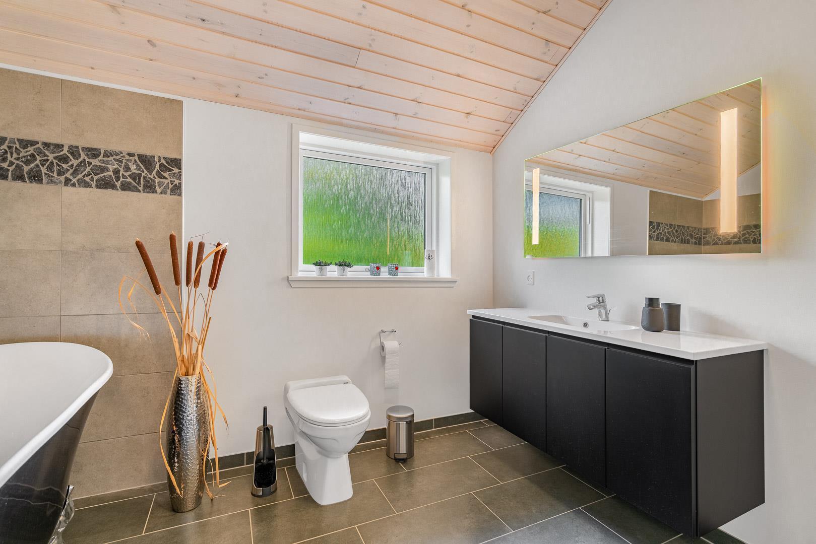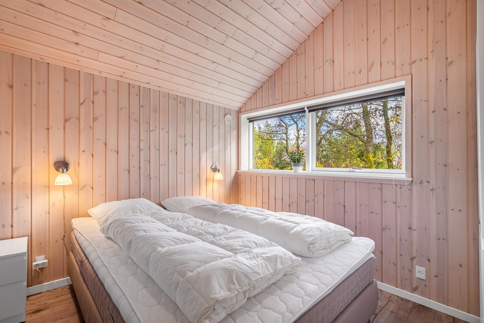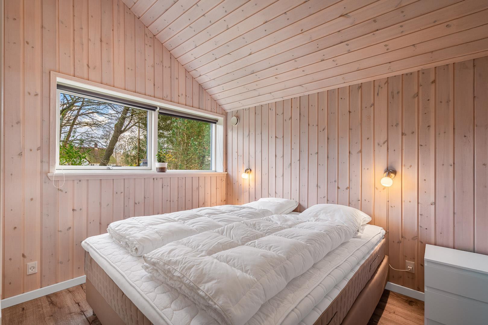 Der er plads til 6 personer i sommerhuset fordelt på tre gode soveværelser – to med dobbeltsenge og ét med enkeltsenge og eget TV. Huset byder desuden på to badeværelser med gulvvarme – og i det store badeværelse kan du slappe af i det elegante badekar.