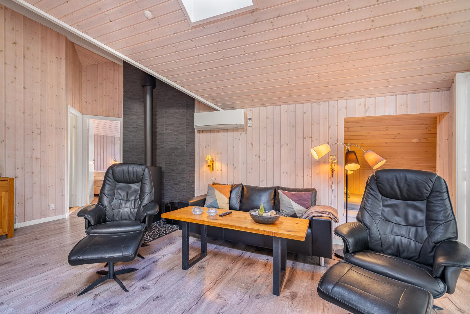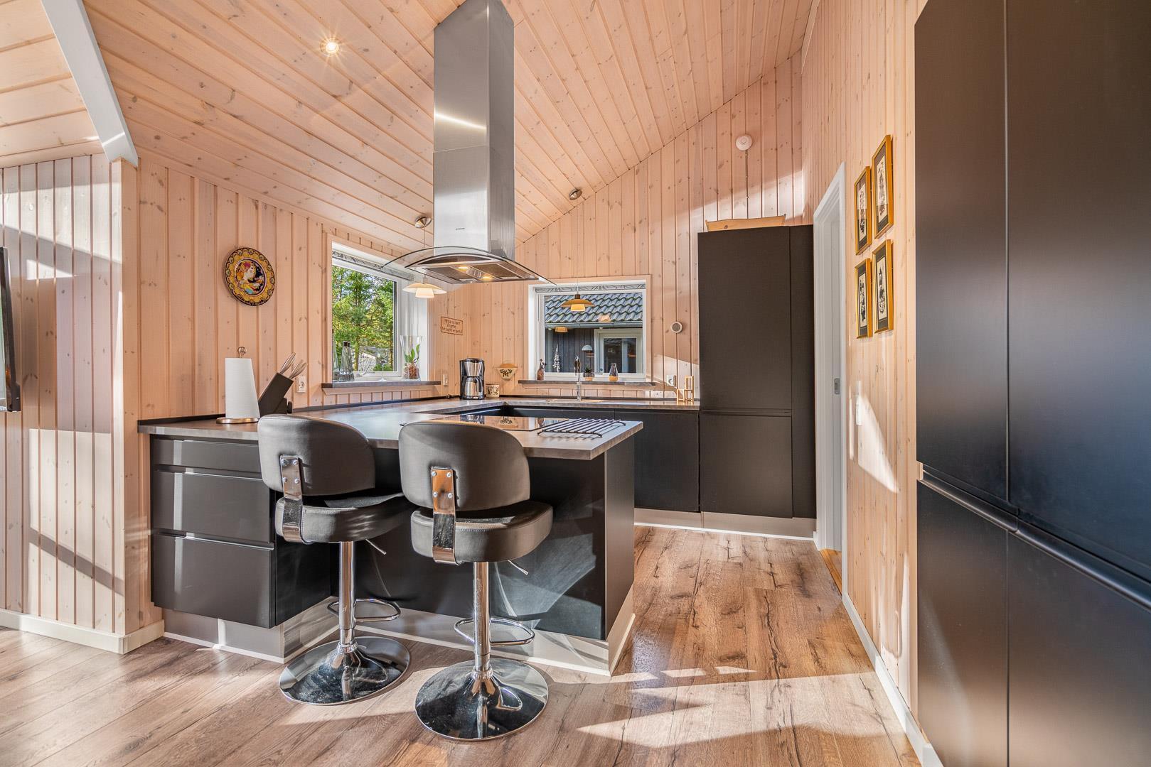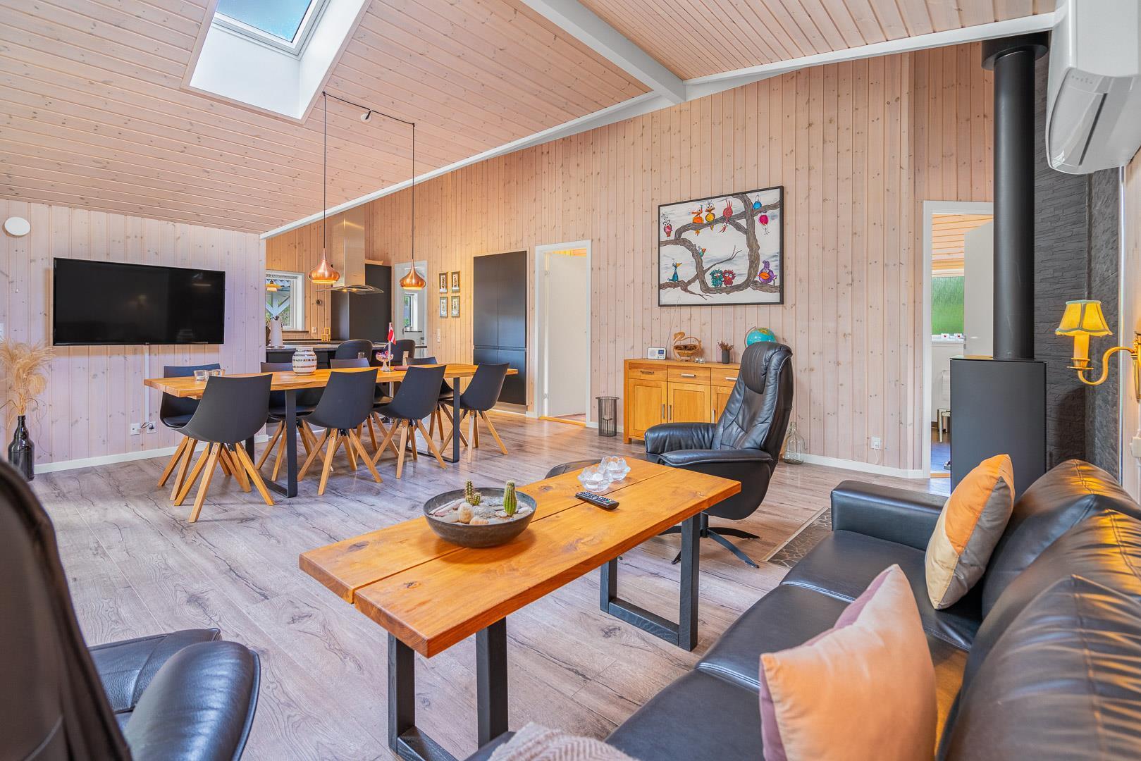 Indendørs mødes du af et lyst og rummeligt bryggers med vaskemaskine og tørretumbler, samt et stilfuldt og veludstyret køkken med bl.a. opvaskemaskine, mikroovn og 50l fryser. I stuen strømmer lyset ind gennem store vinduespartier og ovenlysvinduer, og brændeovnen og varmepumpen skaber både hygge og et godt indeklima. Stuen har en alkove, der fungerer som et hyggeligt lille gemmested – perfekt til børnene, hvor de kan lege og slappe af, eller som et stille hjørne til højtlæsning og afslapning for hele familien.