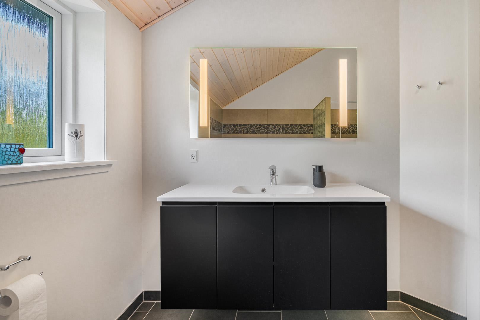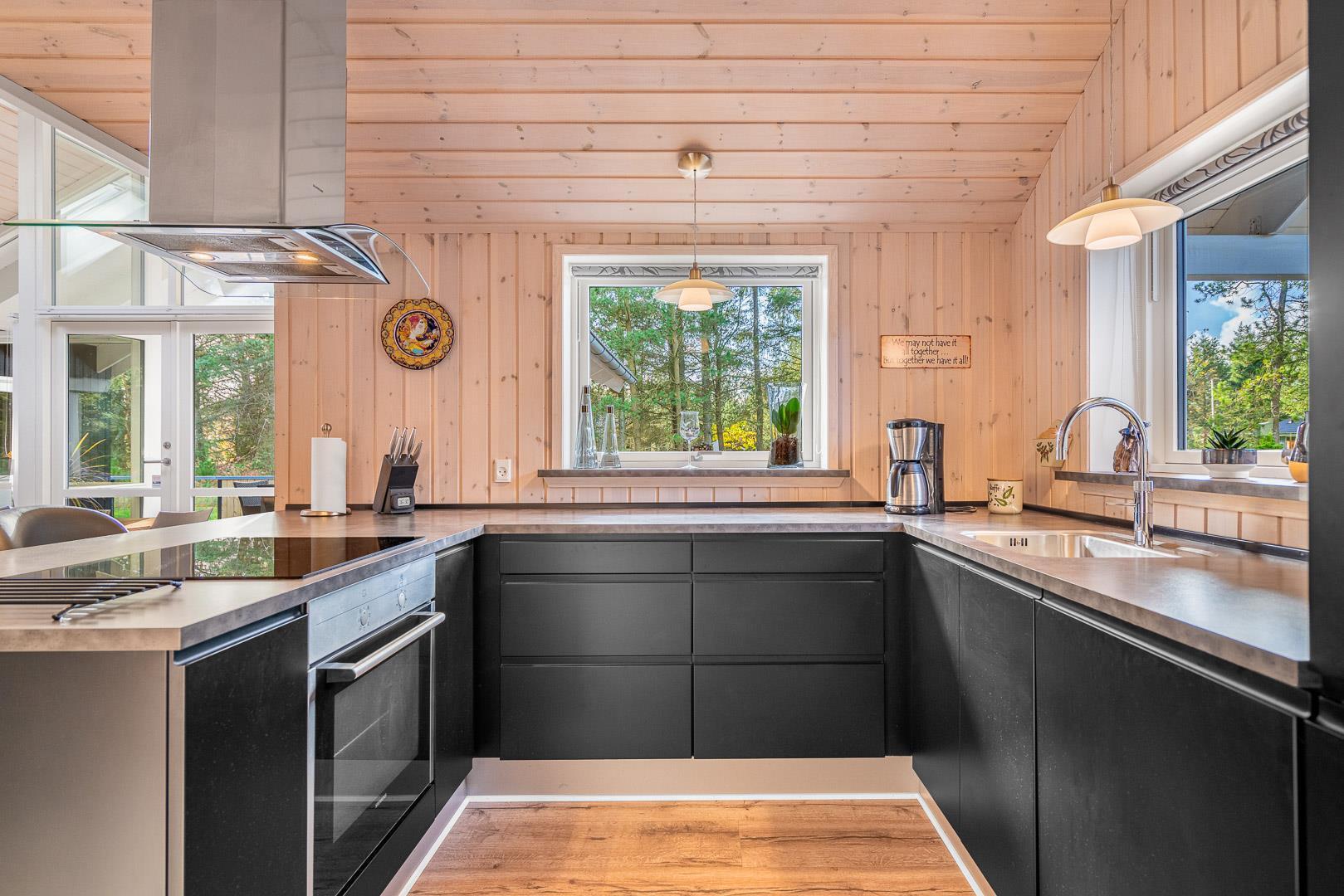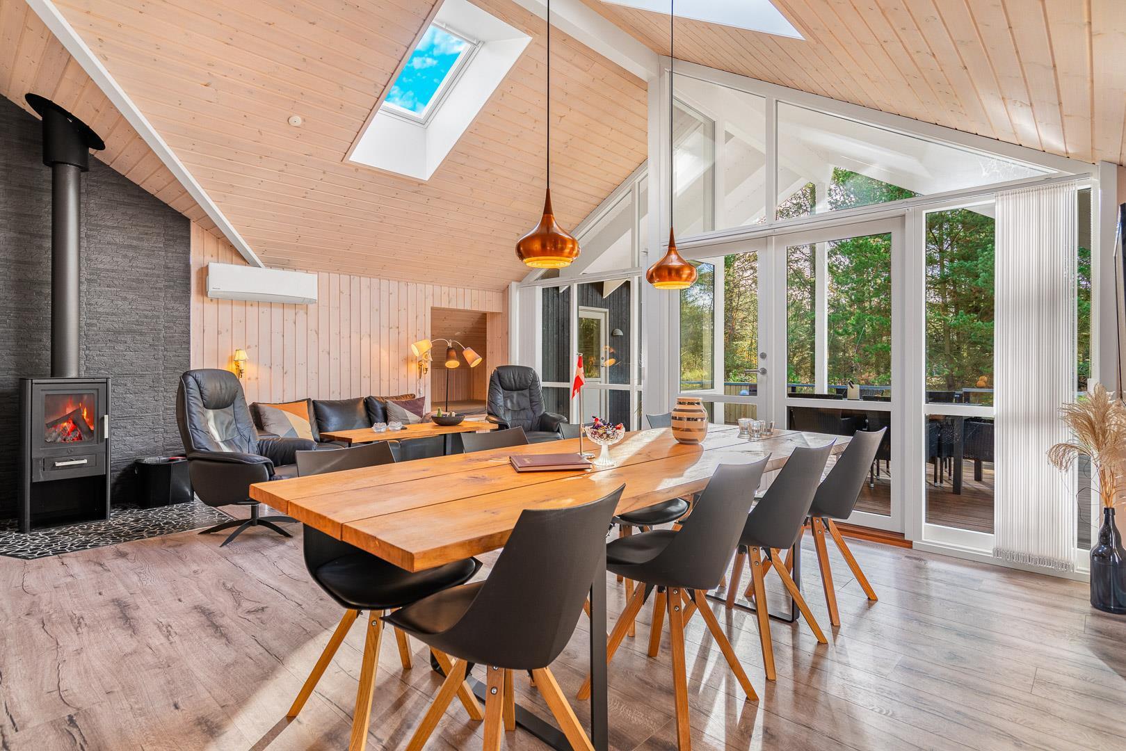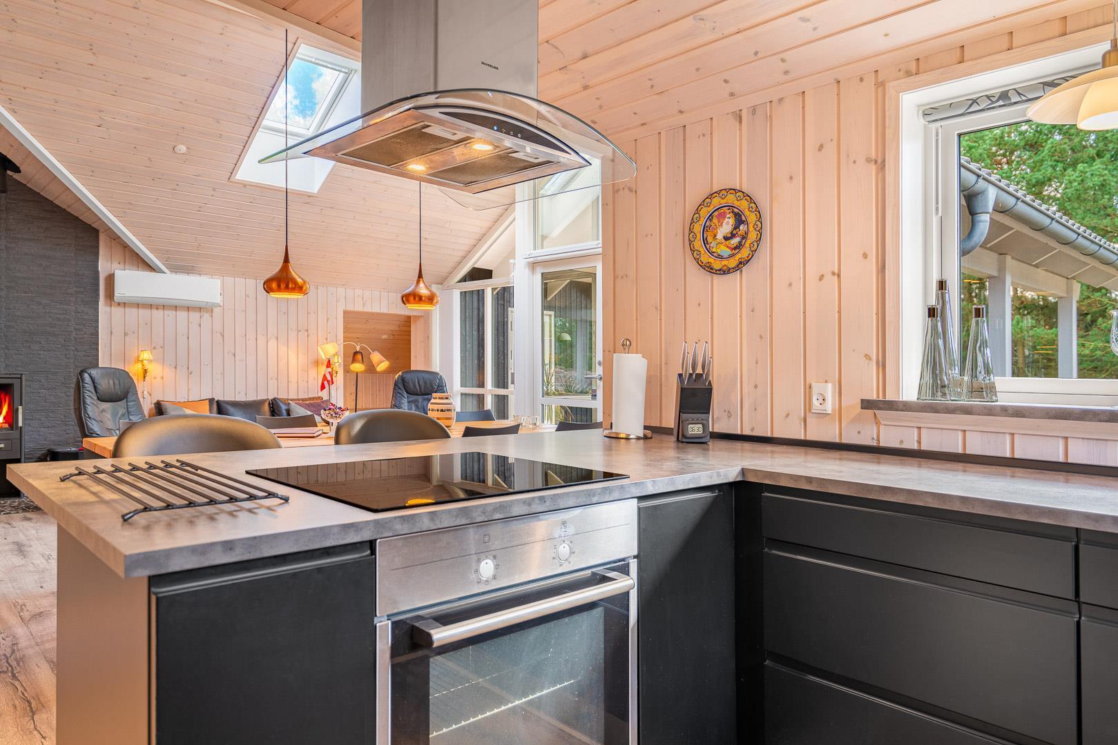 Indendørs mødes du af et lyst og rummeligt bryggers med vaskemaskine og tørretumbler, samt et stilfuldt og veludstyret køkken med bl.a. opvaskemaskine, mikroovn og 50l fryser. I stuen strømmer lyset ind gennem store vinduespartier og ovenlysvinduer, og brændeovnen og varmepumpen skaber både hygge og et godt indeklima. Stuen har en alkove, der fungerer som et hyggeligt lille gemmested – perfekt til børnene, hvor de kan lege og slappe af, eller som et stille hjørne til højtlæsning og afslapning for hele familien.