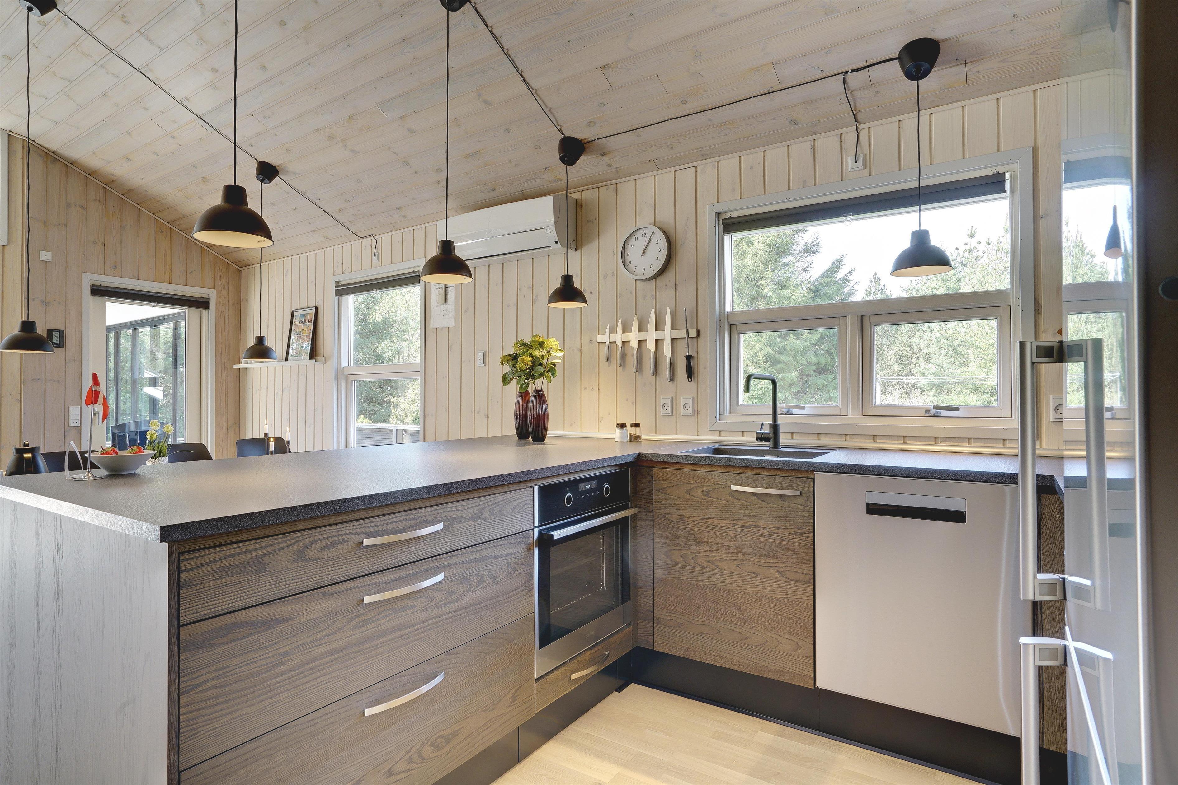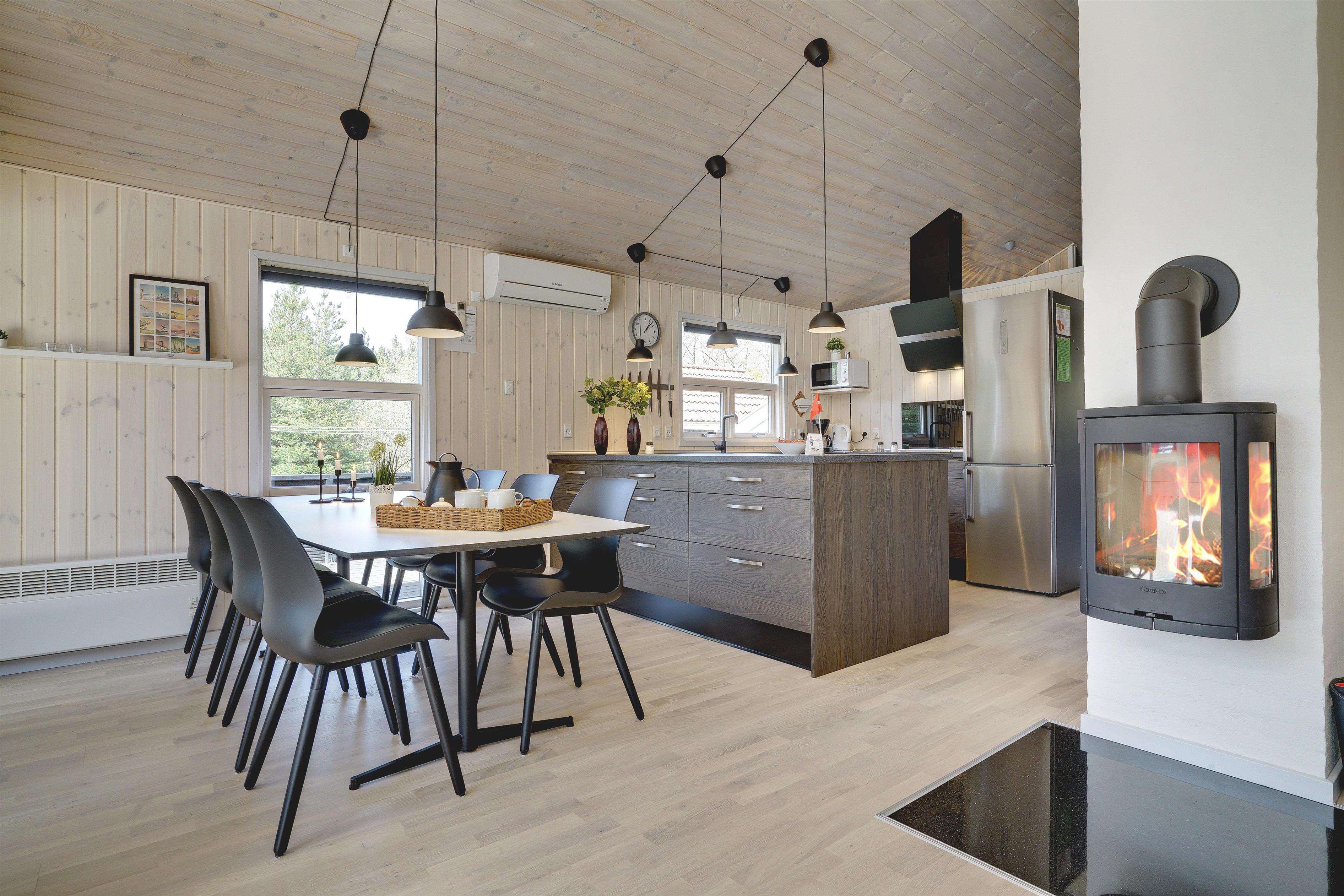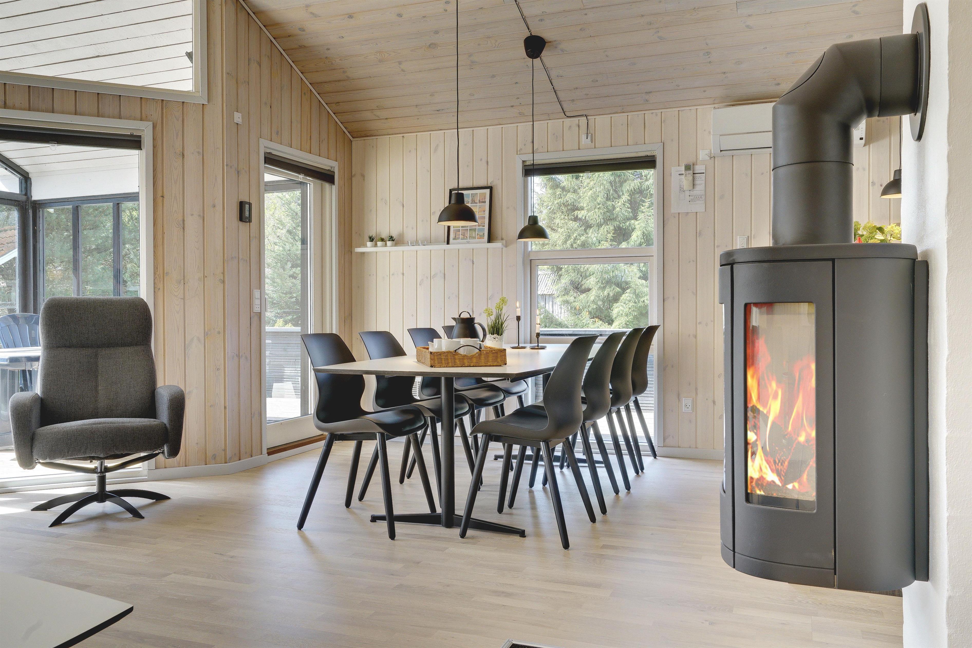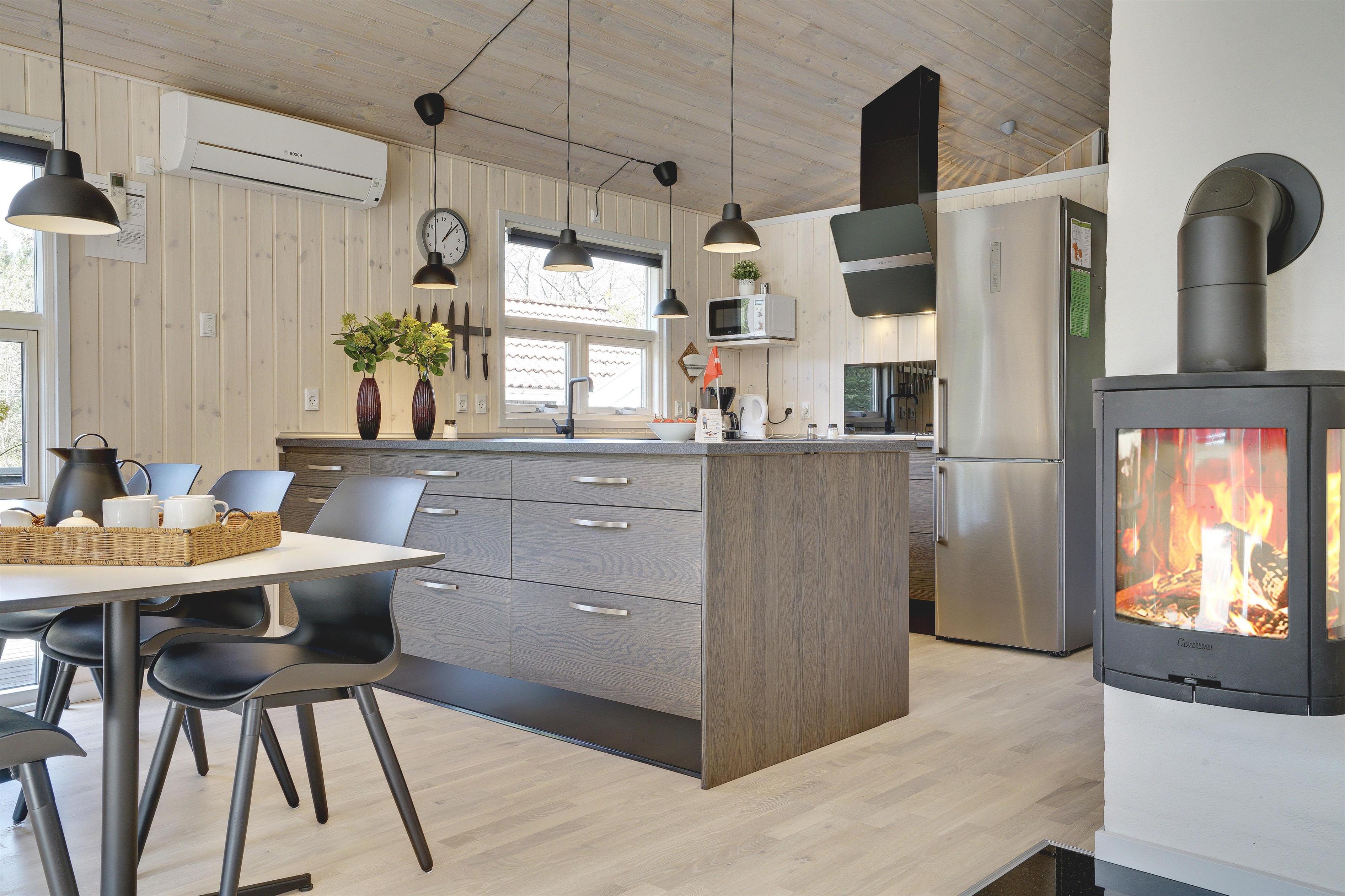 Køkken fra 2019 med opvaskemaskine og separat fryser på ca. 50l. Hyggelig stue med tv og brændeovn, sammen med spiseplads, hvorfra der er udgang til den dejlige terrasse.