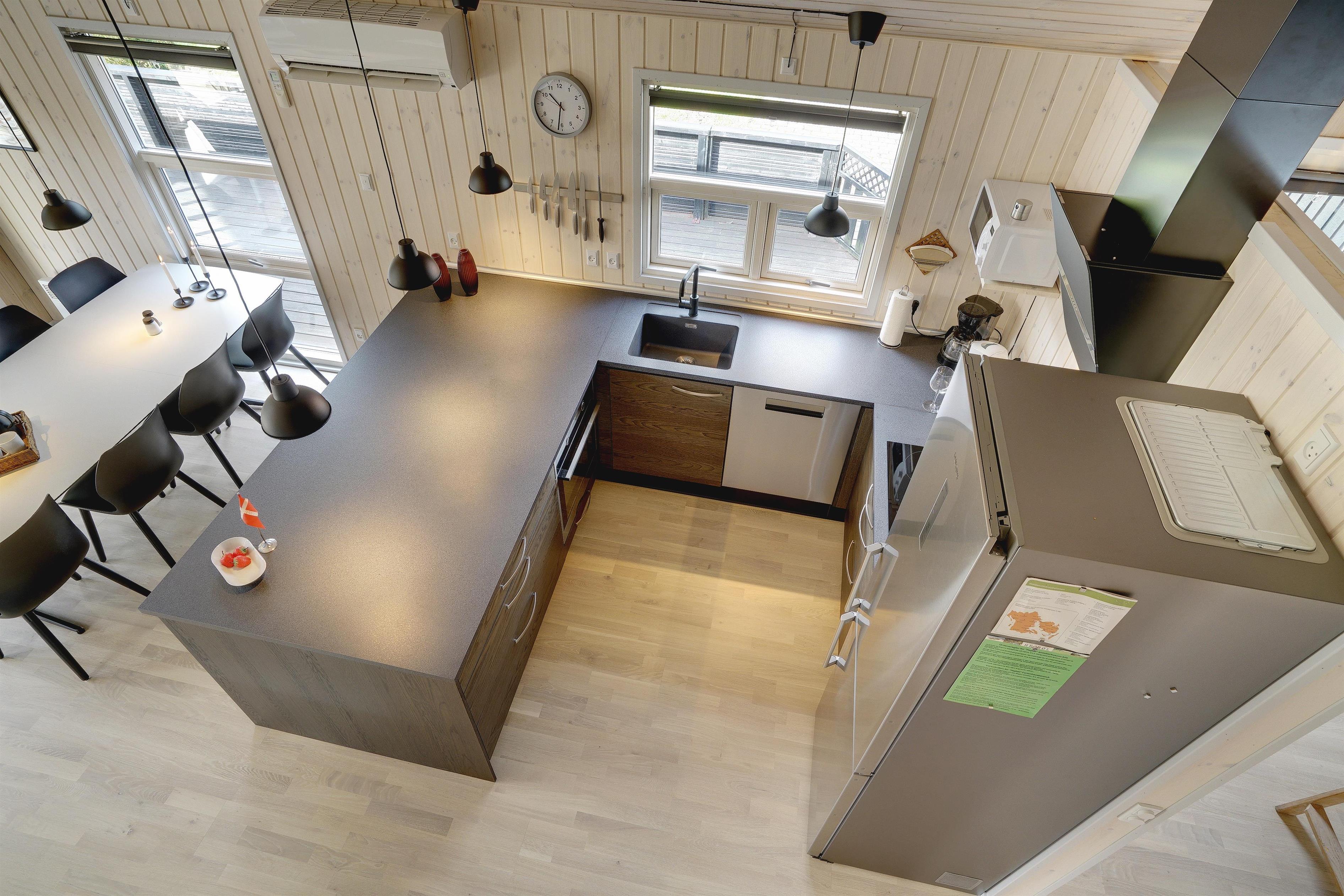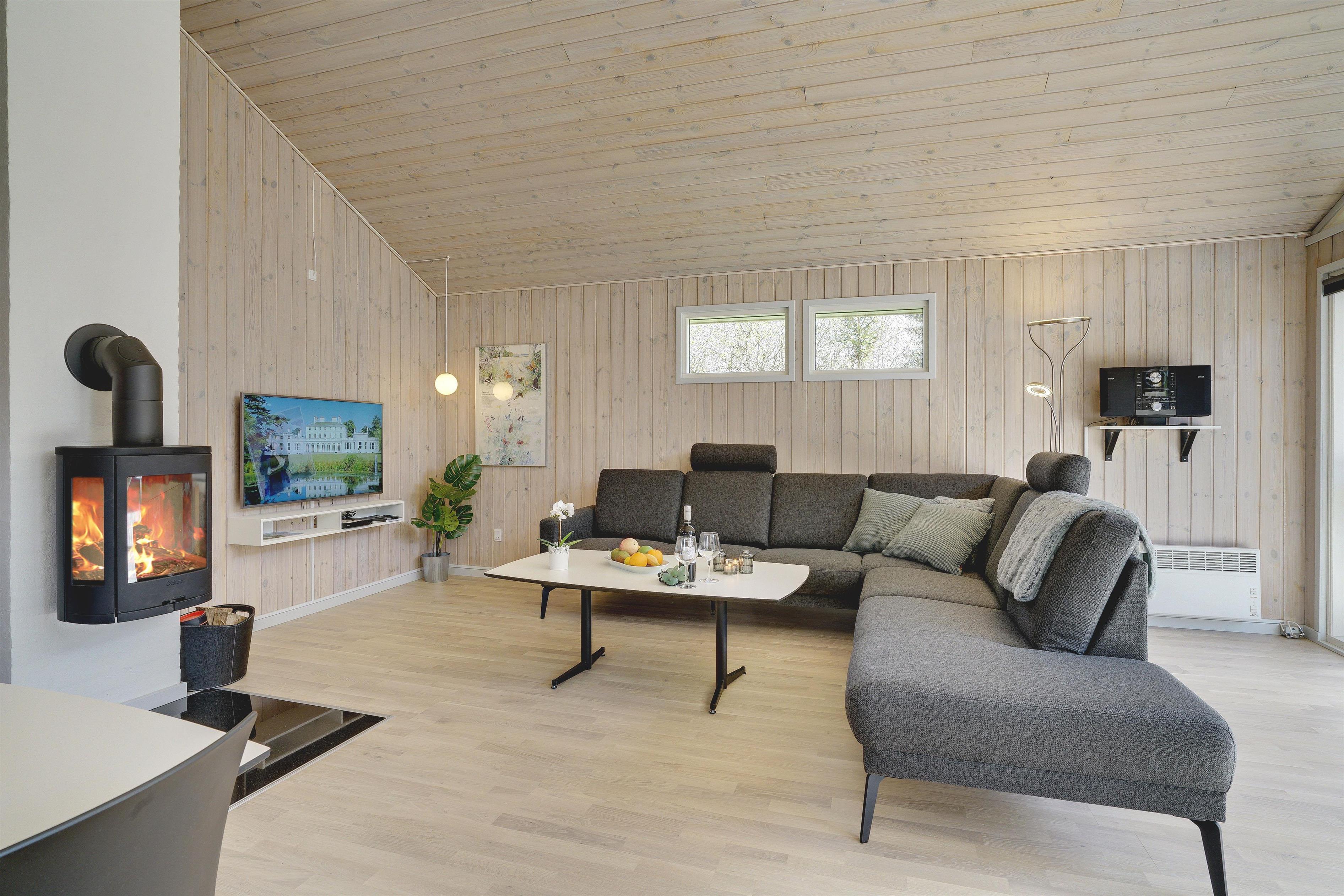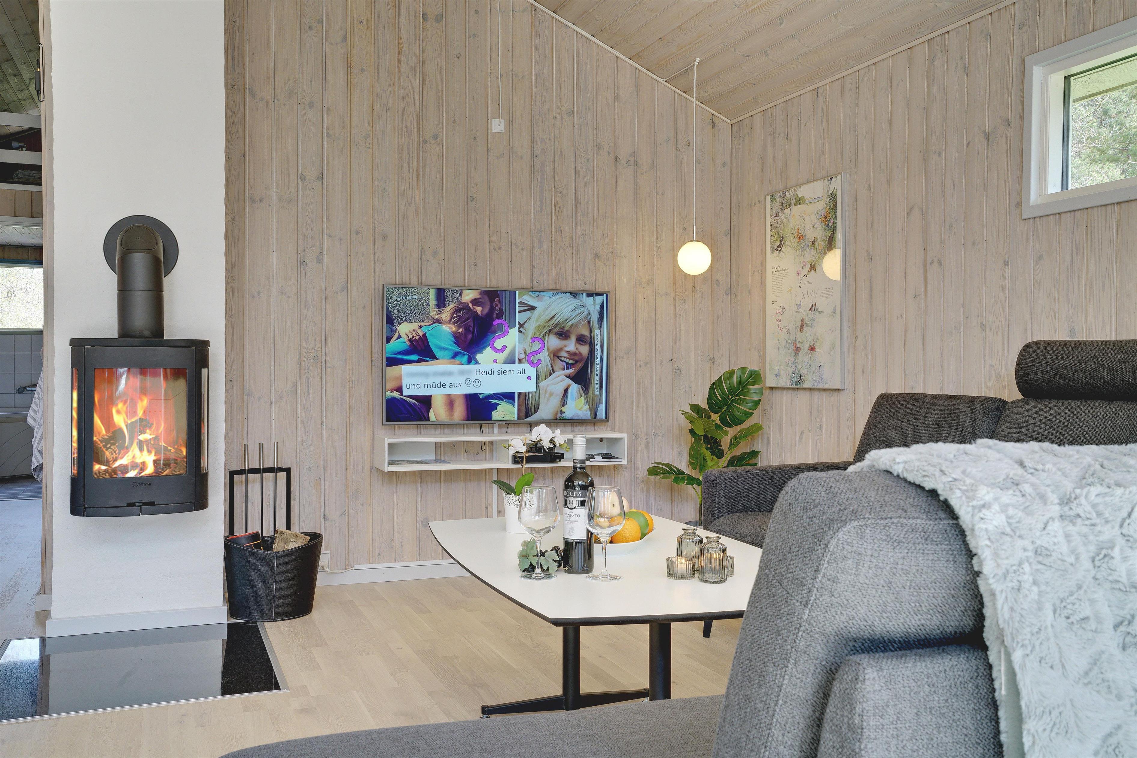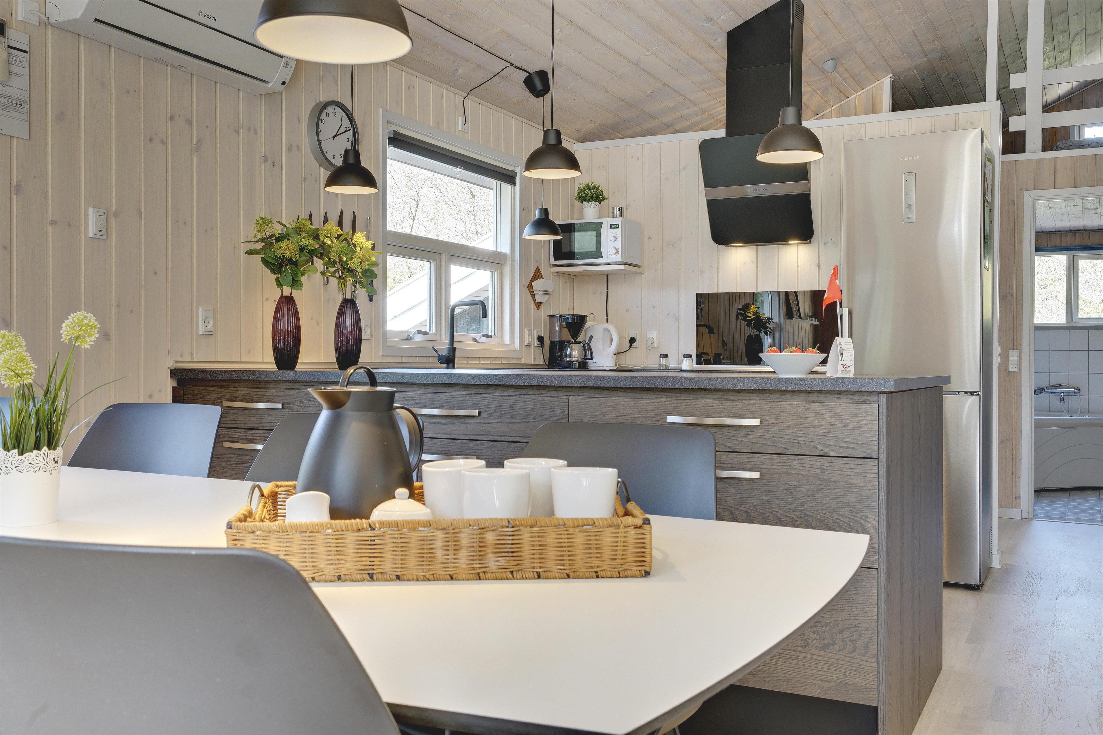 Køkken fra 2019 med opvaskemaskine og separat fryser på ca. 50l. Hyggelig stue med tv og brændeovn, sammen med spiseplads, hvorfra der er udgang til den dejlige terrasse.
