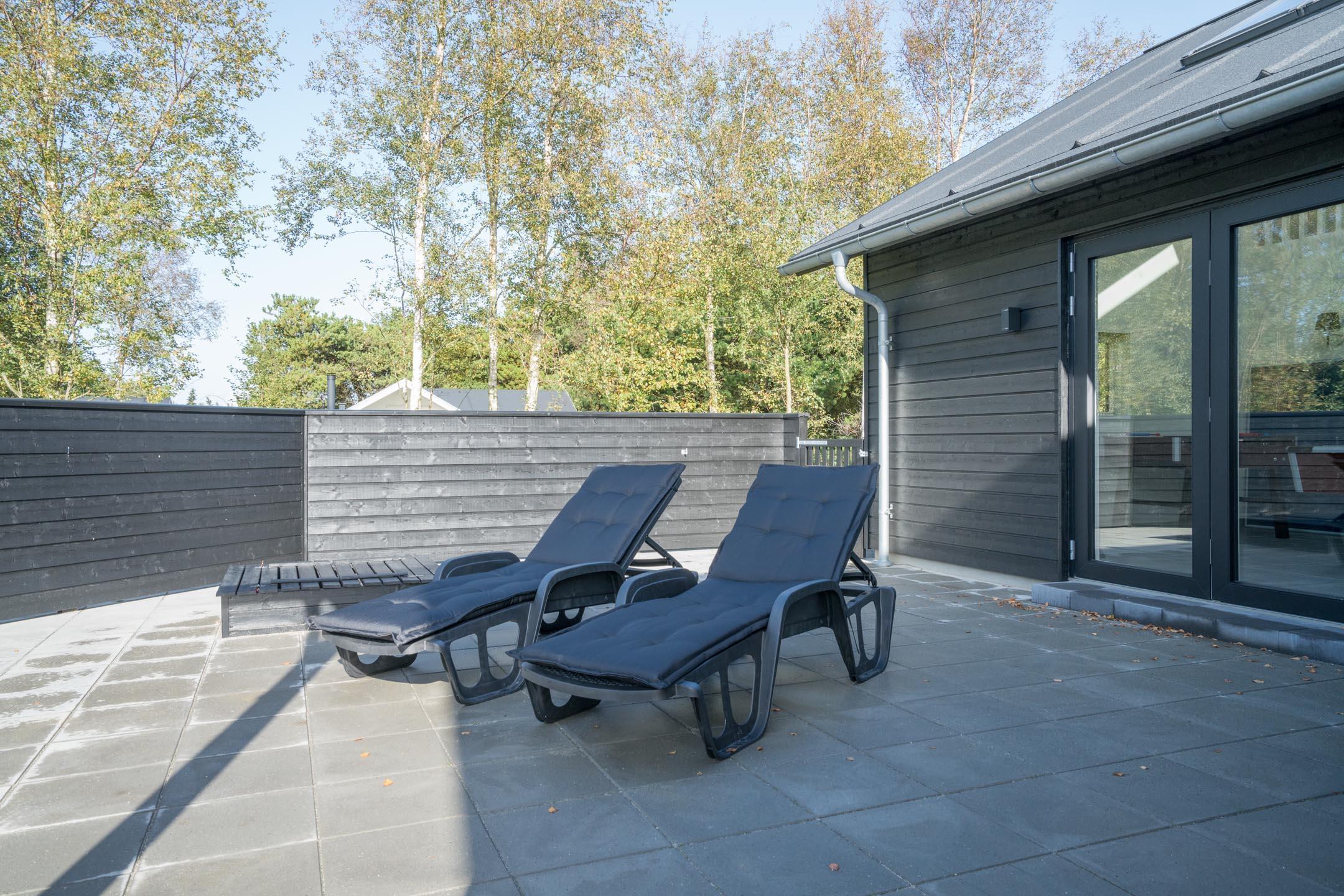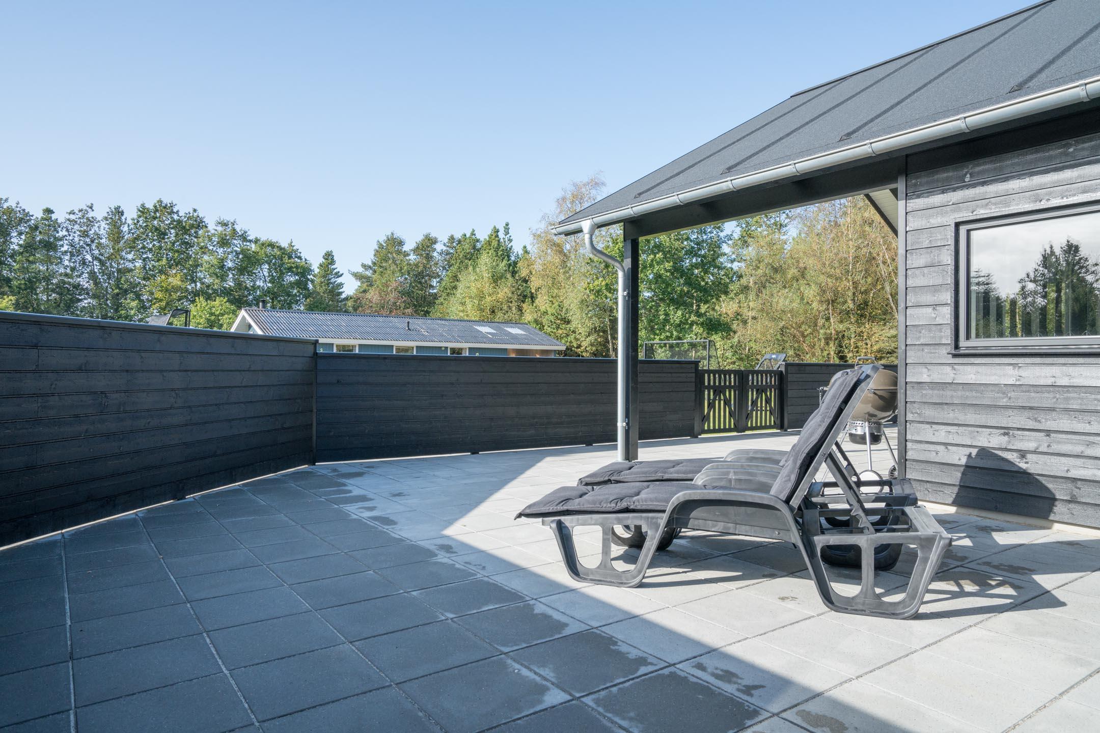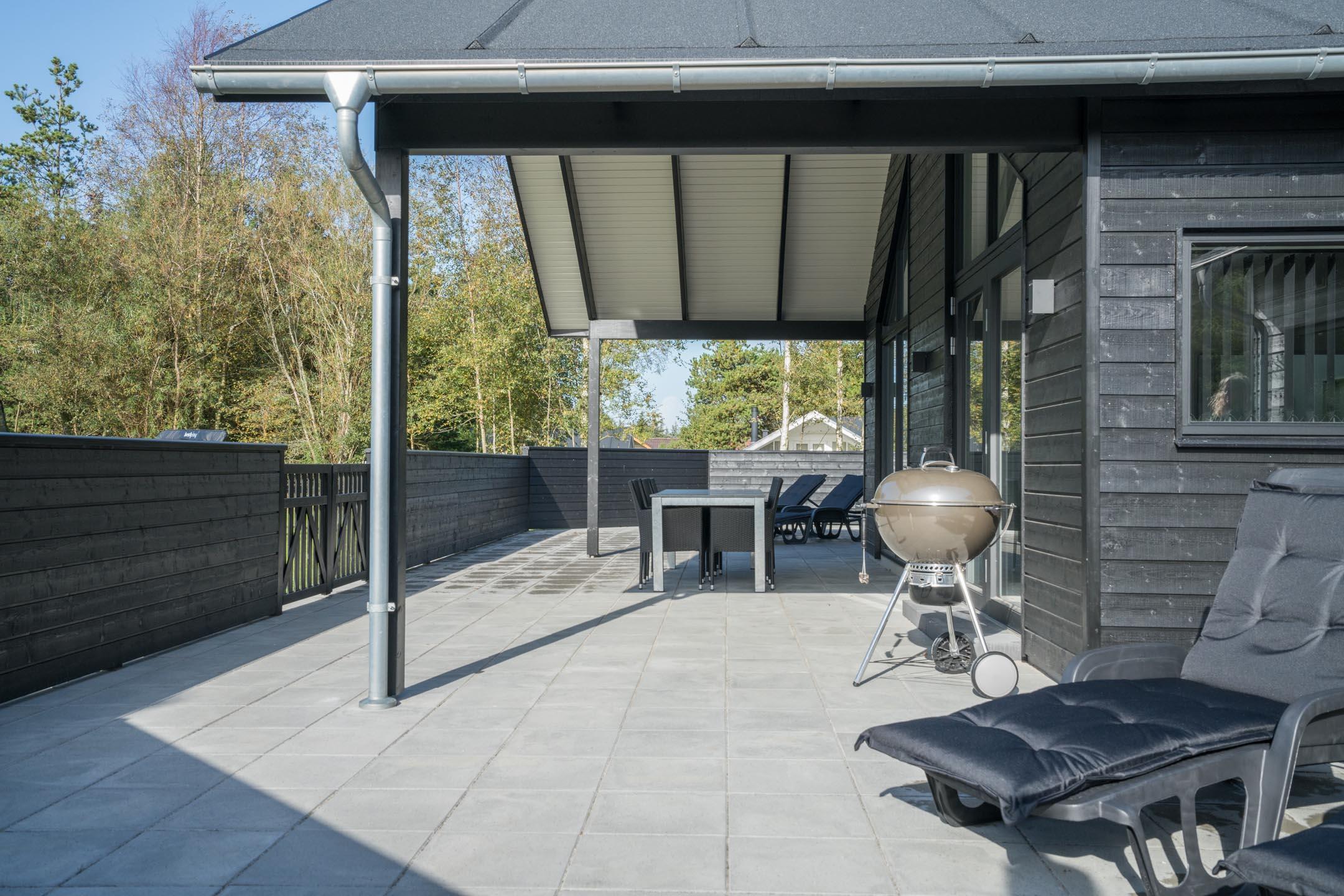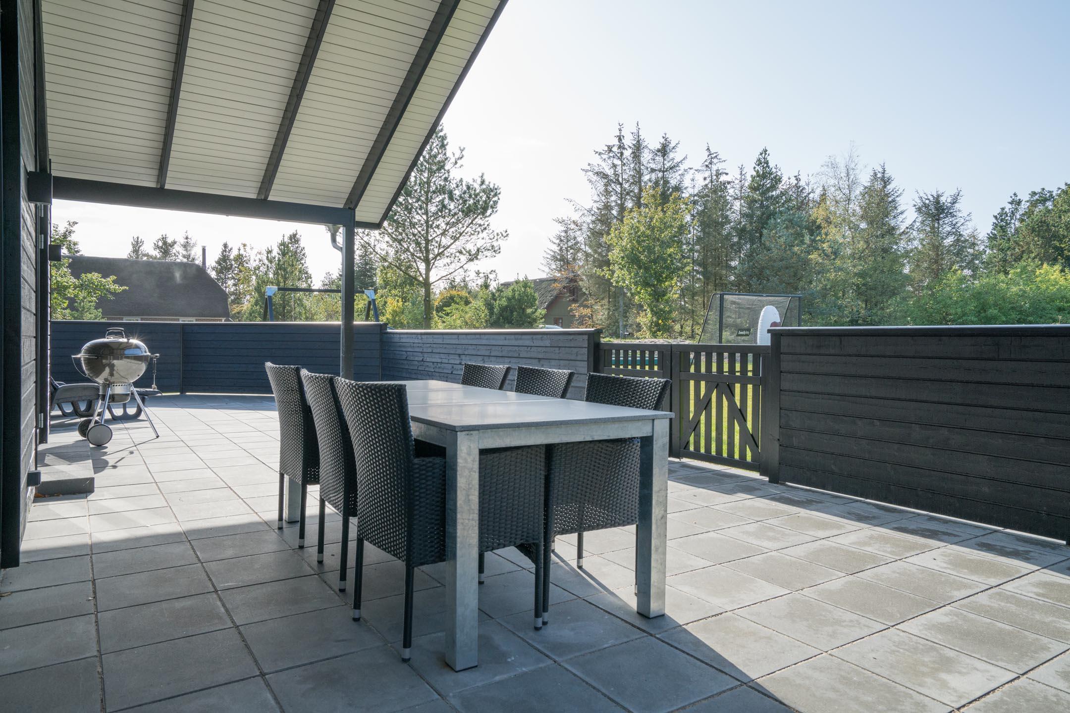 Stor indhegnet terrasse på ca. 70m2 - 3 udgange, hvor børn og hund kan holdes inde. En del af terrassen (ca 20 m2) er overdækket og medvirkende til at forlænge sommeren. På den dejlige grund er der fodboldmål, sandkasse, petanque bane og gynger samt trampolin, som indbyder til leg og boldspil. Huset udlejes kun til familier - ingen udlejning til grupper. Separat og aflåst skur til lejer - og med ekstra køleskab. Et helt igennem gennemført hus !