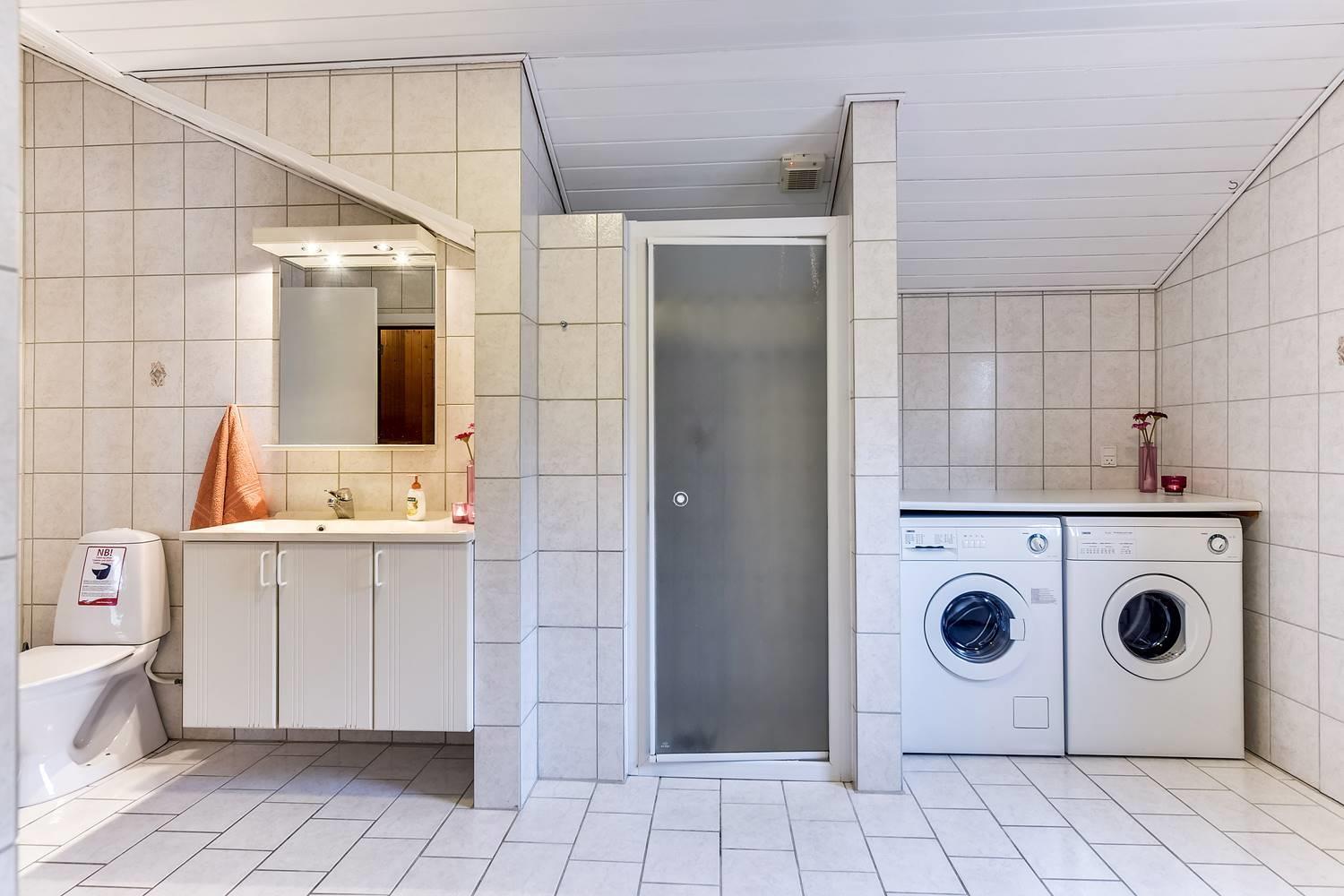 Badeværelset byder på både gulvvarme, bruseniche, 2-personers spabad og adgang til husets sauna – ideelt til ren afslapning. Der er også vaskemaskine og tørretumbler. Køkkenet har alt, hvad du skal bruge: keramisk komfur, opvaskemaskine, mikroovn og god bordplads. Det ligger i åben forbindelse med opholdsstuen.