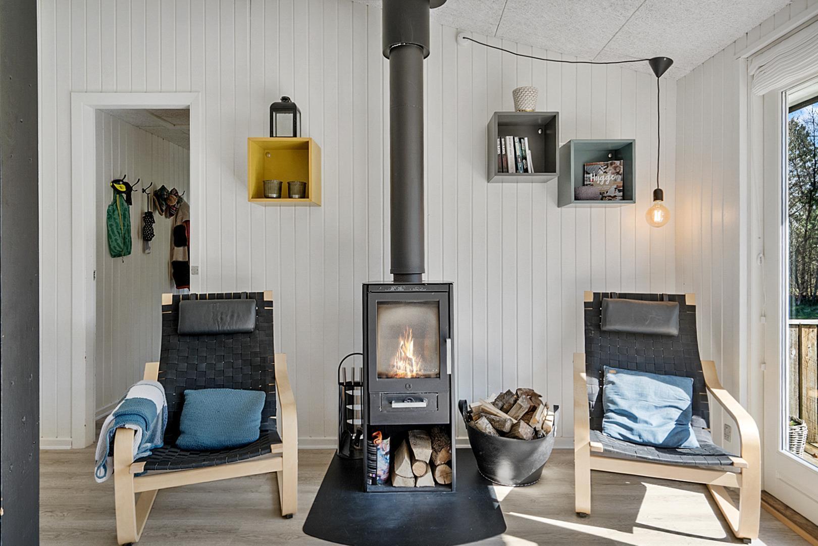 Brændeovnen kan udover hygge, sørge for en god varmekilde - måske sammen med den energisparende og miljøvenlige varmepumpe. Nyt badeværelse fra 2023.