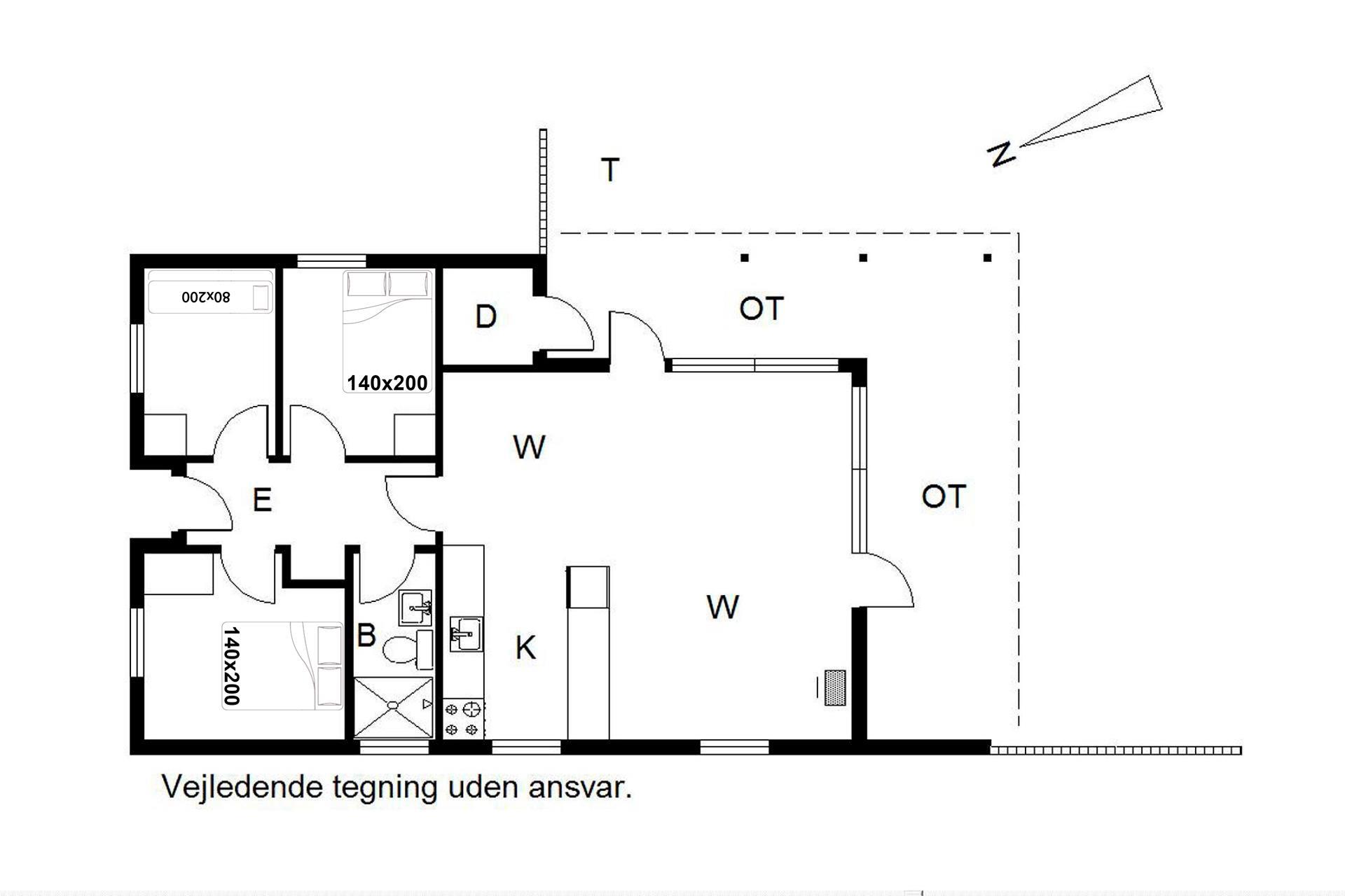Sengestørrelse: 2 dobbeltsenge 140 x 200 cm + 1 køjeseng 80 x 200 cm.