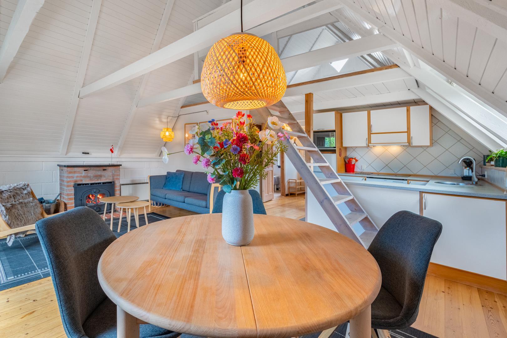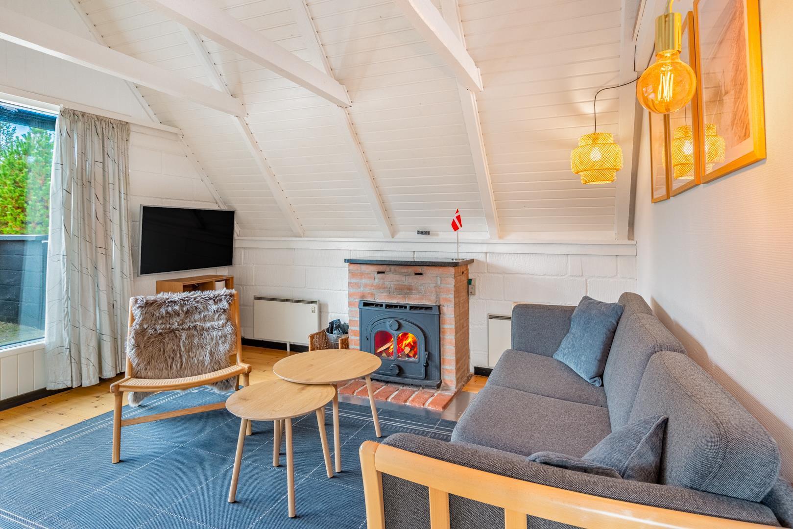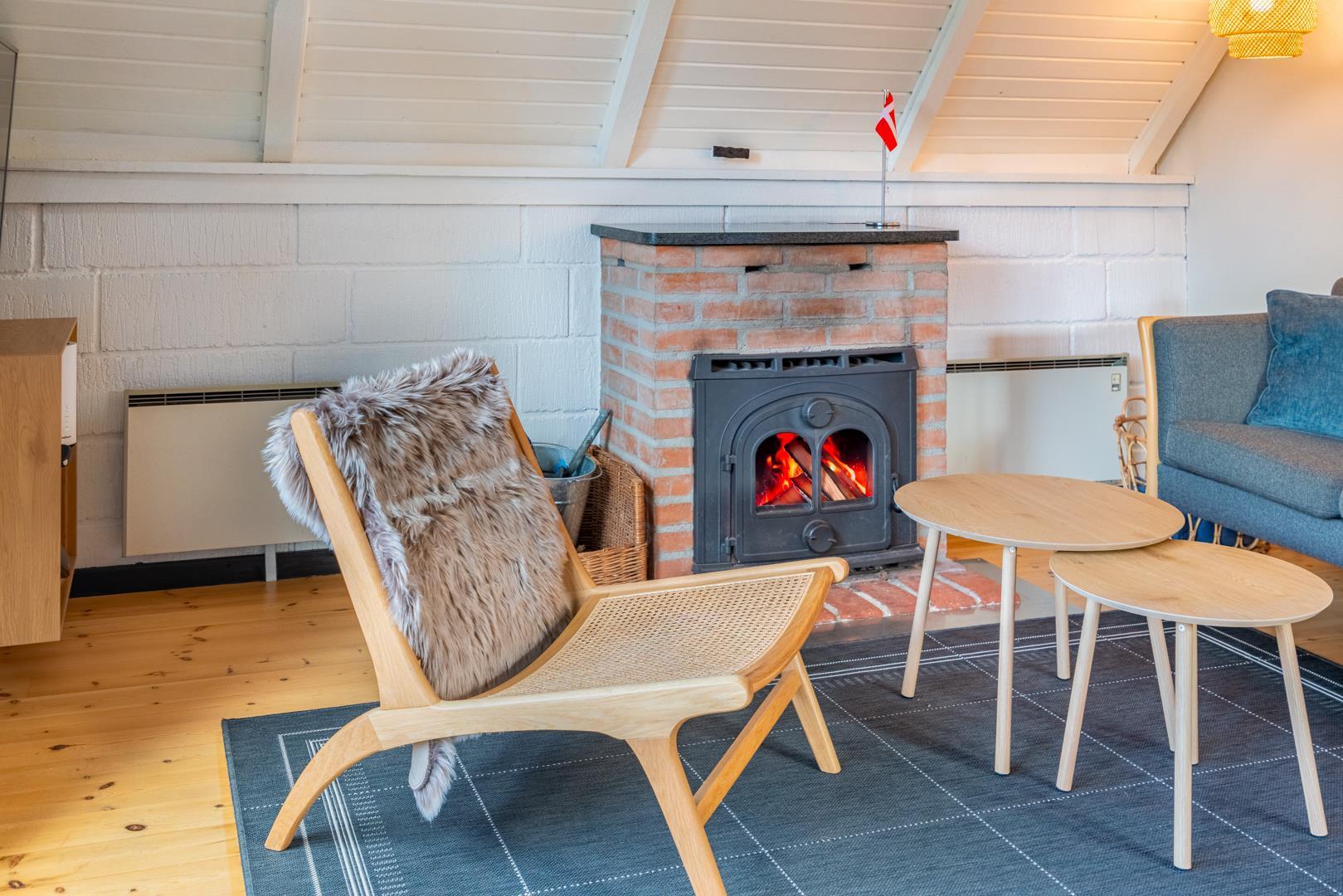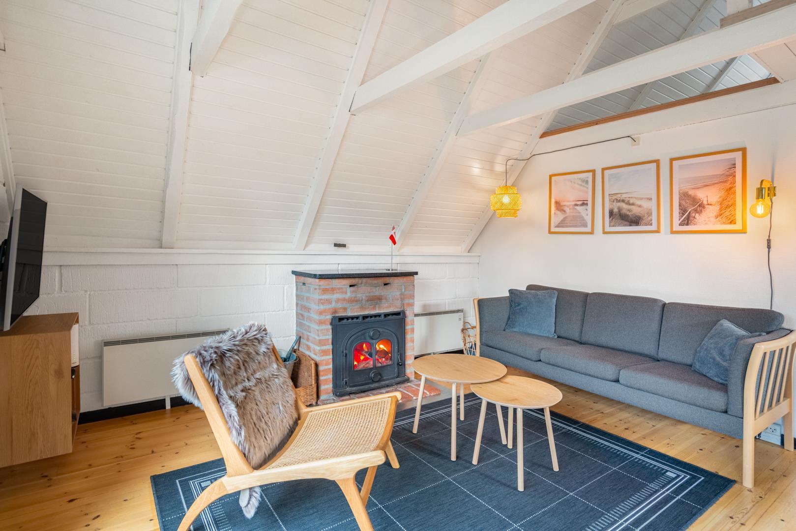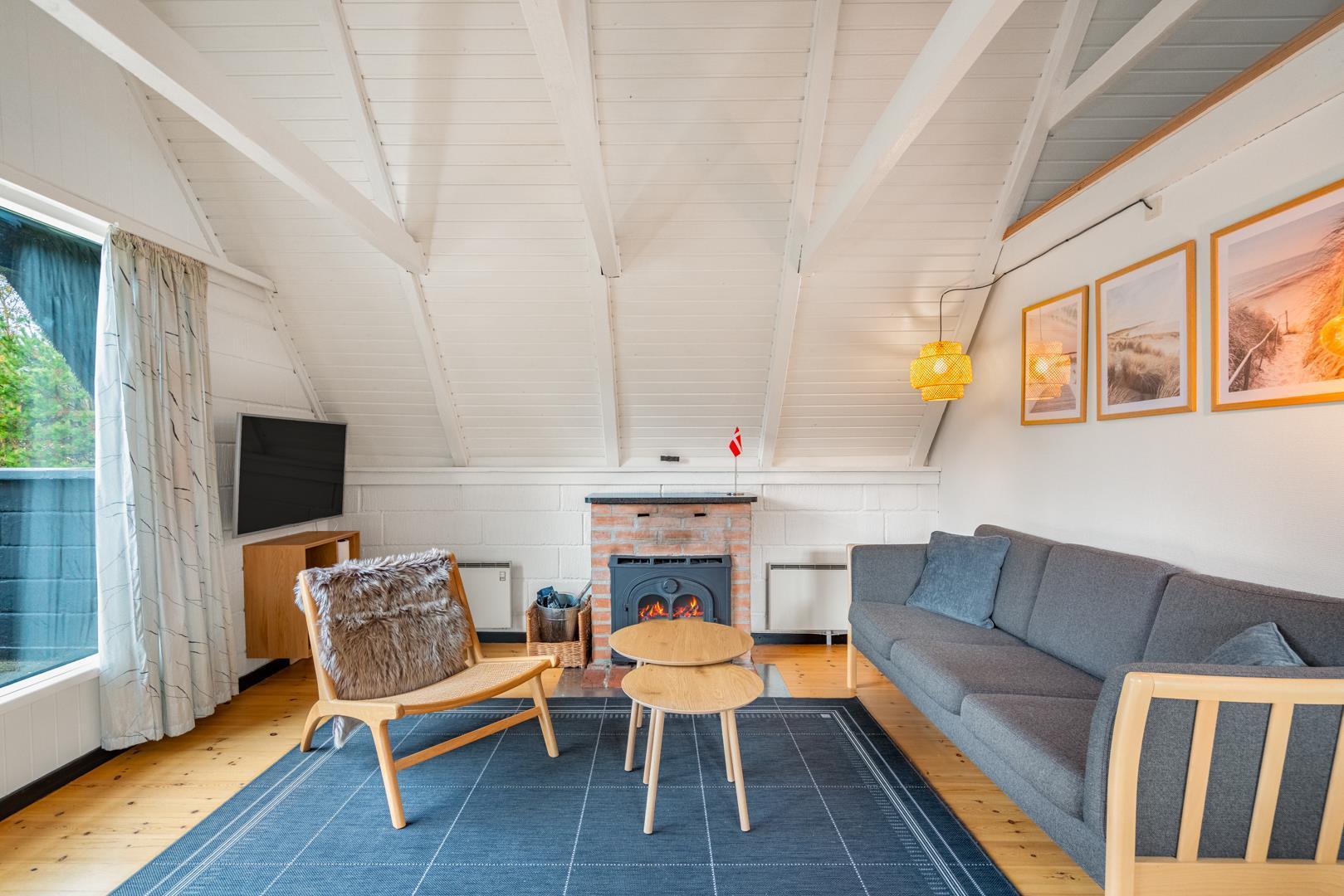 Loftet er åbnet til kip, og de sortmalede træbjælker tilfører en helt speciel "hytte-stemning" til huset. I det hyggelige sofahjørne i stuen finder I også brændeovnen, som vil fylde rummet med varme på en kold vinterdag.